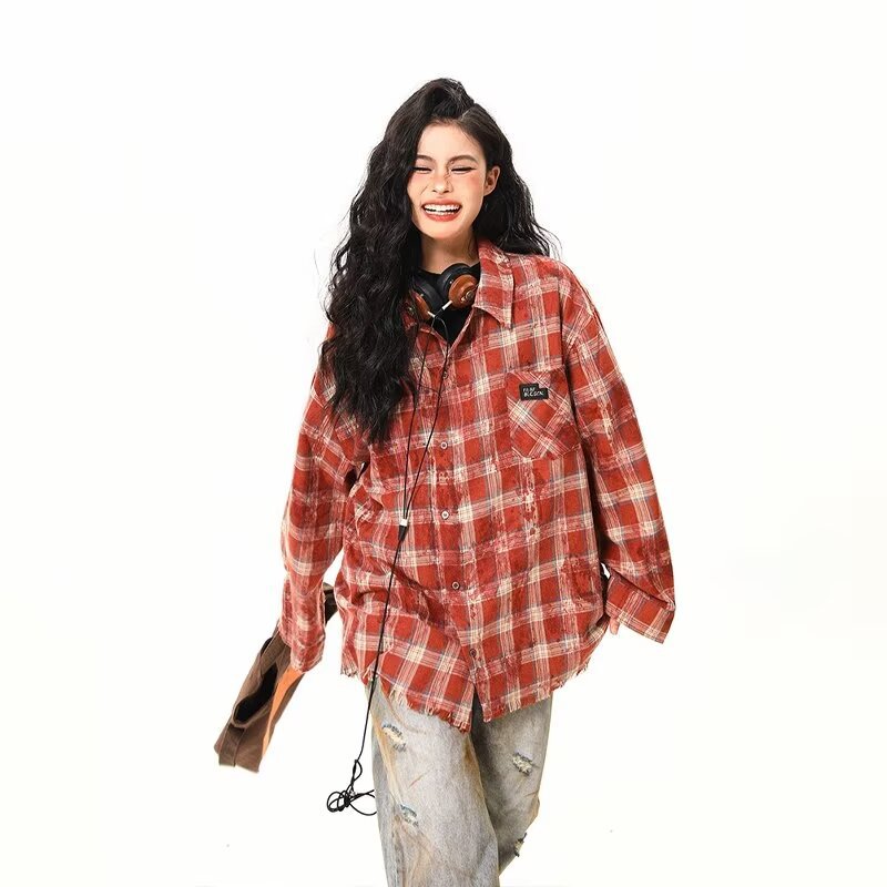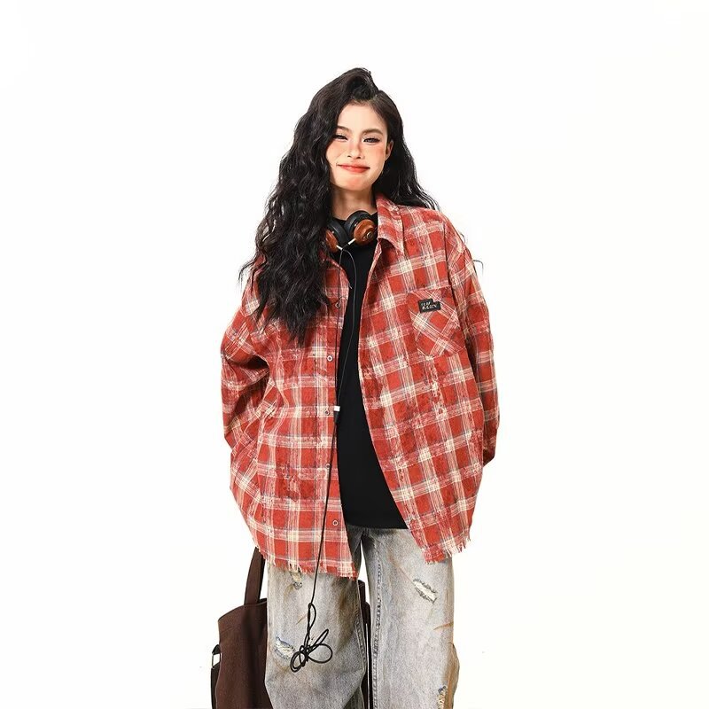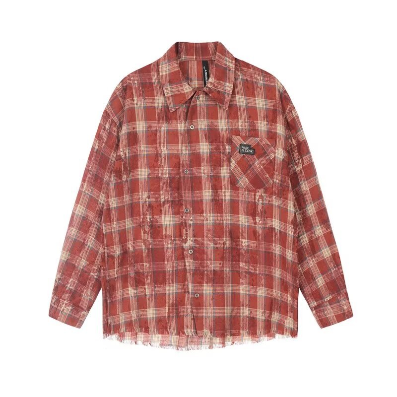 아메리칸 스타일 스트리트 체크 타이 다이 셔츠 재킷 남자 봄 새로운 느슨한 술 러프 체크 무늬 셔츠 트렌디