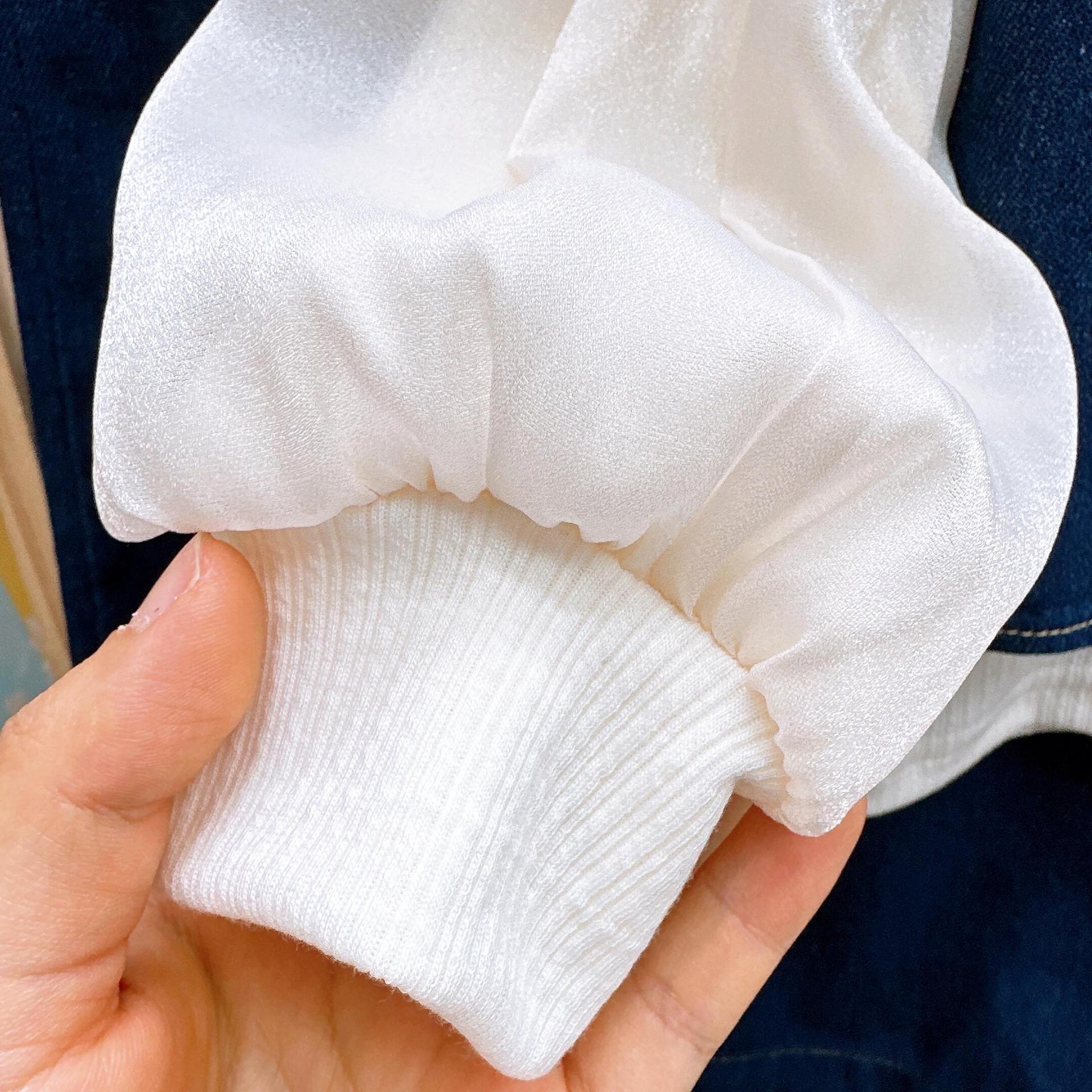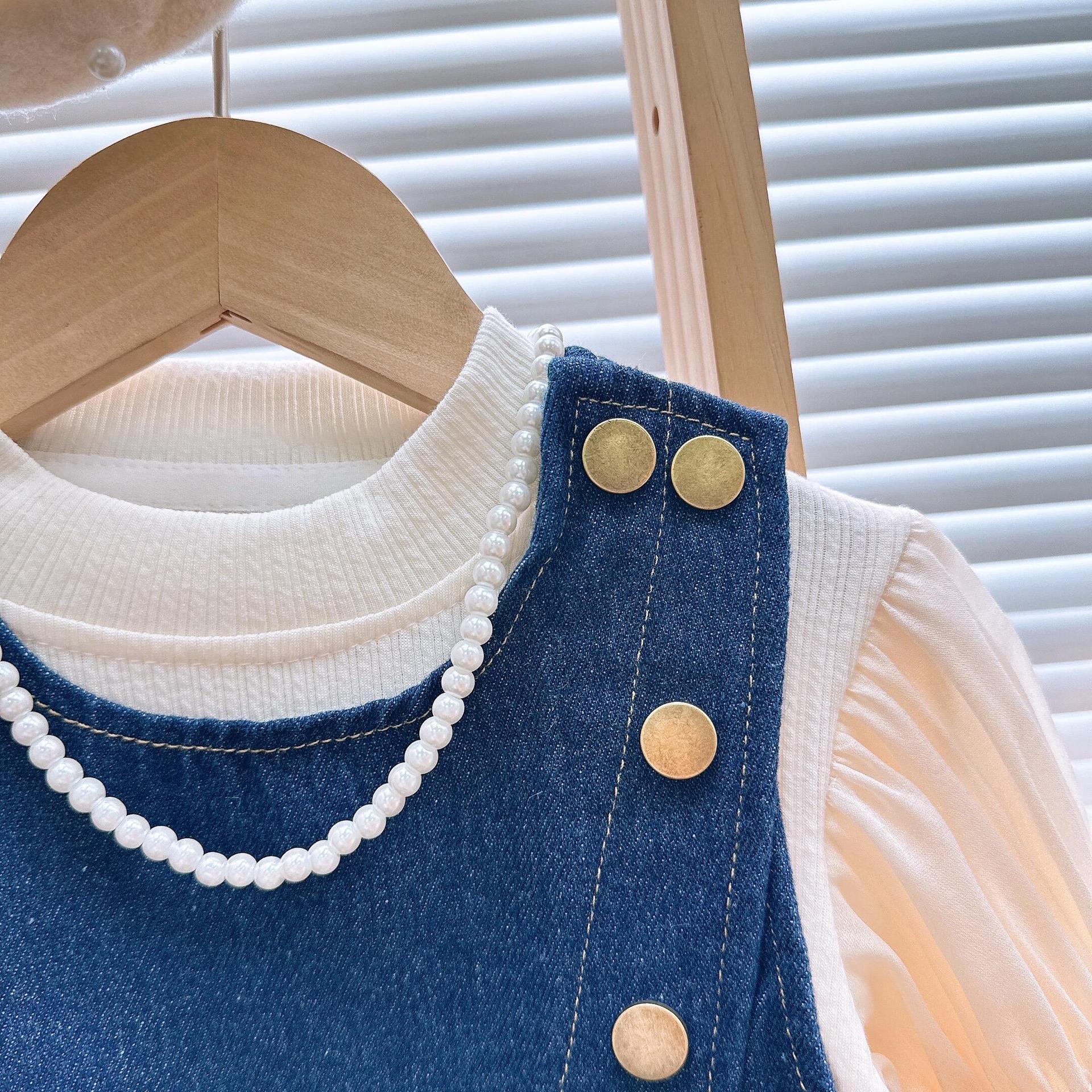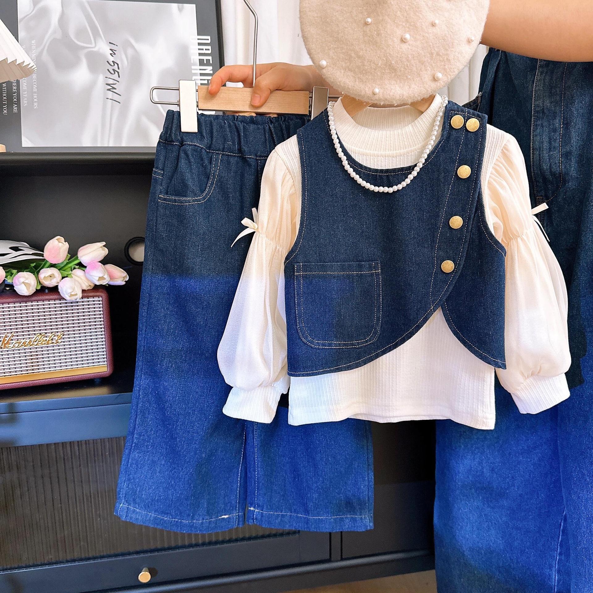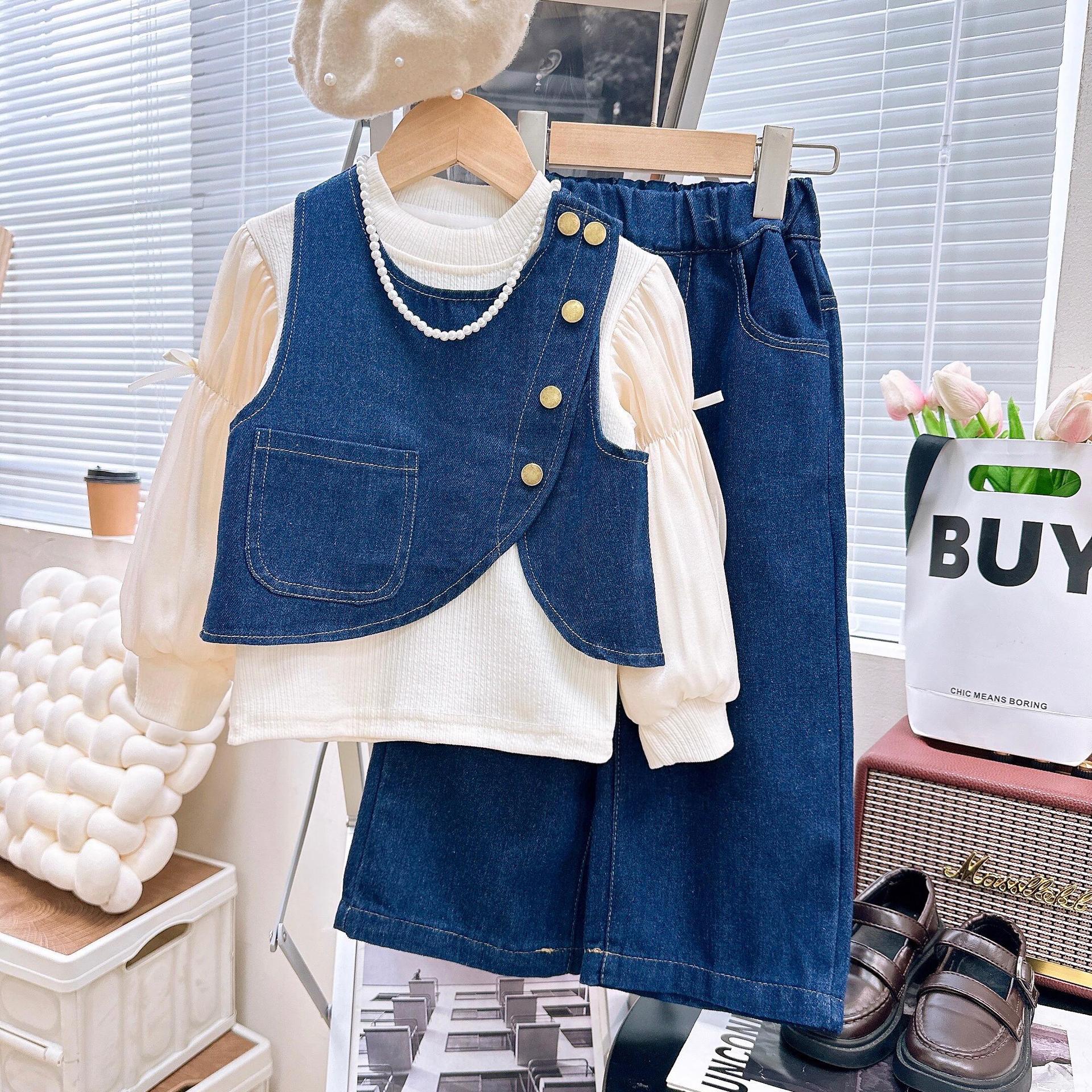 24091 소녀 봄과 가을 새로운 아동복 여성 보물 패션 바닥 셔츠와 데님 조끼 스트레이트 팬츠 3 피스 세트