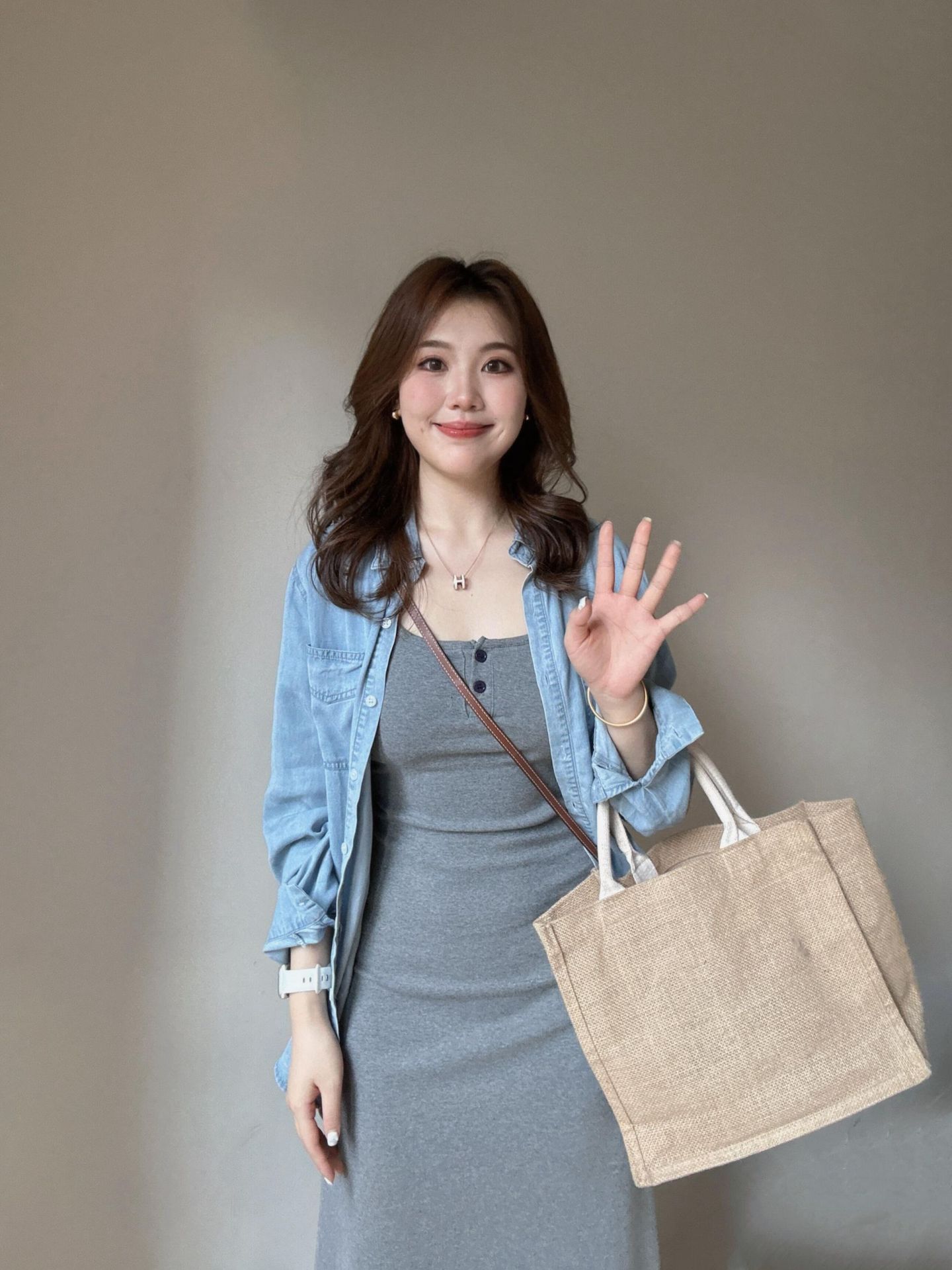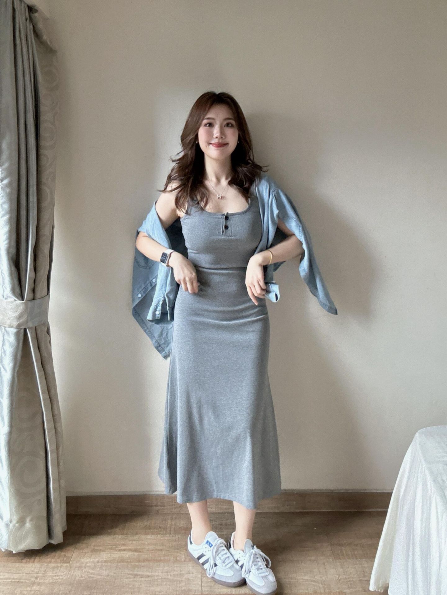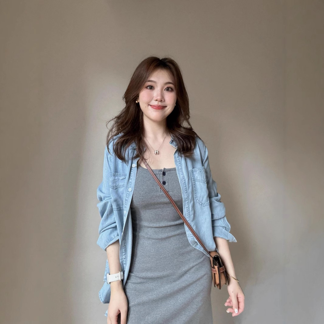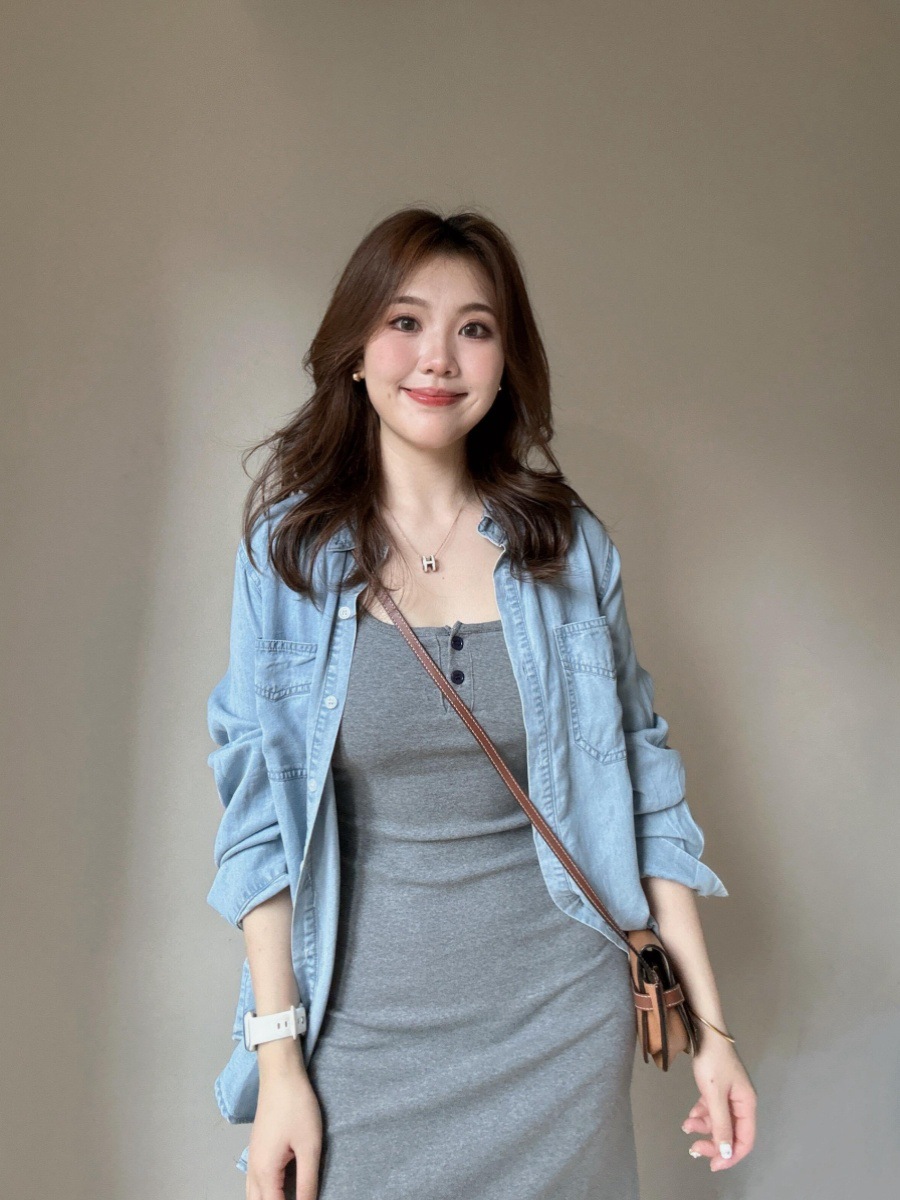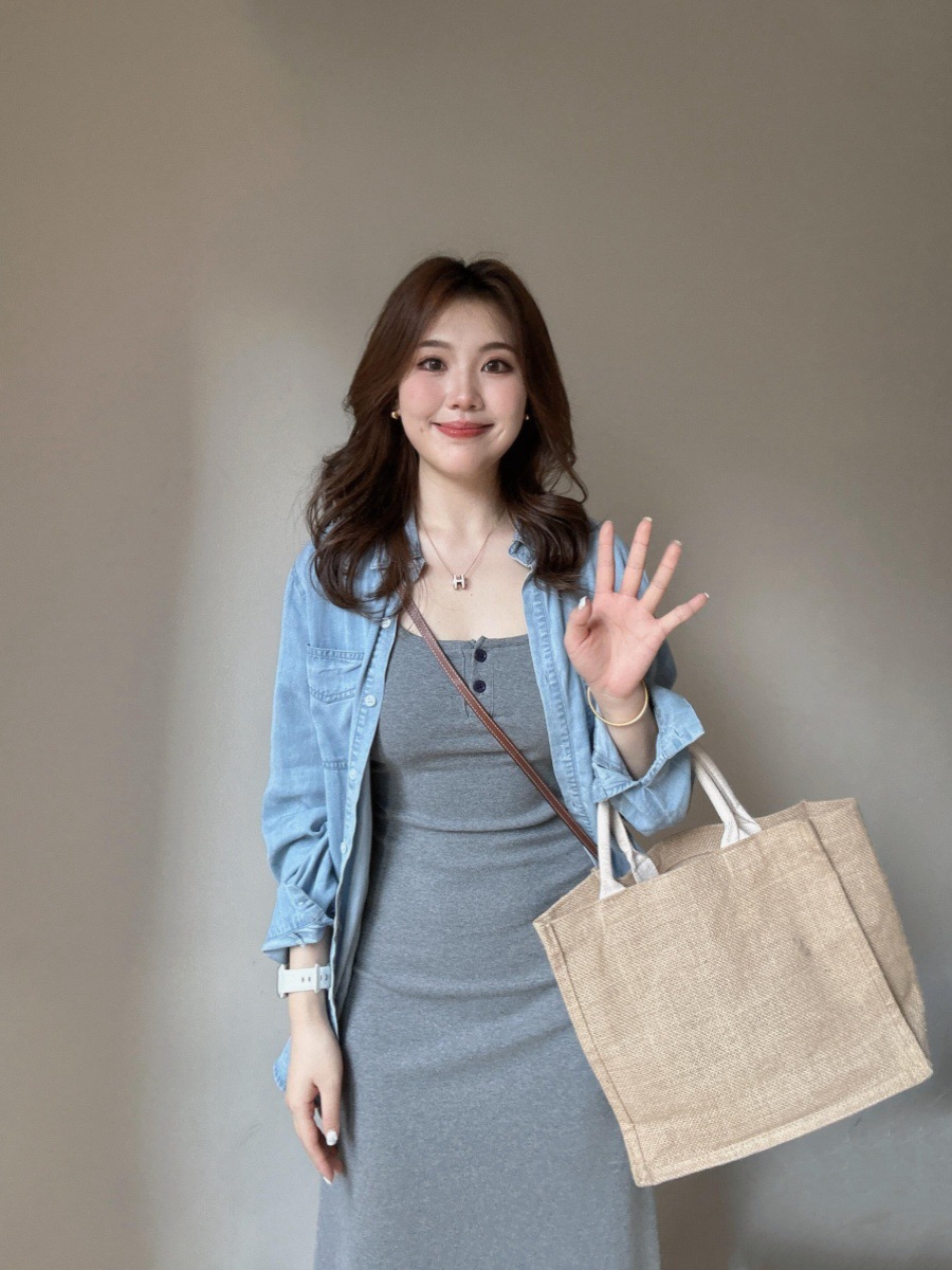 여성용 한국 고급 그레이 서스펜더 드레스 2025 신상 초가을 의상, 롱 스커트 세트 포함스토어 가기