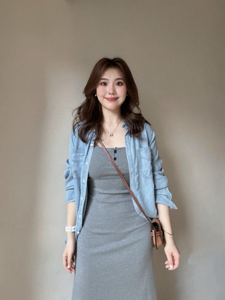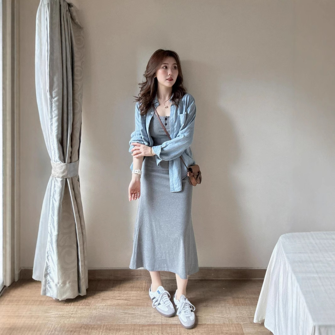 여성용 한국 고급 그레이 서스펜더 드레스 2025 신상 초가을 의상, 롱 스커트 세트 포함
