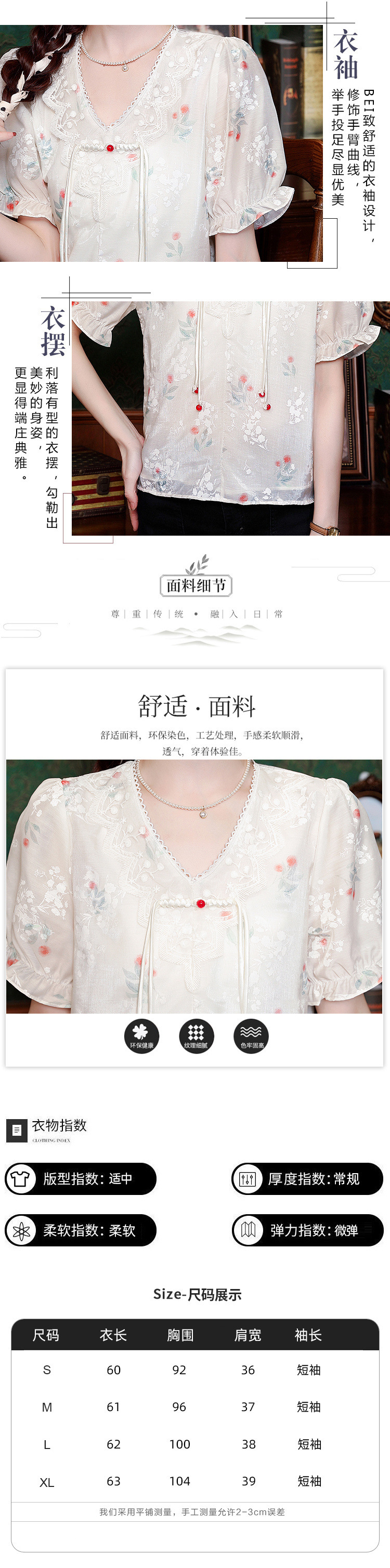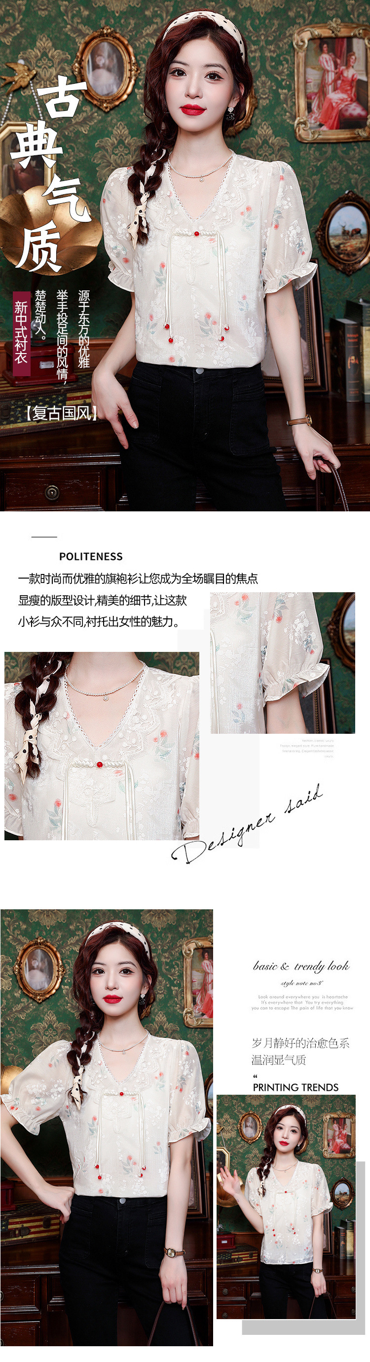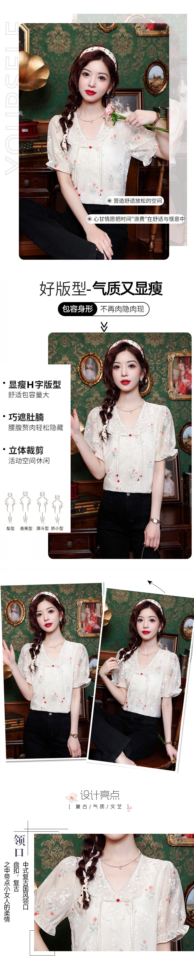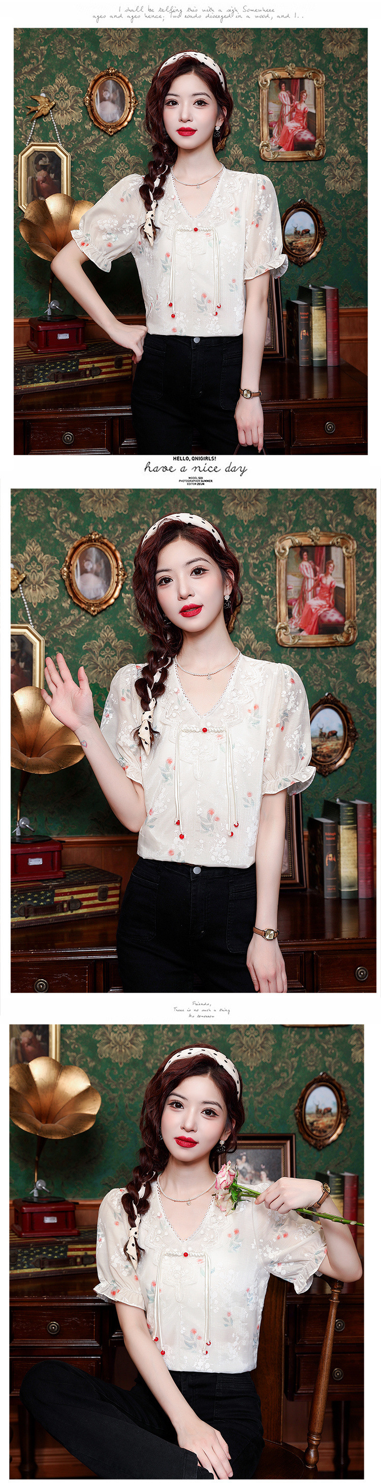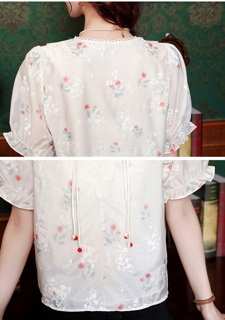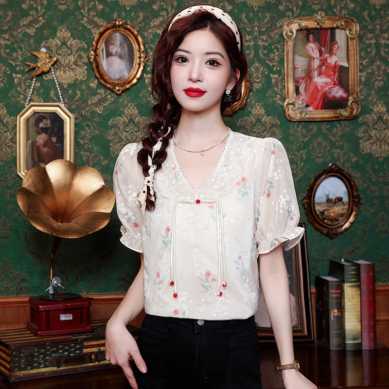 리얼 샷 여름 2024 새로운 느슨한 버클 달콤한 자수 V-Neck 쉬폰 셔츠 반팔 풀오버 탑