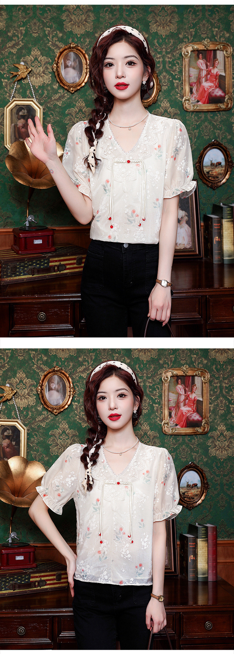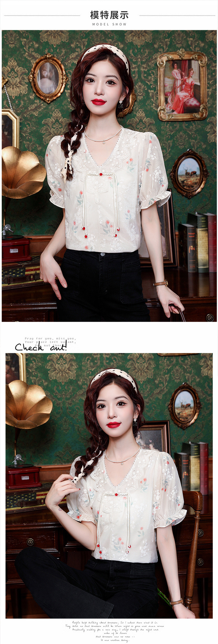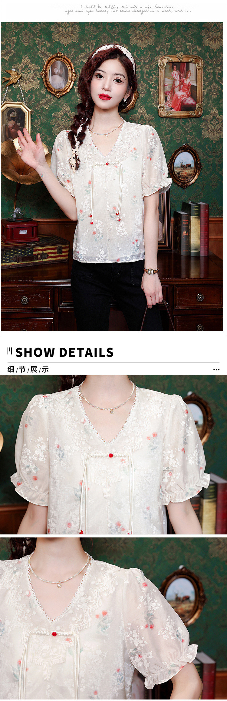 리얼 샷 여름 2024 새로운 느슨한 버클 달콤한 자수 V-Neck 쉬폰 셔츠 반팔 풀오버 탑스토어 가기