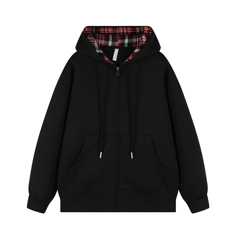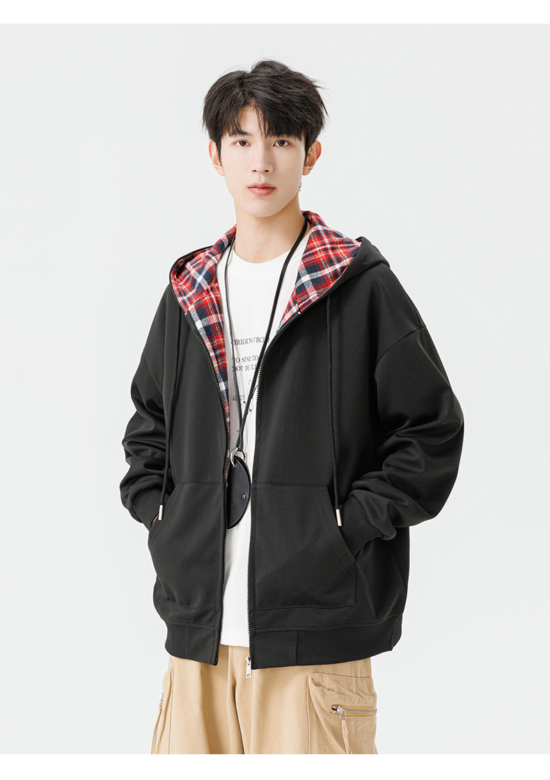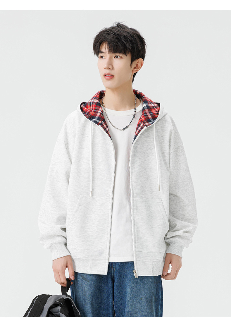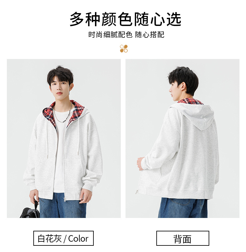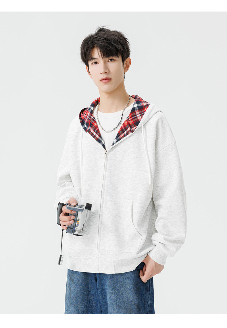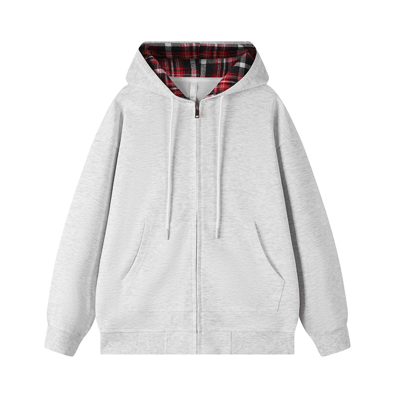 미국 격자 무늬 카디건 스웨터 남자의 봄과 가을 새로운 느슨한 후드 탑 커플의 유행 브랜드 지퍼 재킷