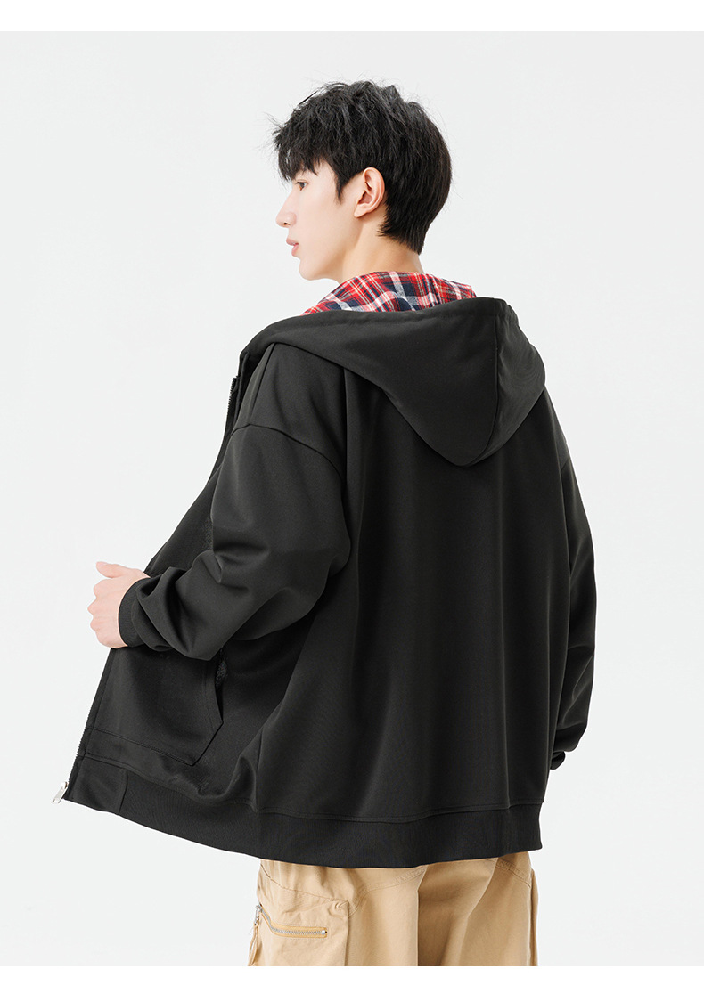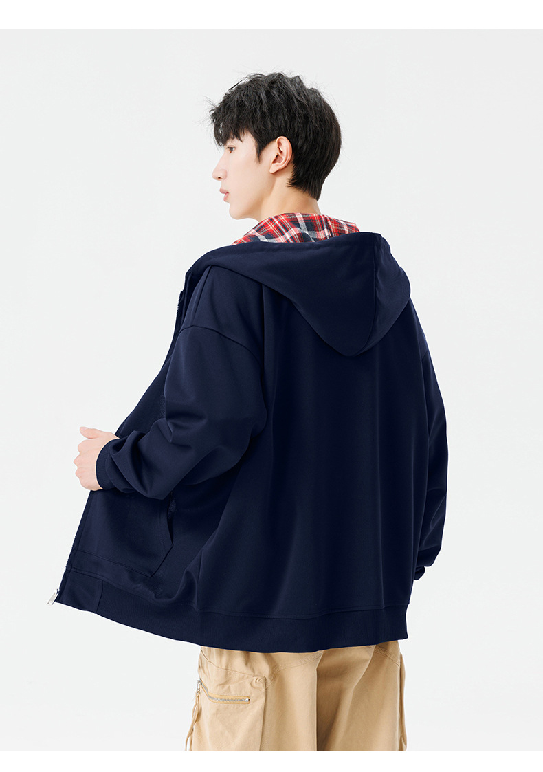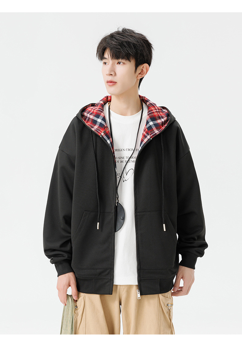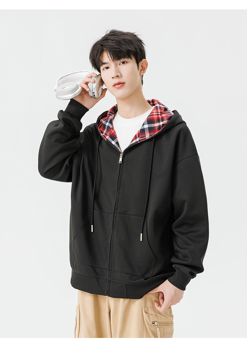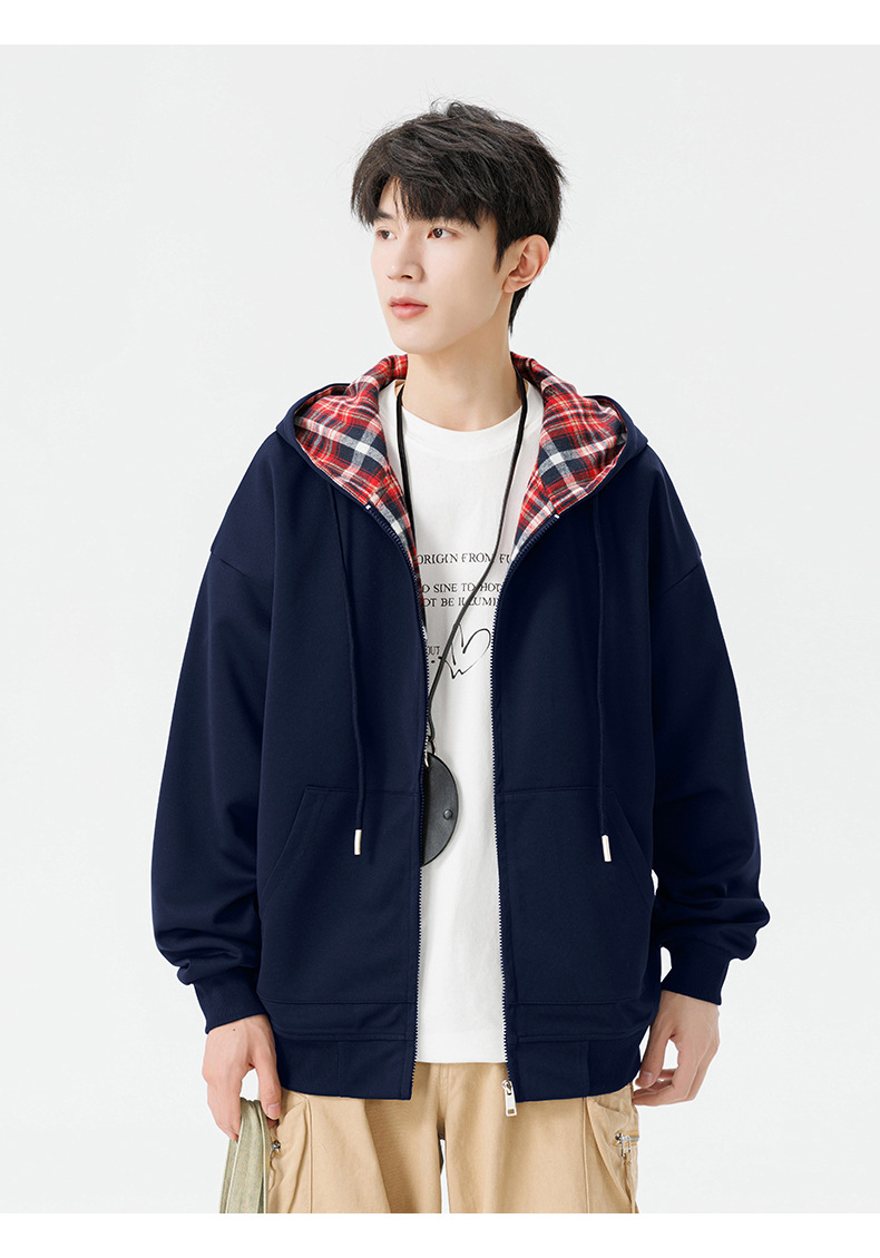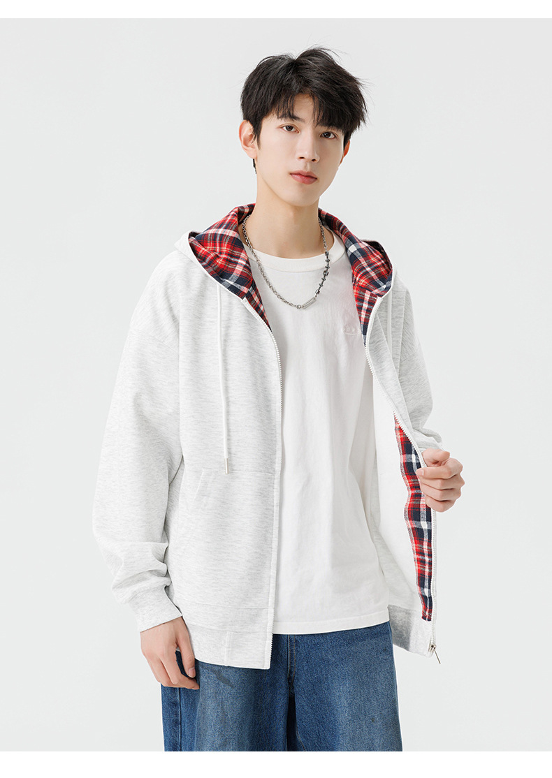 미국 격자 무늬 카디건 스웨터 남자의 봄과 가을 새로운 느슨한 후드 탑 커플의 유행 브랜드 지퍼 재킷