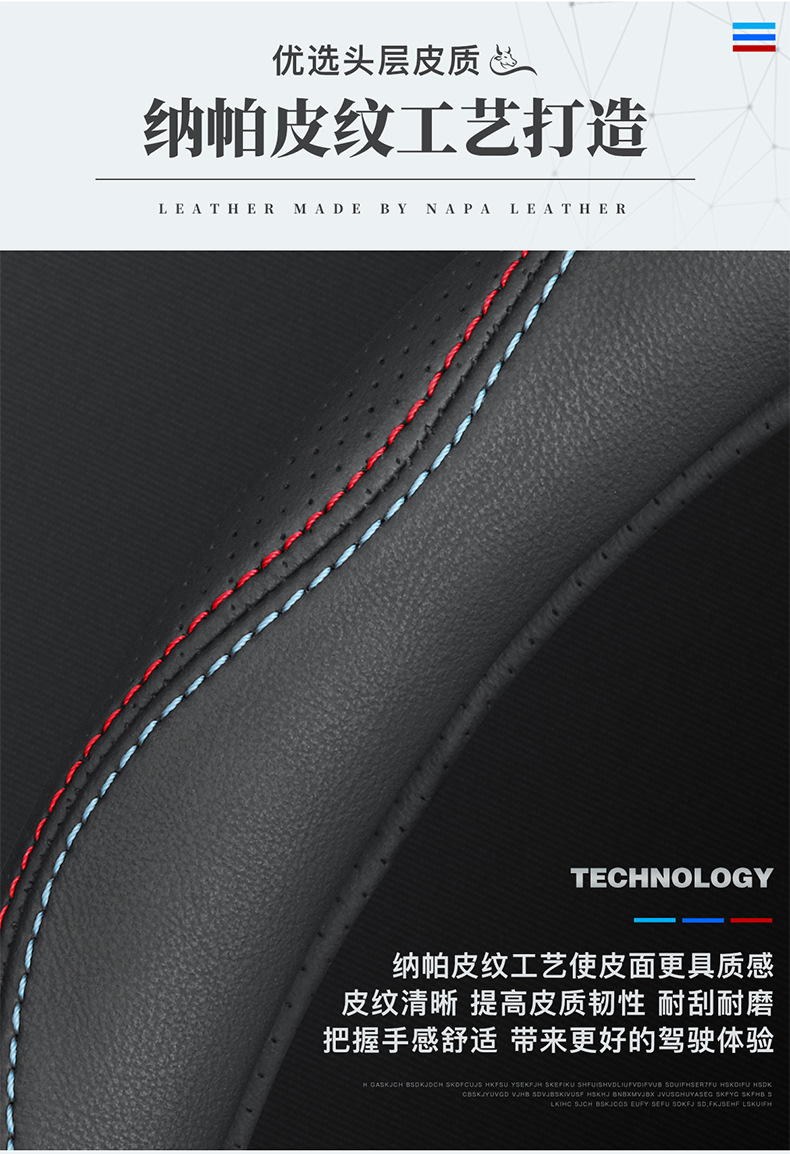 • 소가죽 전체, 둥근 모양, 빨간색과 파란색 실, 3색 표시 + 자동차 로고