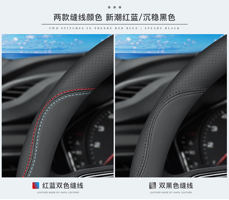• 전체 소가죽 D자형 빨간색과 파란색 실에 자동차 로고가 있음