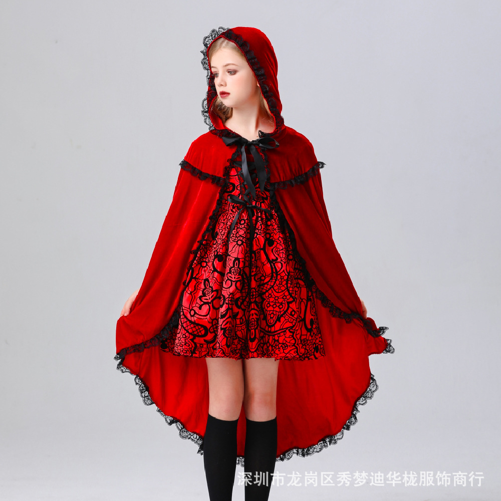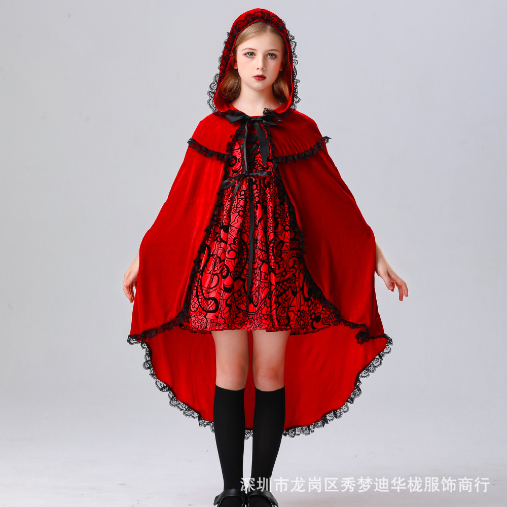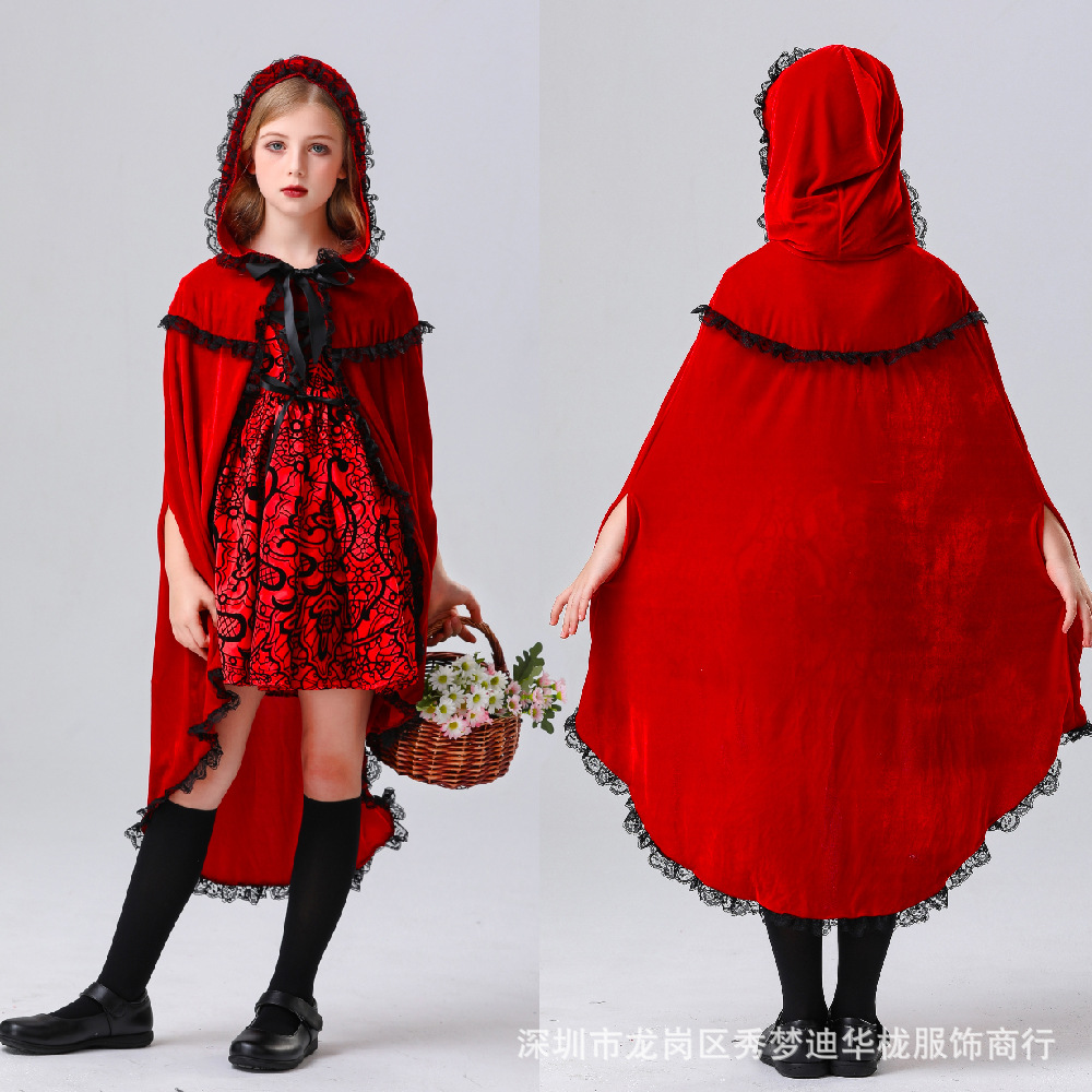 2024 새로운 할로윈 어린이 코스프레 작은 빨간 승마 후드 의상 6 월 1 일 어린이 날 무대 의상 리얼 샷