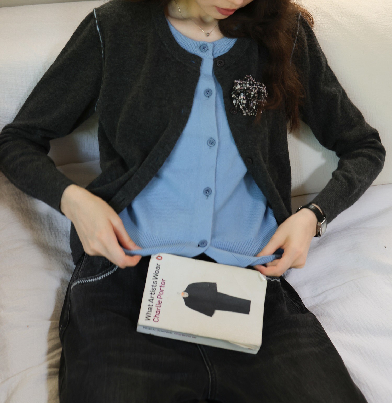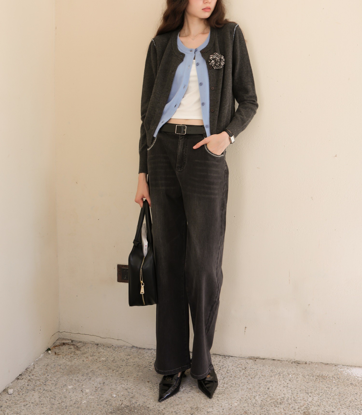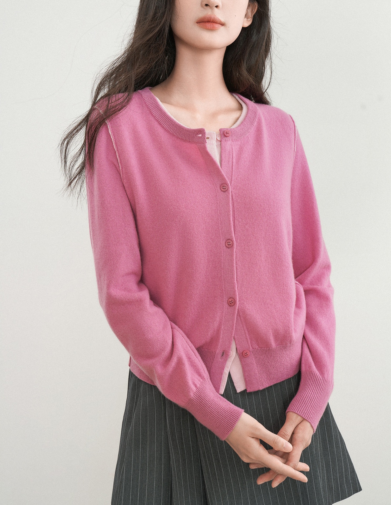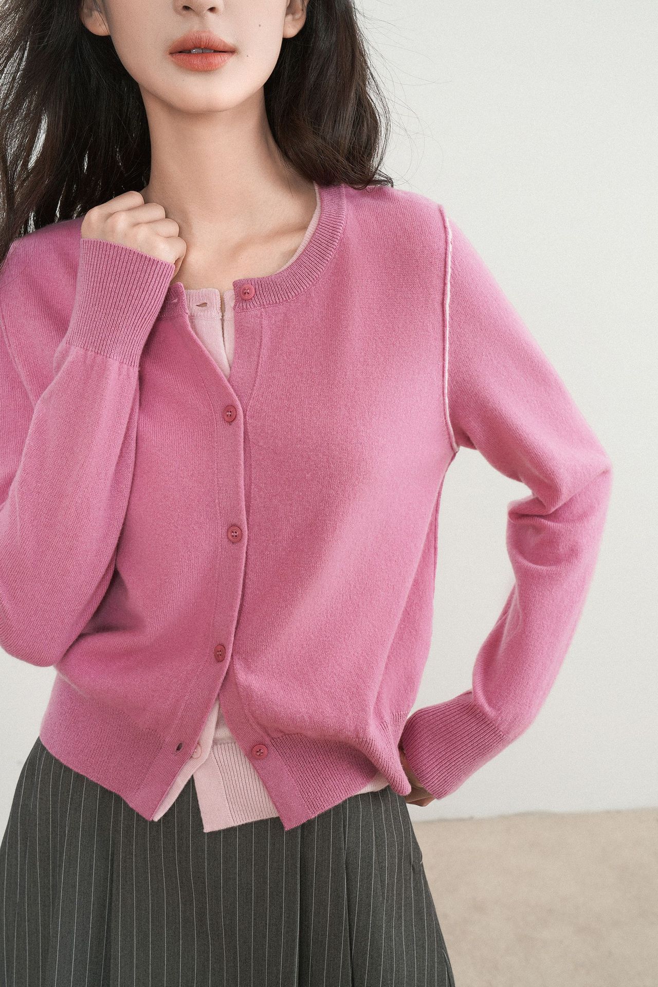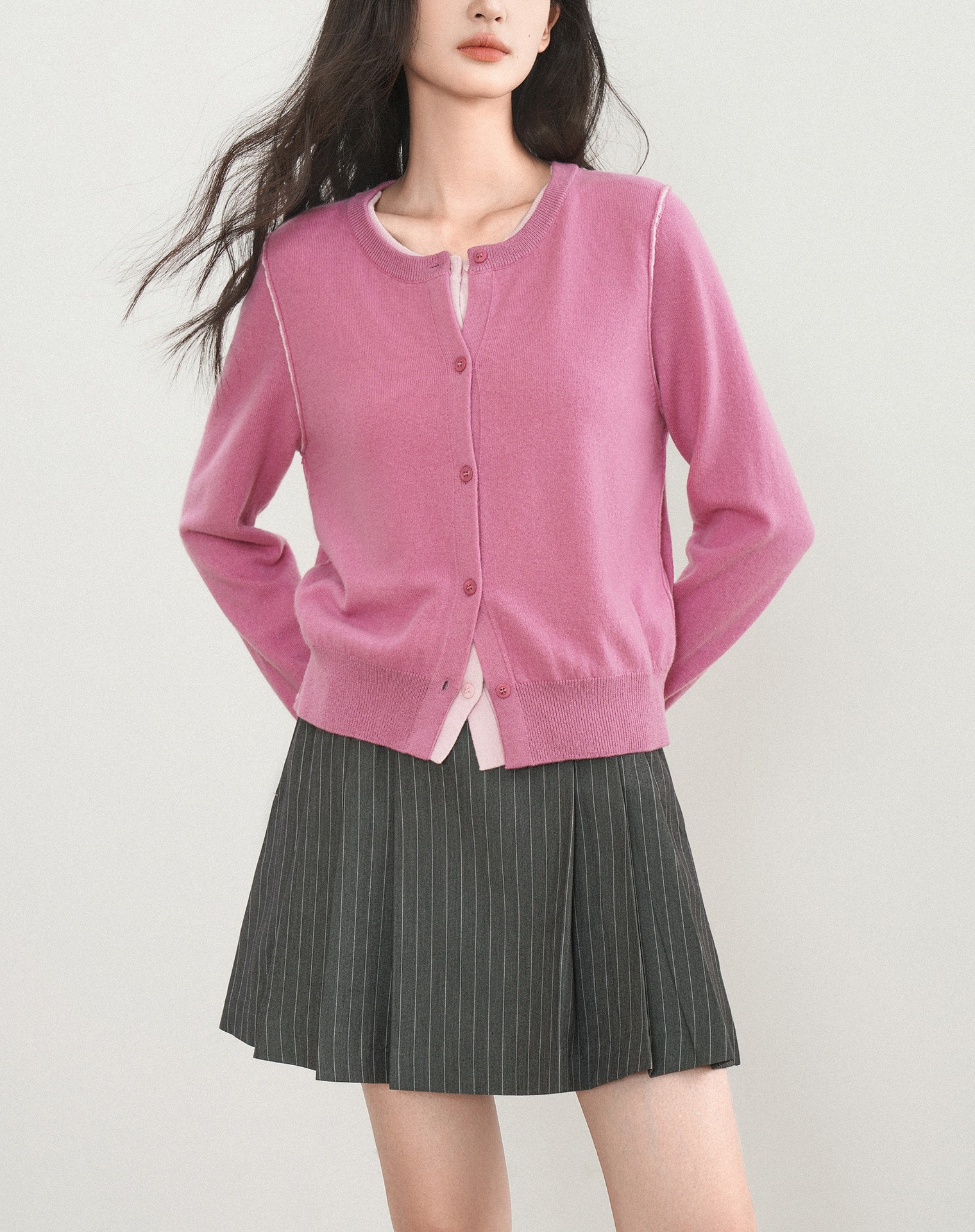 지식인 미우 바람 가짜 투피스 울 니트 카디건 여성의 가을과 겨울 고급 핑크 탑스토어 가기