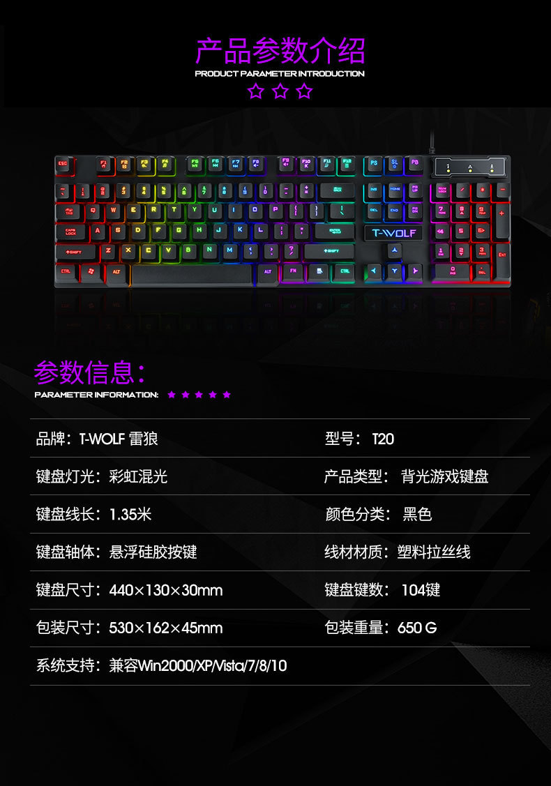 국경 도매 Thunderwolf T20 빛나는 RGB 게임 키보드 스페인어 서스펜션 러시아 USB 유선 키보드스토어 가기
