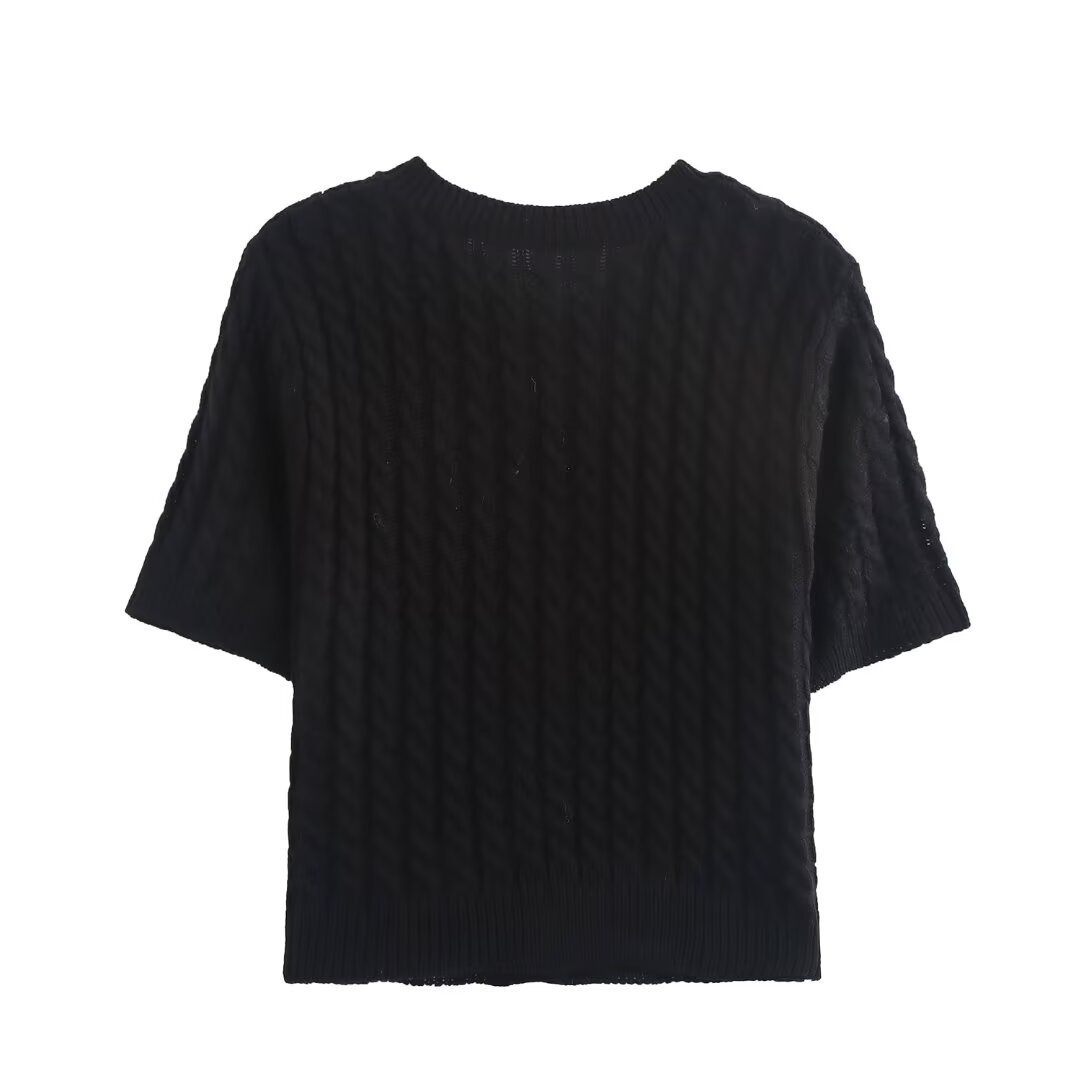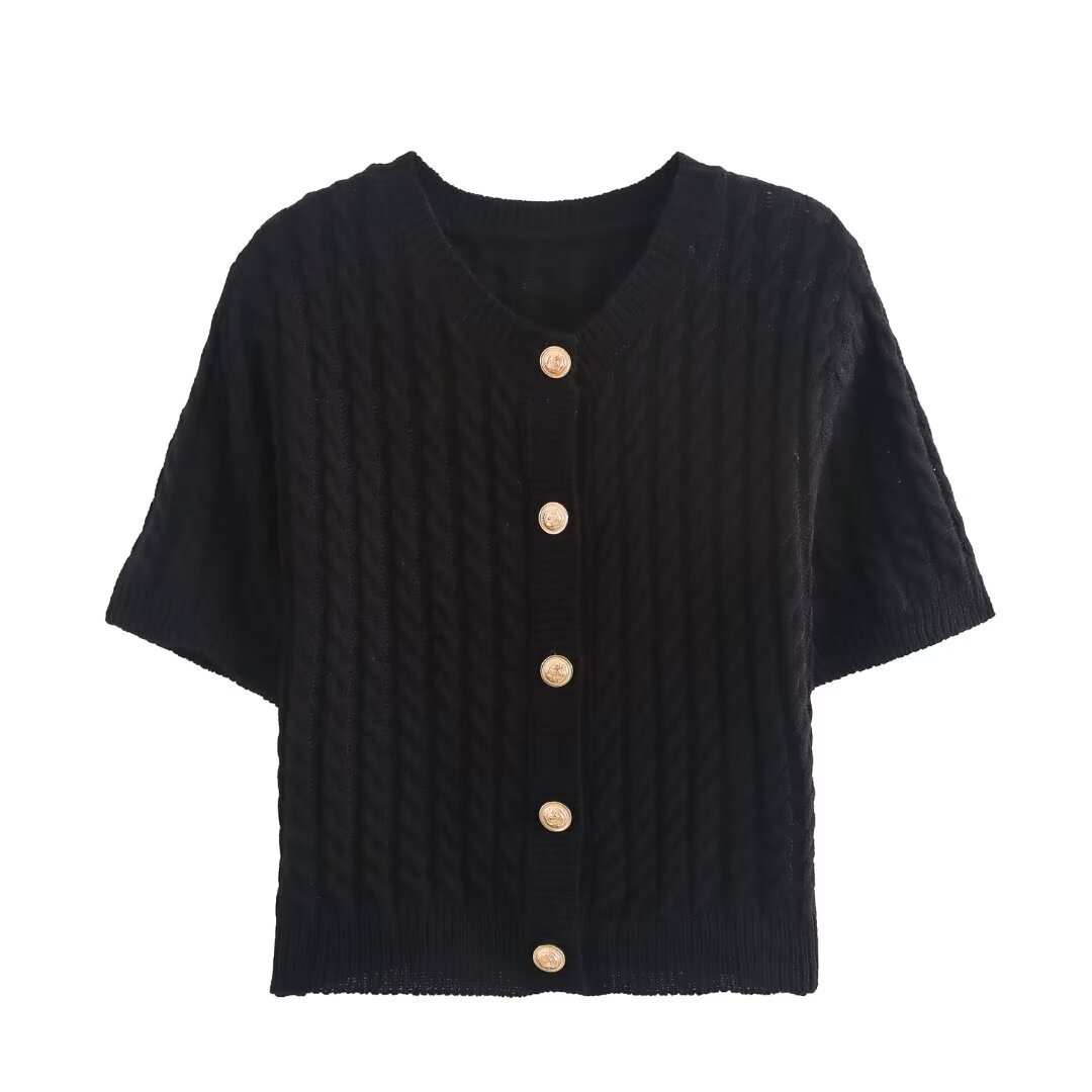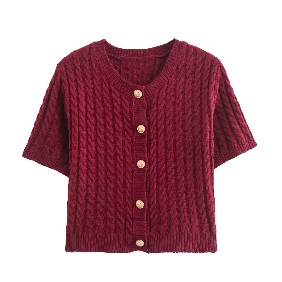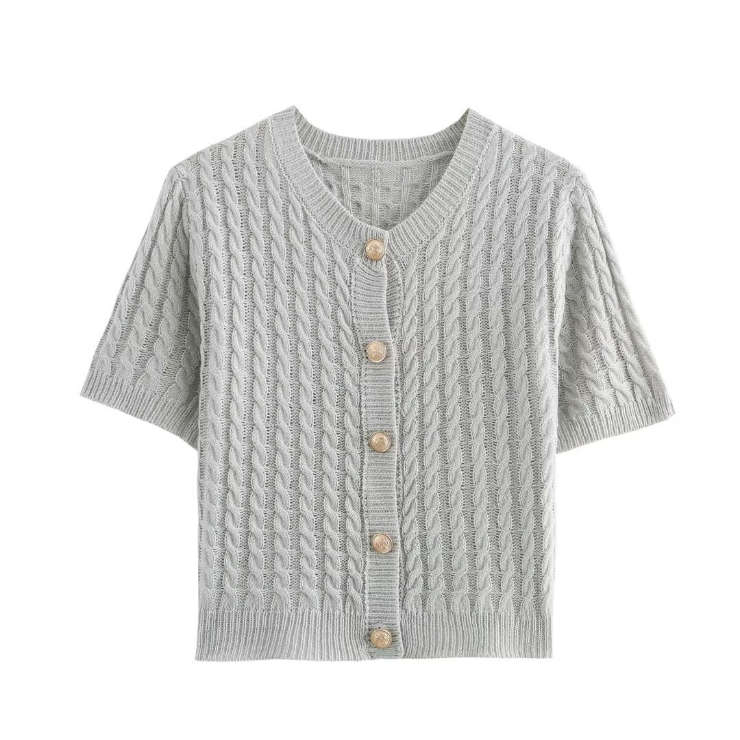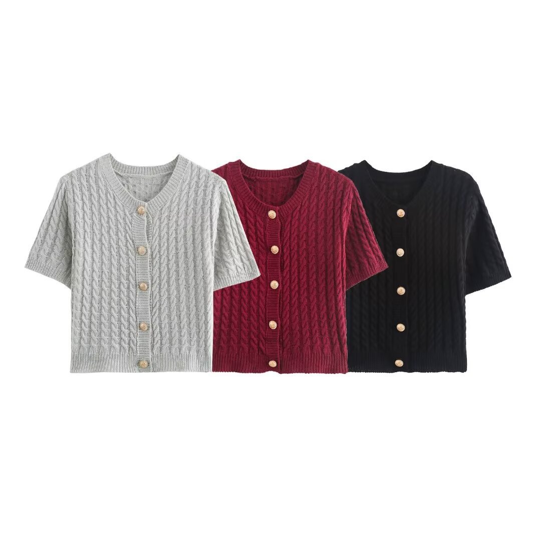 아마존 도매 가을 새로운 여성 올 매치 솔리드 컬러 V 넥 싱글 브레스트 반소매 니트 스웨터