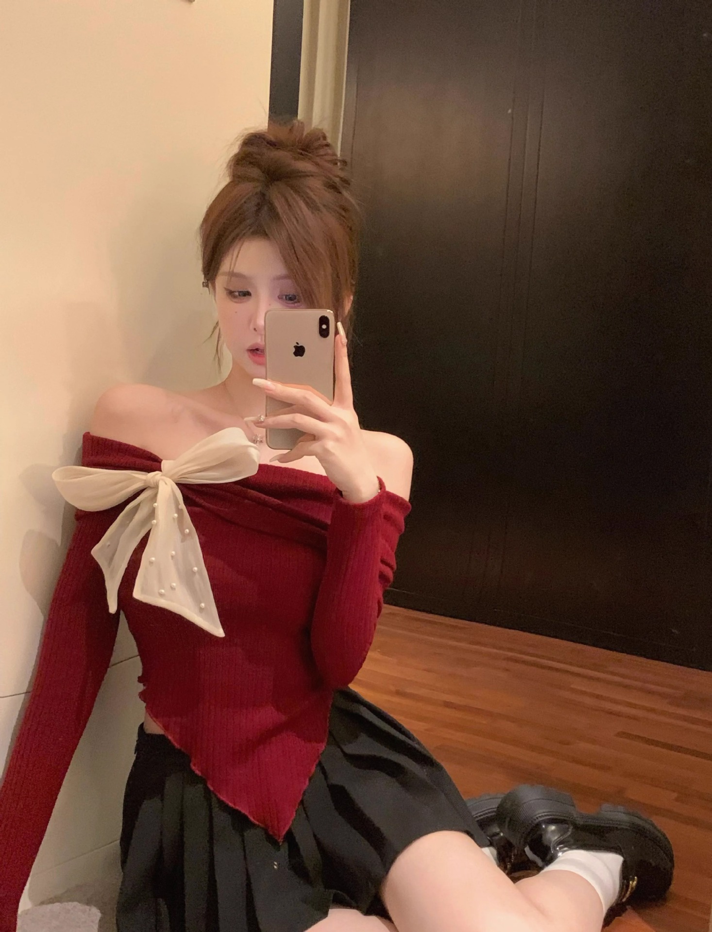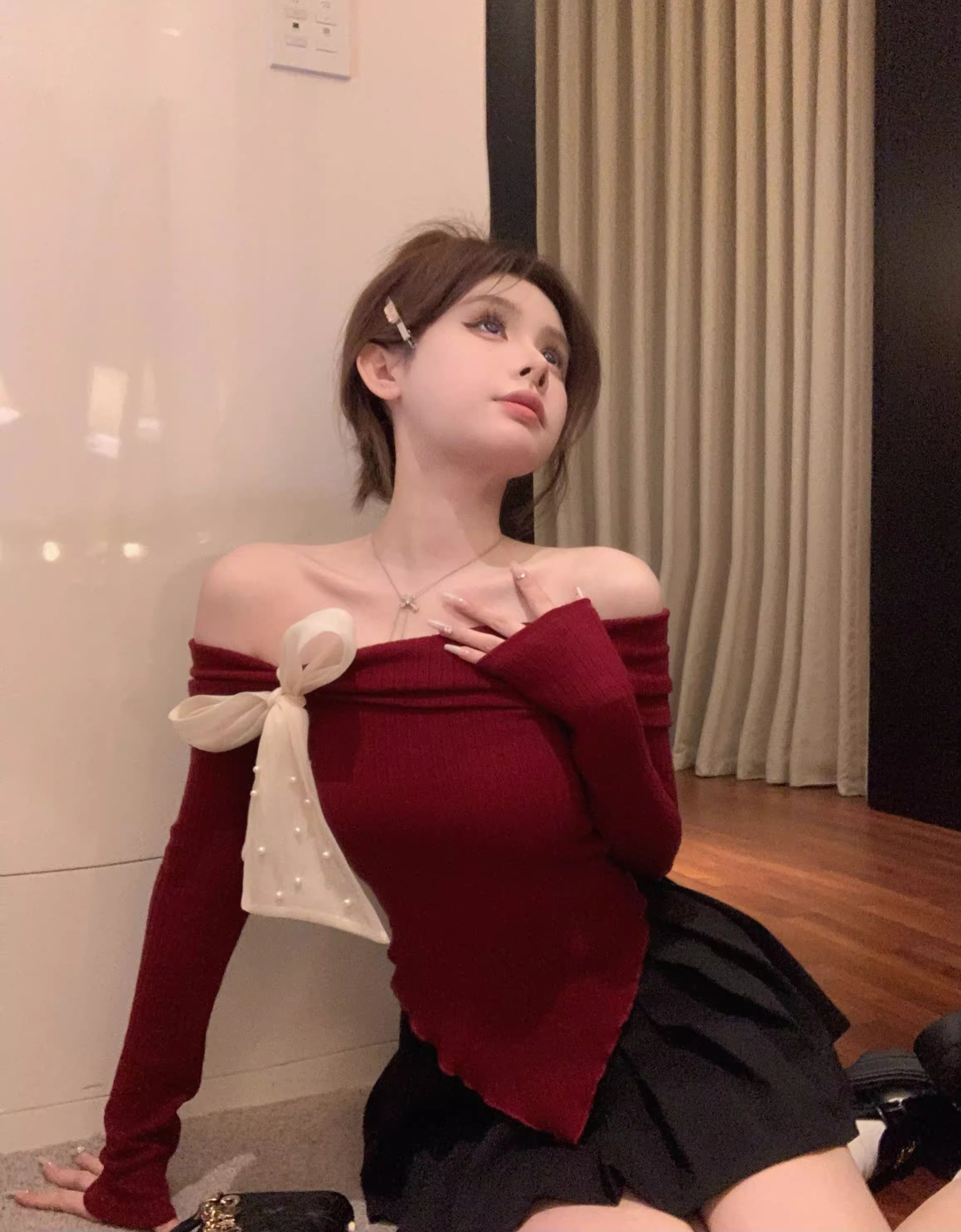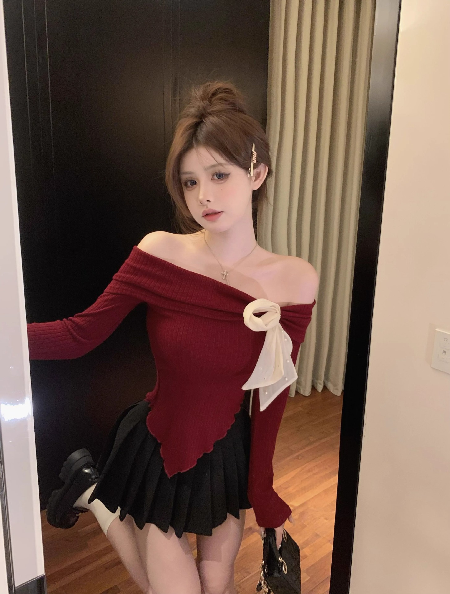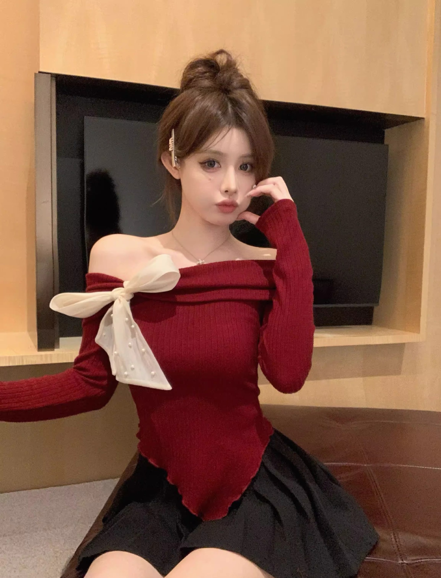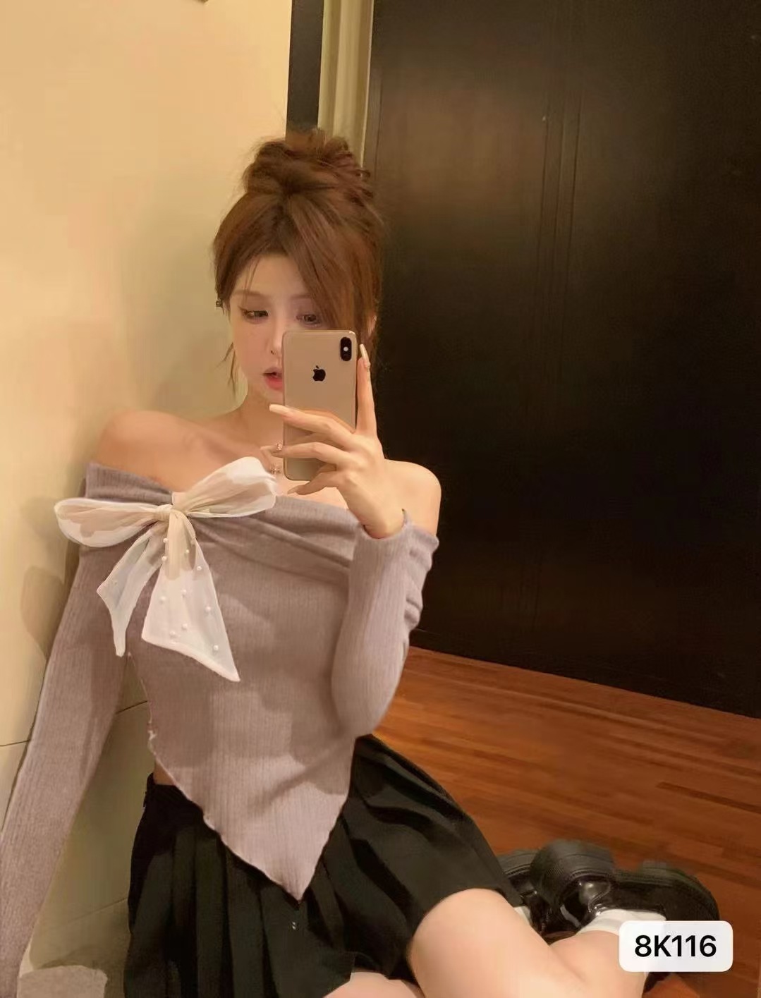 여성 봄과 가을 스파이스 소녀 불 칼라 어깨 긴팔 니트웨어를 가진 불규칙한 짧은 탑스토어 가기