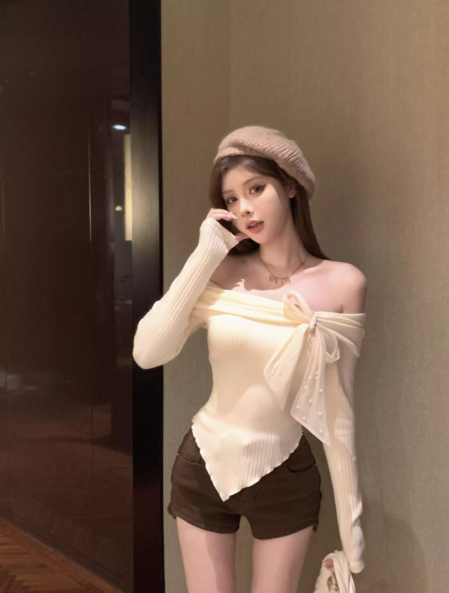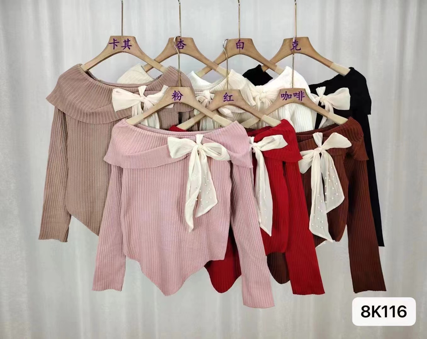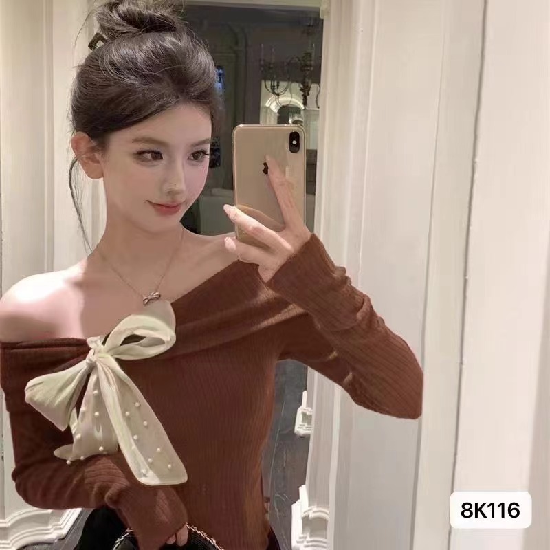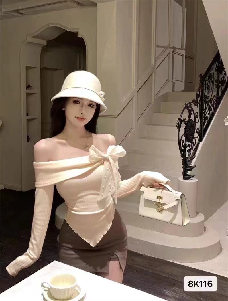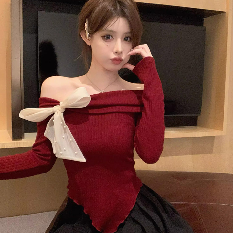 여성 봄과 가을 스파이스 소녀 불 칼라 어깨 긴팔 니트웨어를 가진 불규칙한 짧은 탑
