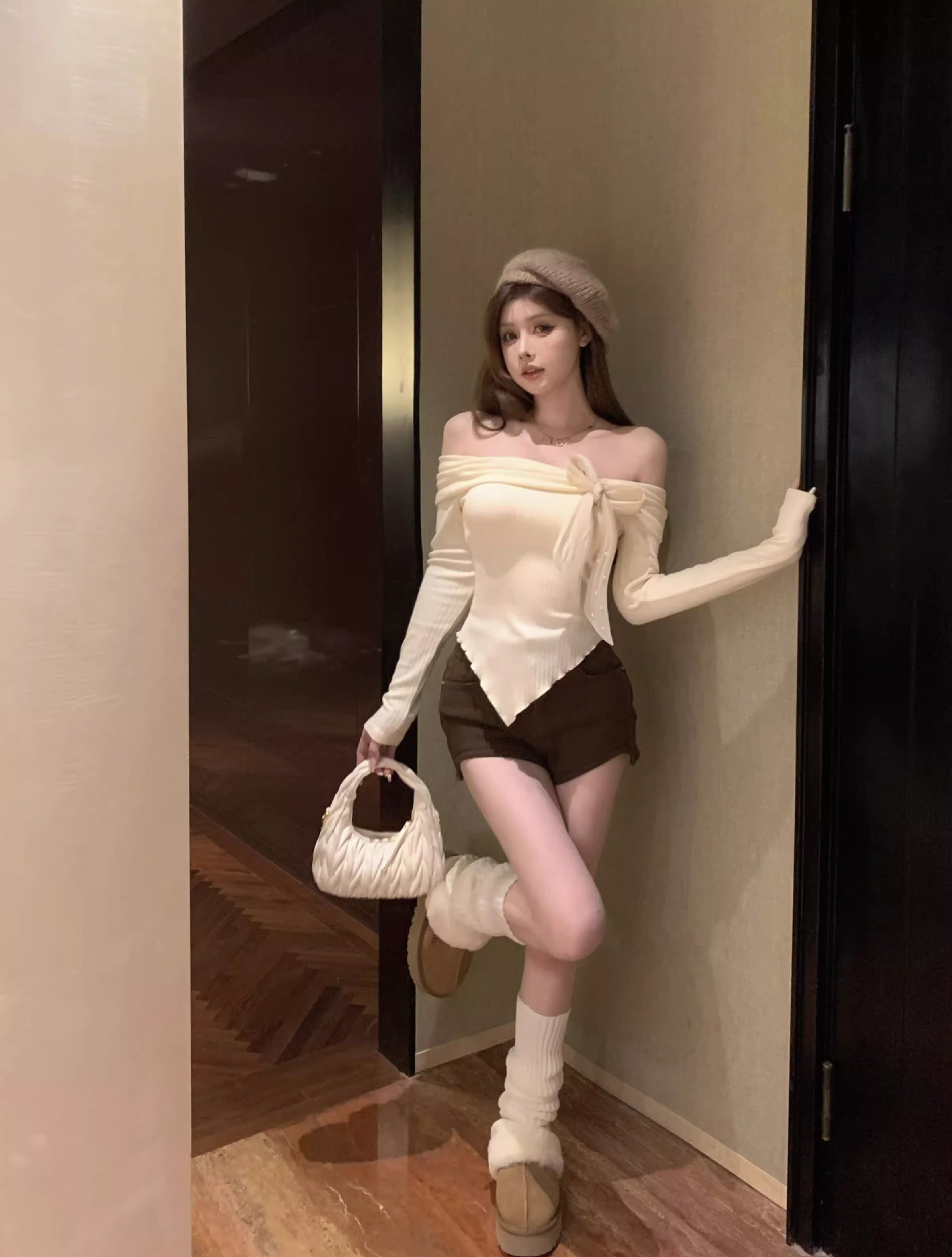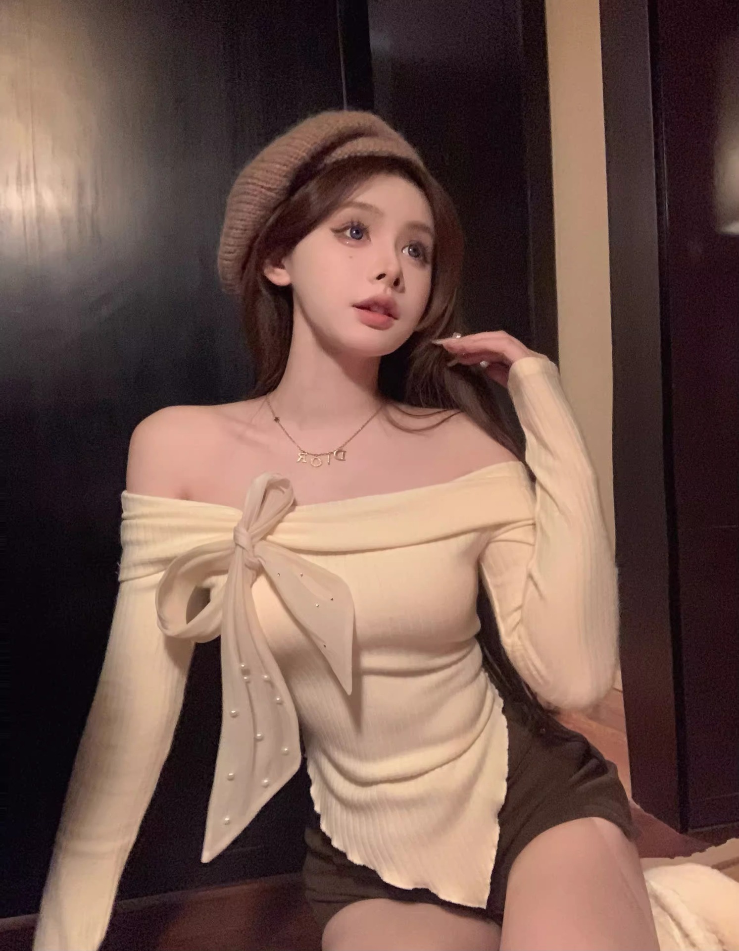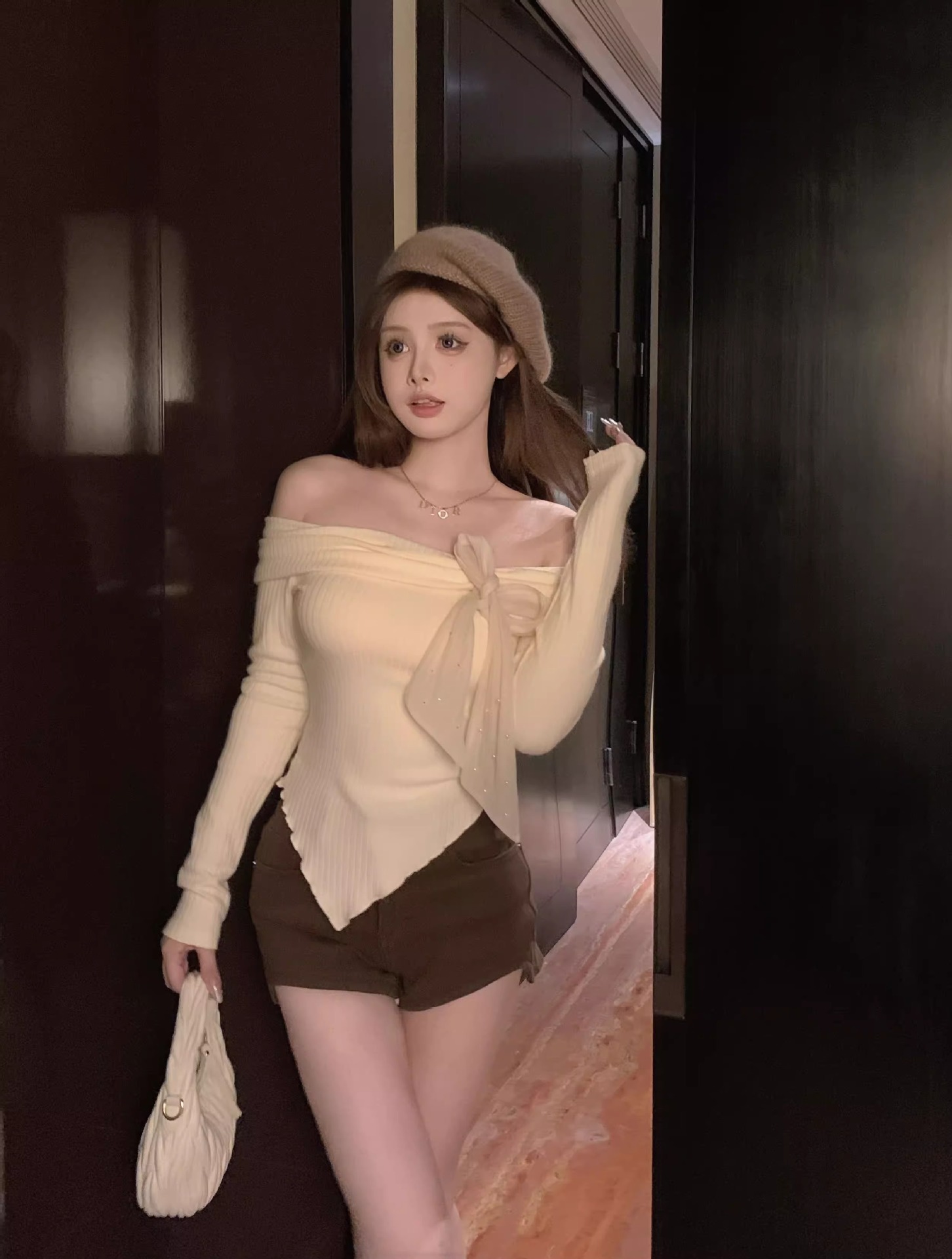 여성 봄과 가을 스파이스 소녀 불 칼라 어깨 긴팔 니트웨어를 가진 불규칙한 짧은 탑