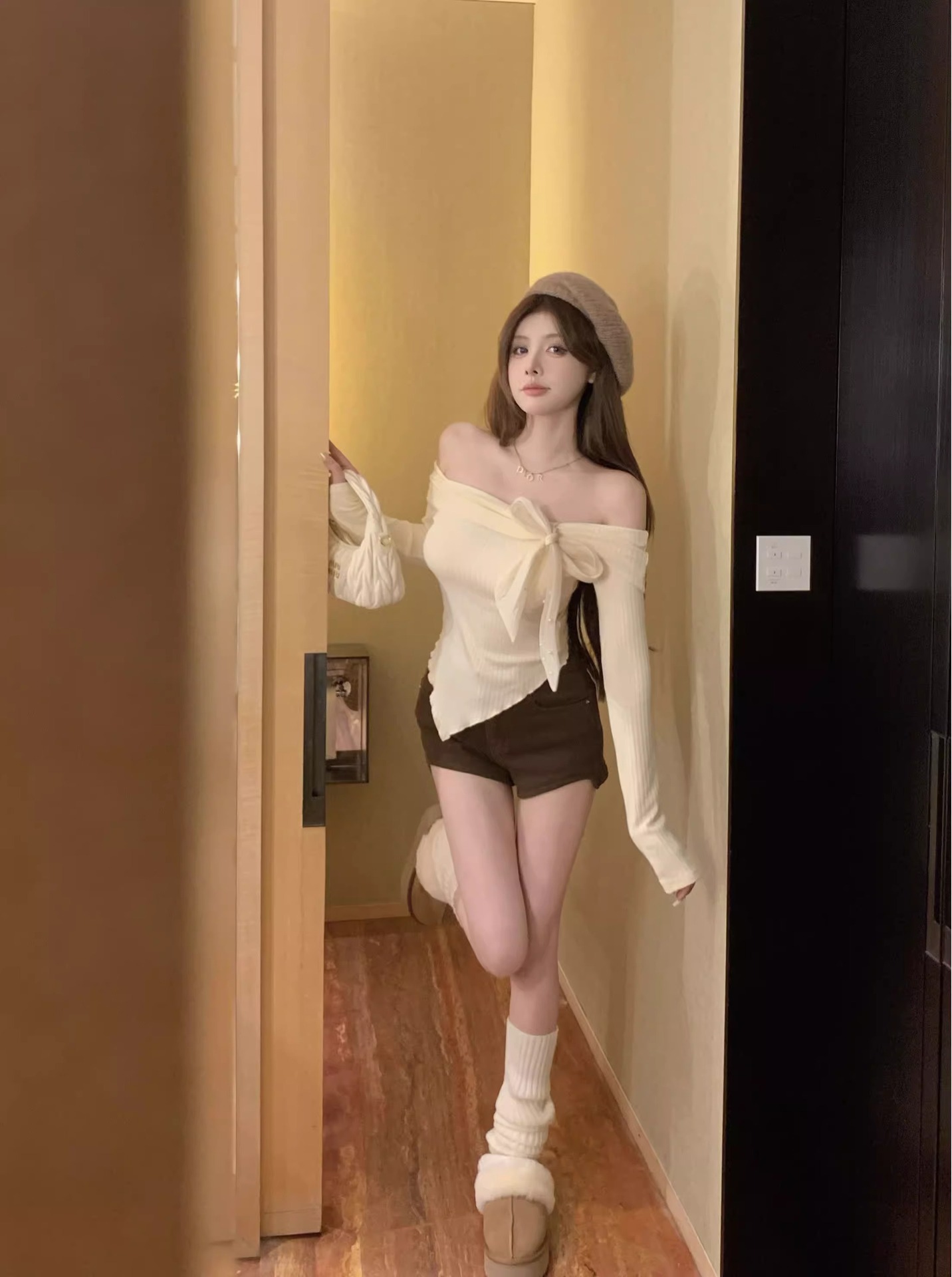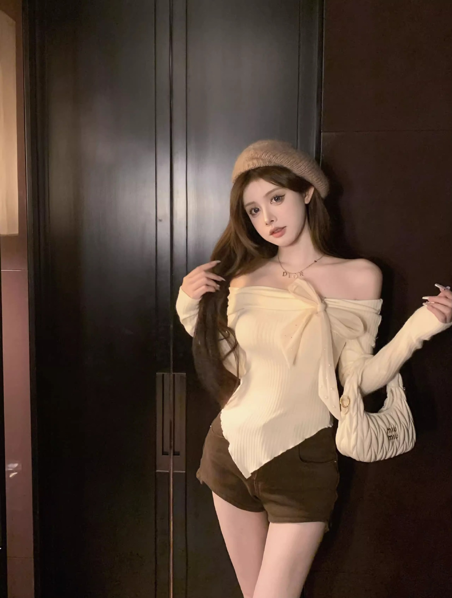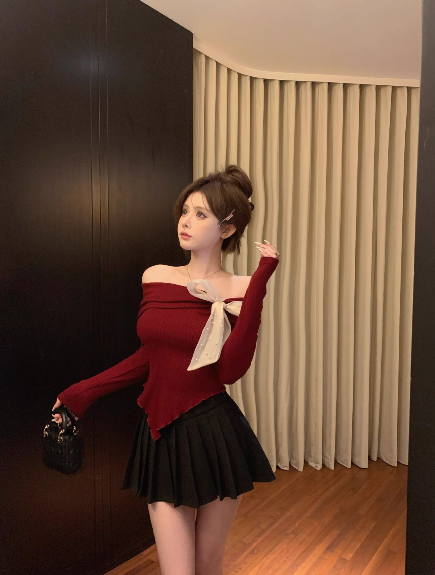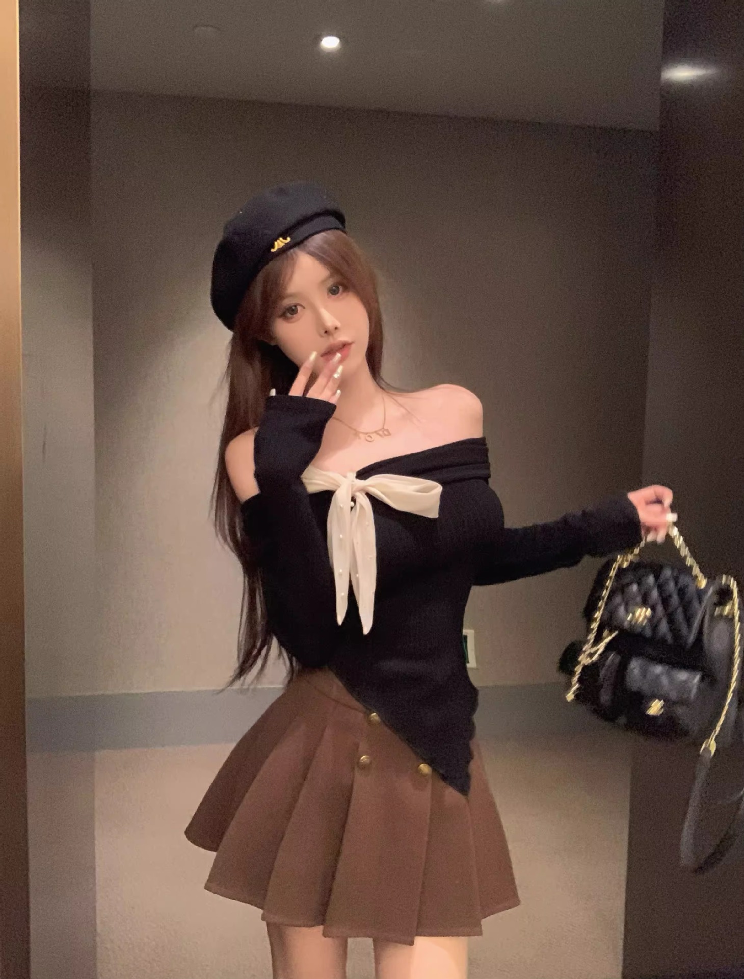 여성 봄과 가을 스파이스 소녀 불 칼라 어깨 긴팔 니트웨어를 가진 불규칙한 짧은 탑