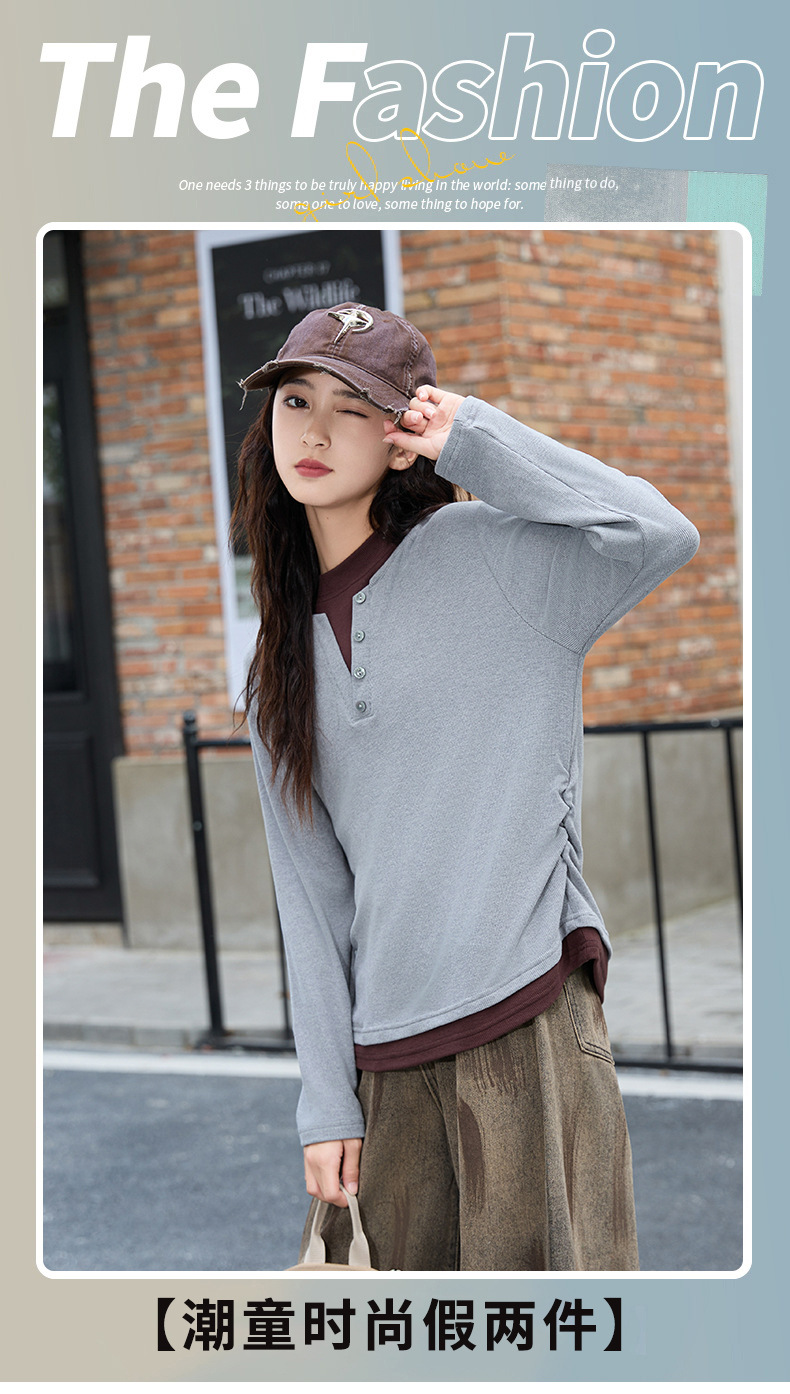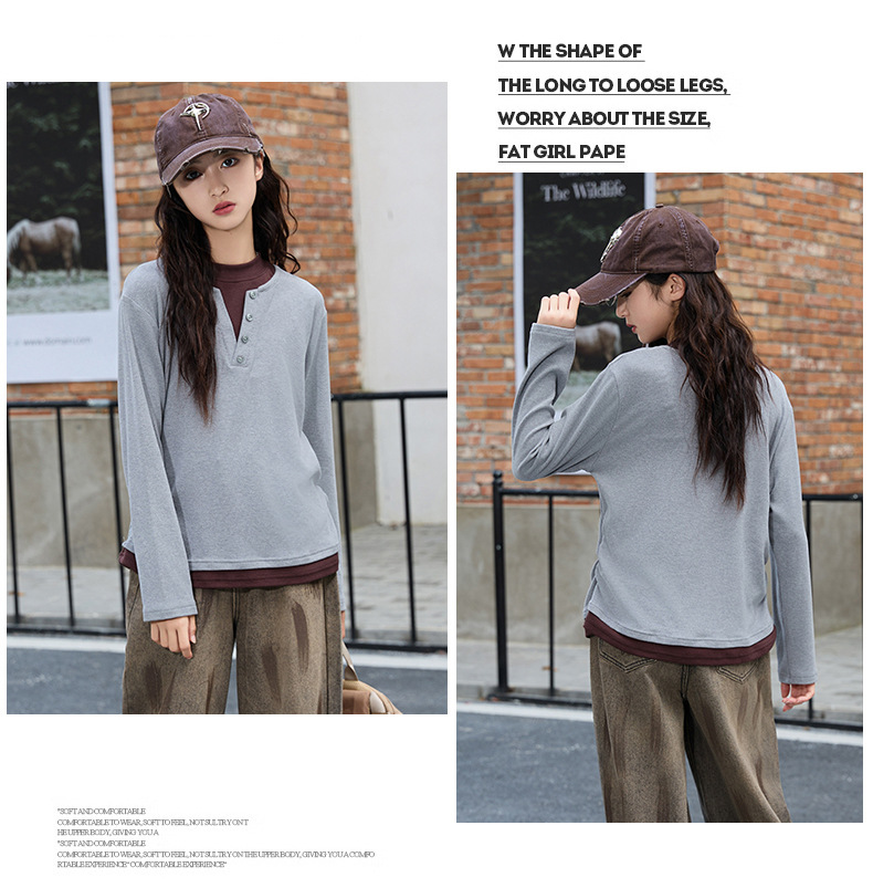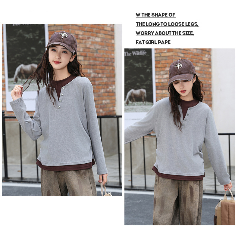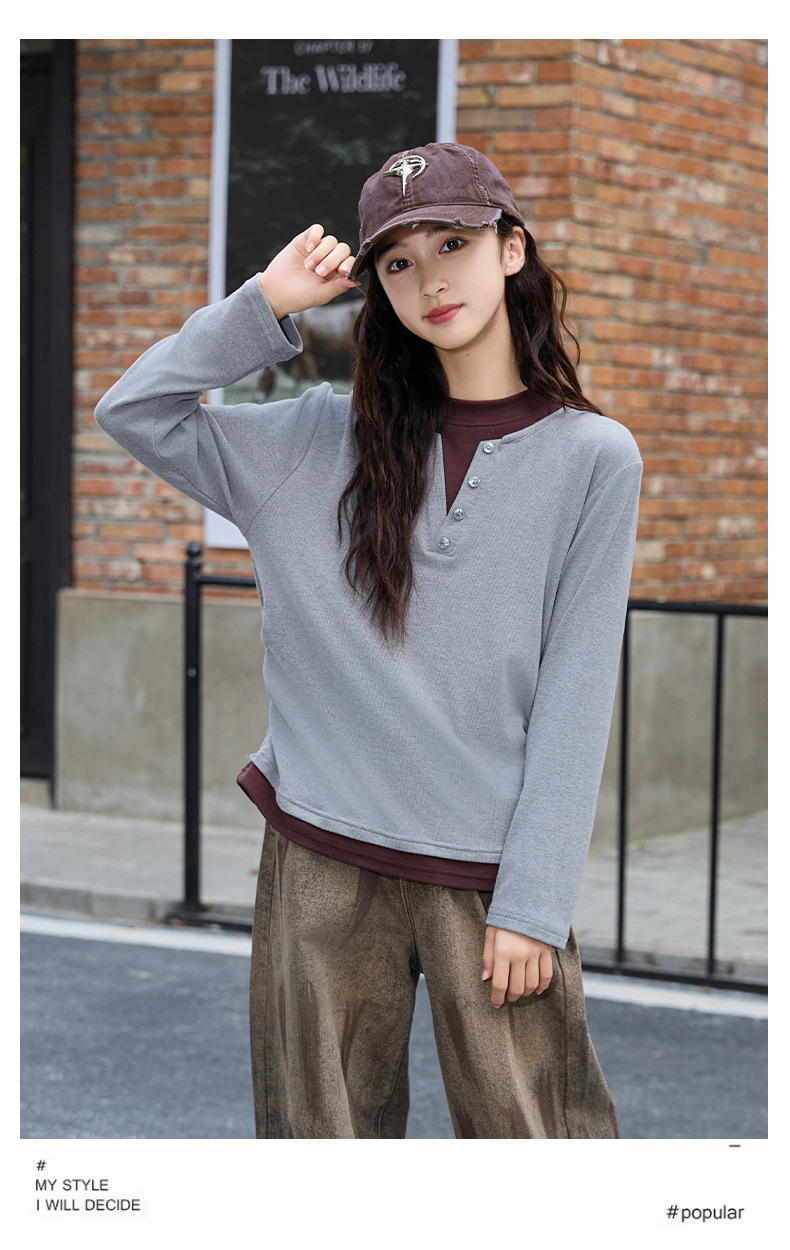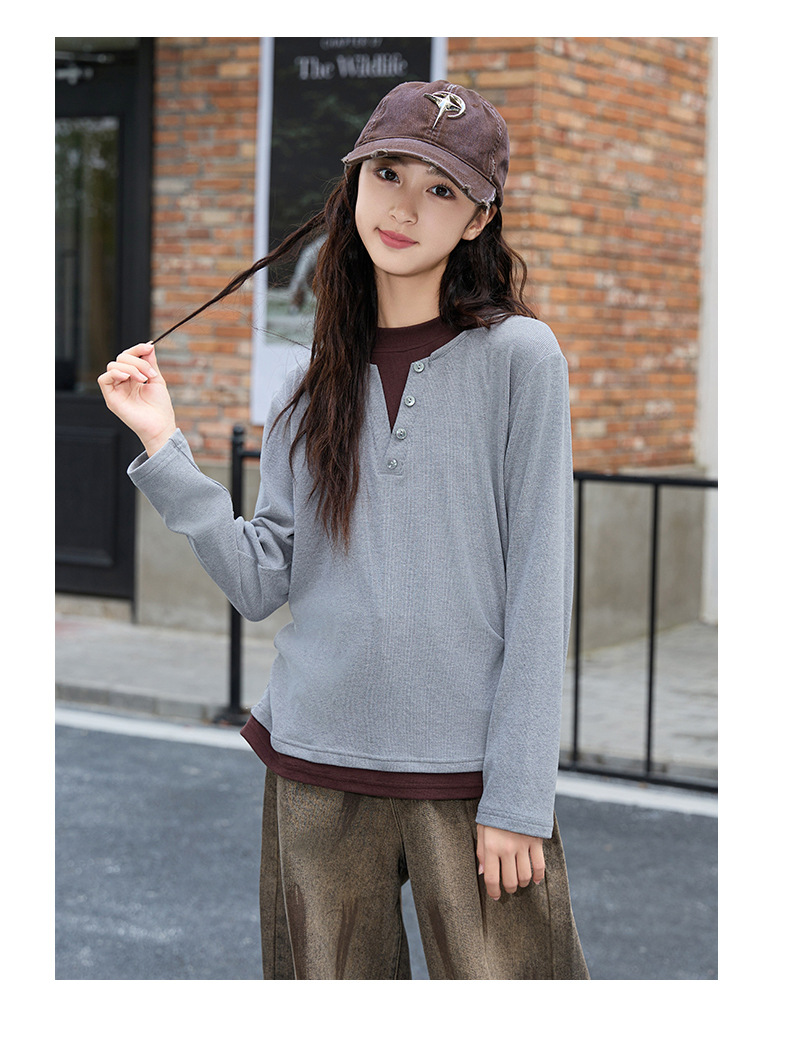 걸스 병투 셔츠 큰 어린이 플러스 사이즈 느슨한 가짜 투피스 긴팔 티셔츠 슬리밍 스웨터 중학교 학생에게 유행스토어 가기