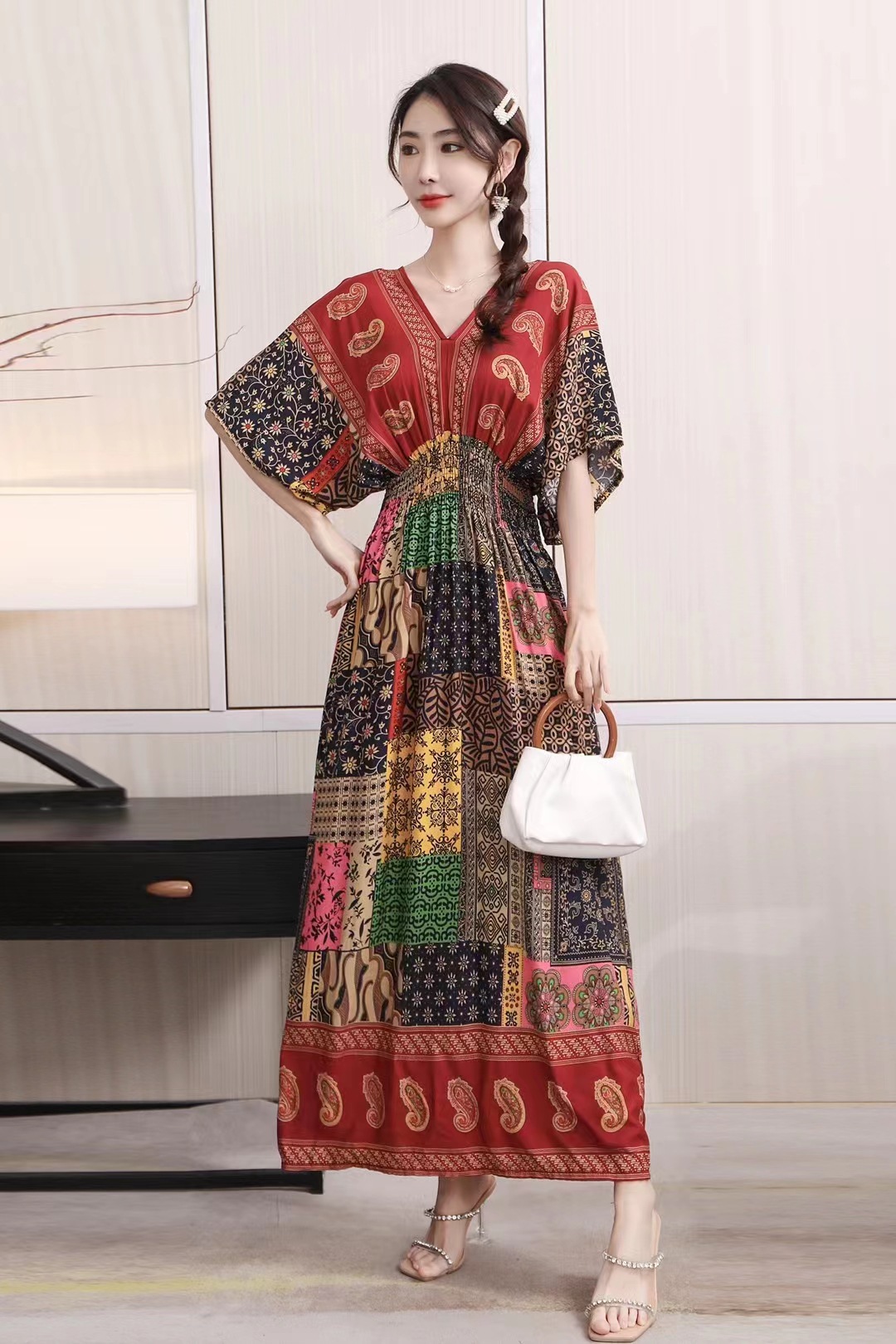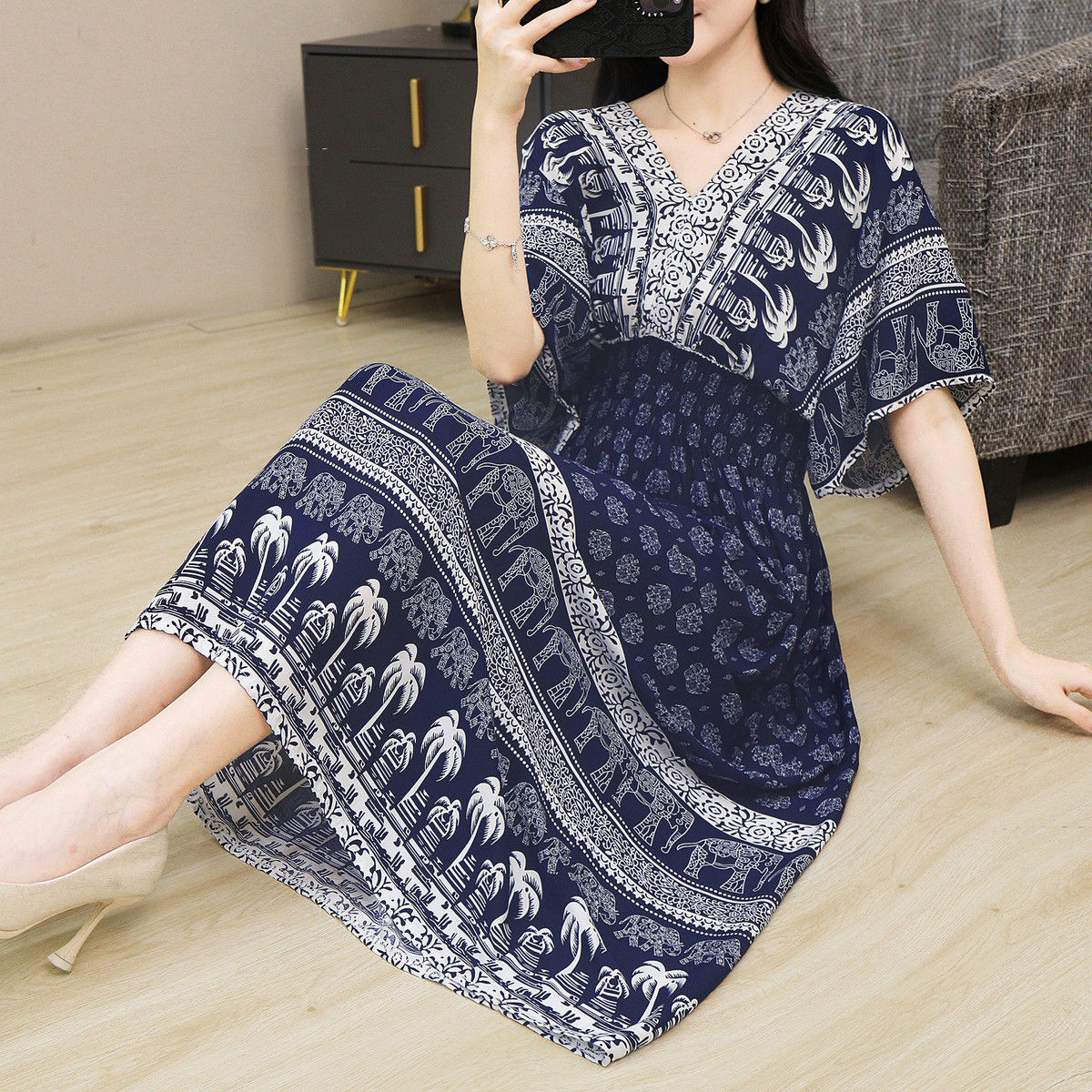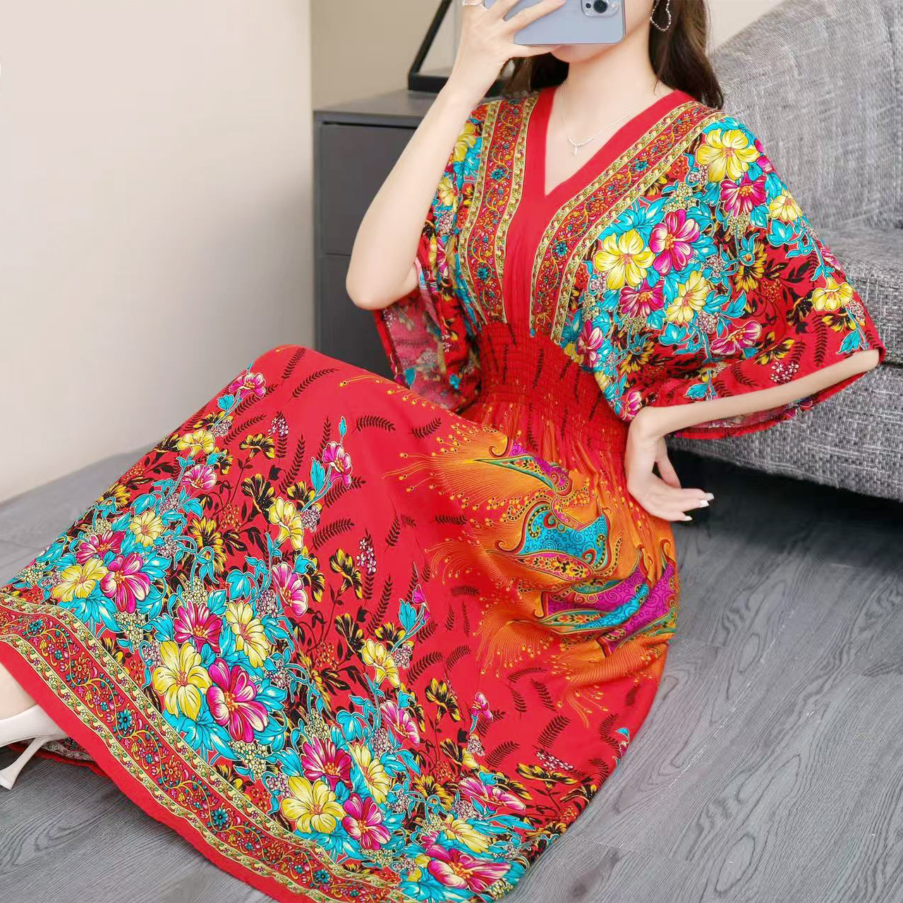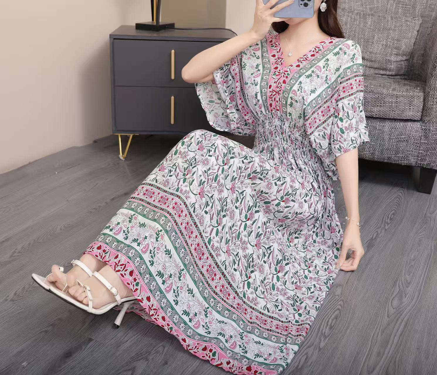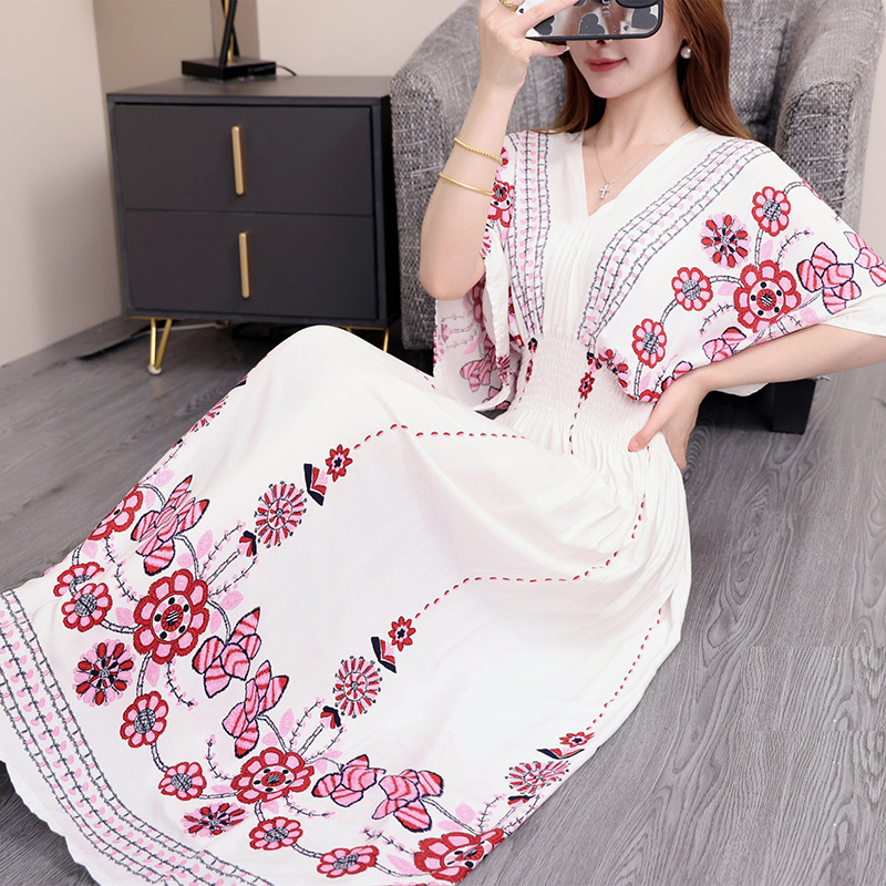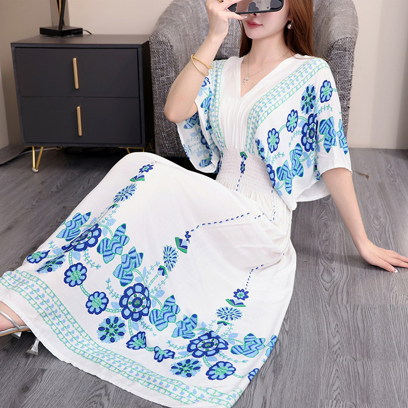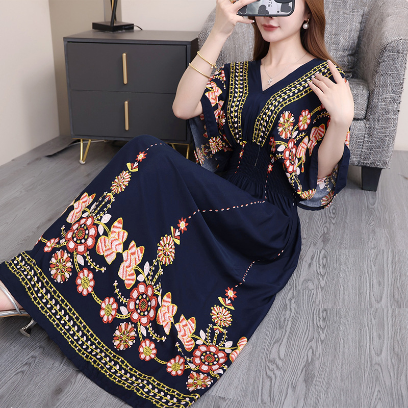 동남아시아 해변 휴가용 스커트, 태국 스타일 면 실크 꽃무늬 원피스, 여성 여름 민족풍 V넥스토어 가기