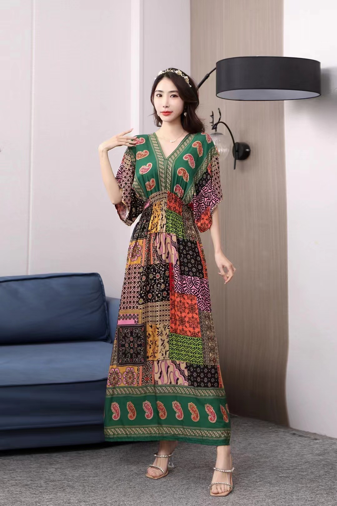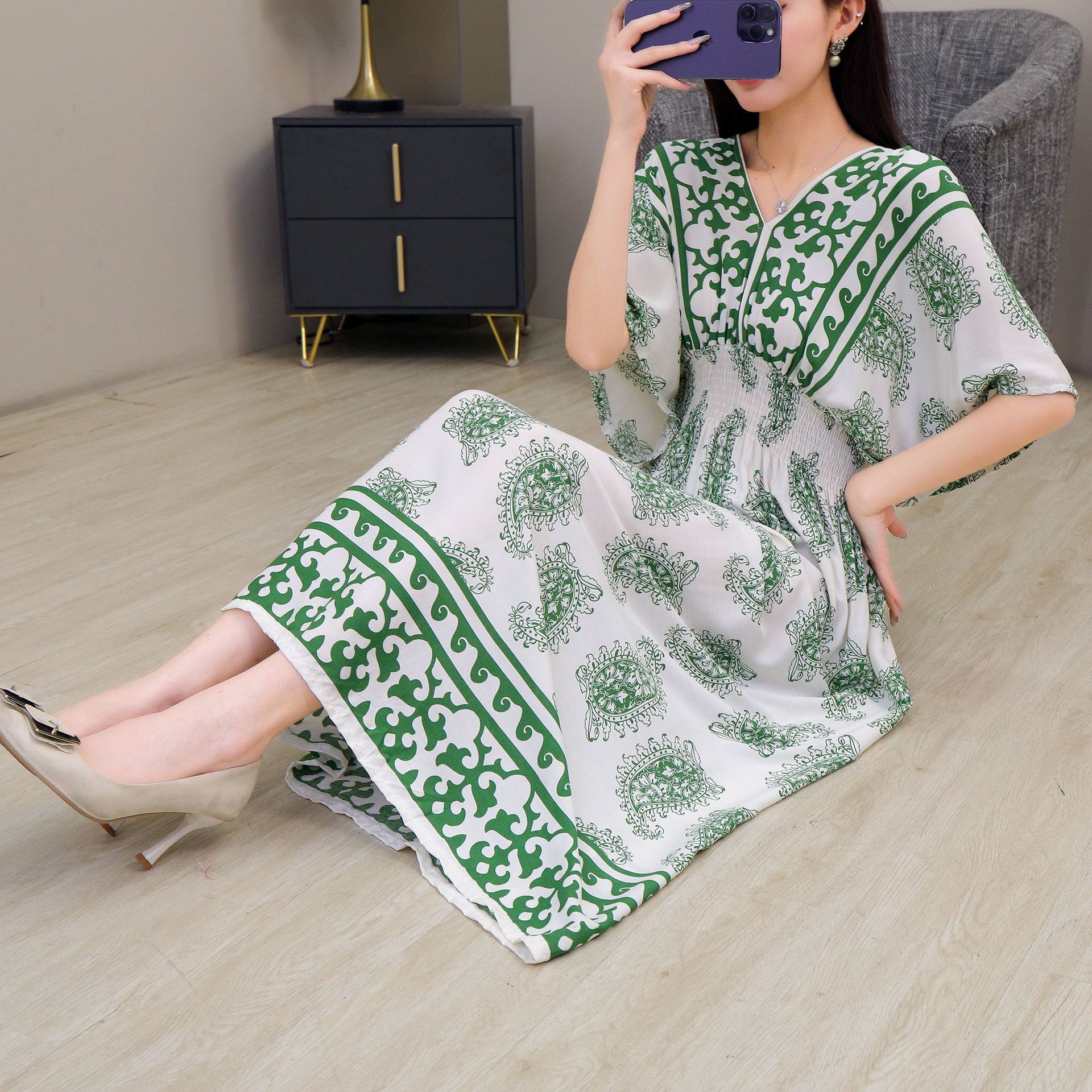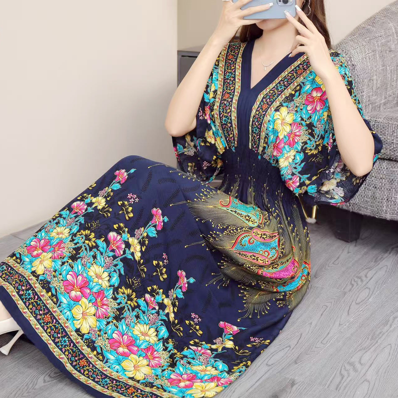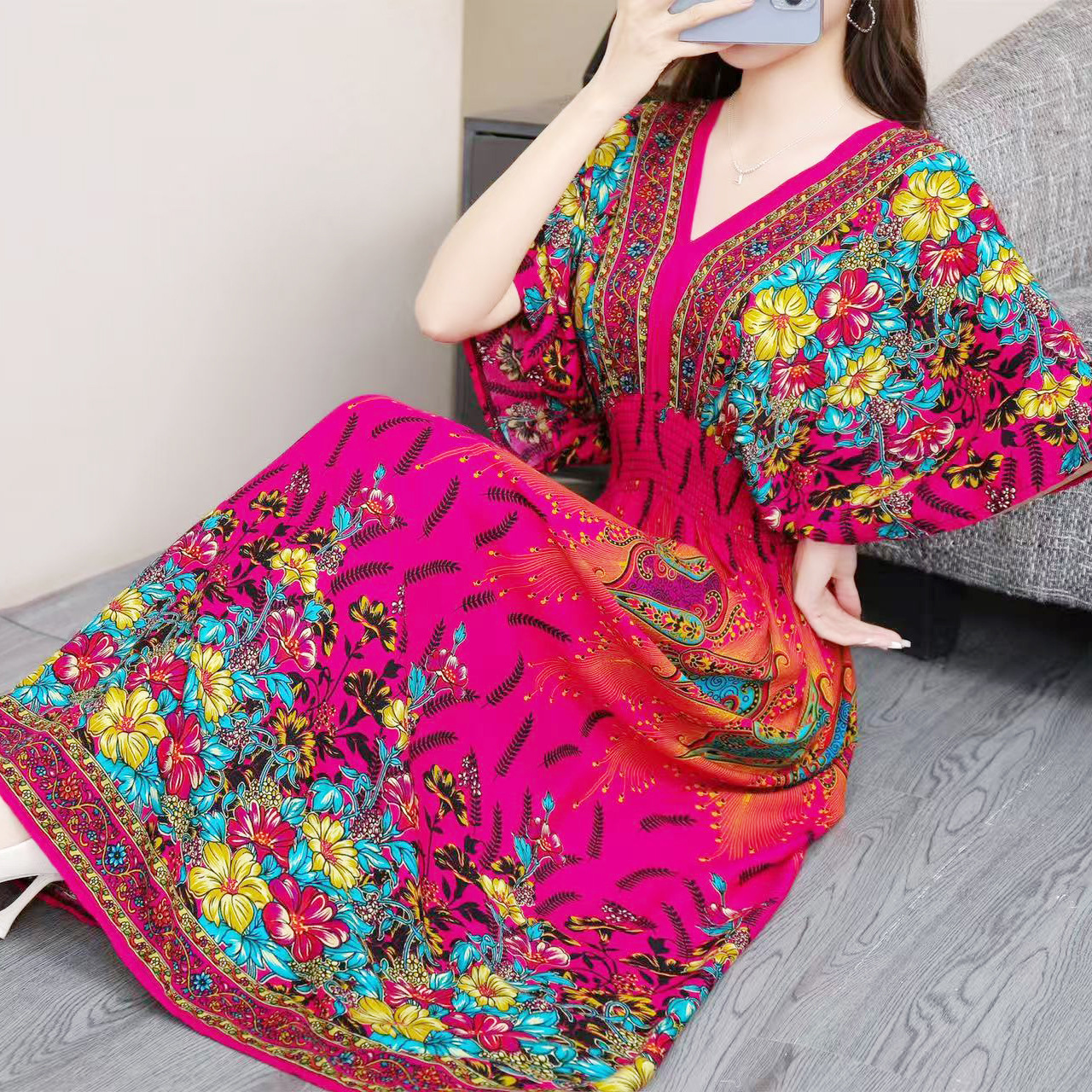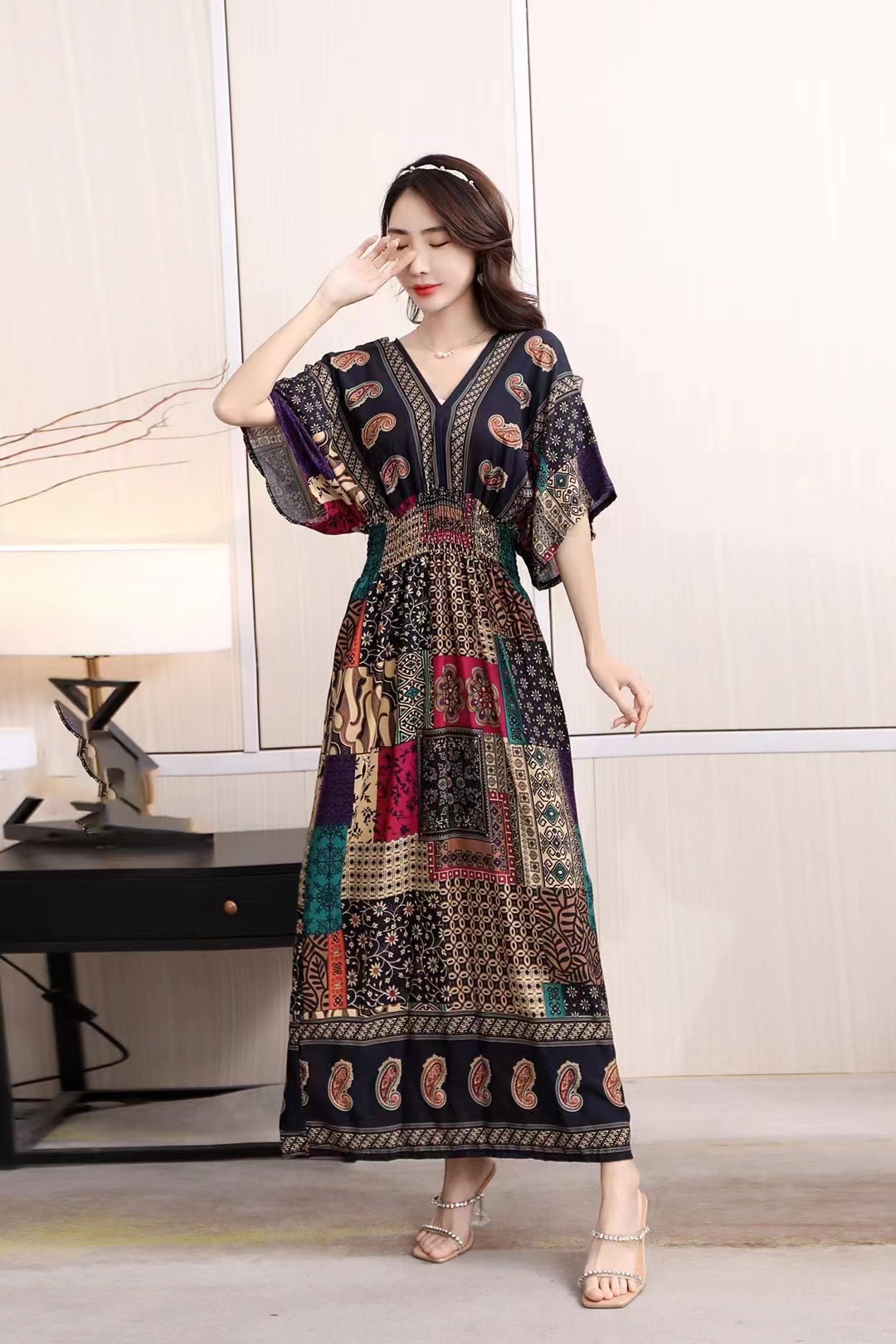 동남아시아 해변 휴가용 스커트, 태국 스타일 면 실크 꽃무늬 원피스, 여성 여름 민족풍 V넥스토어 가기