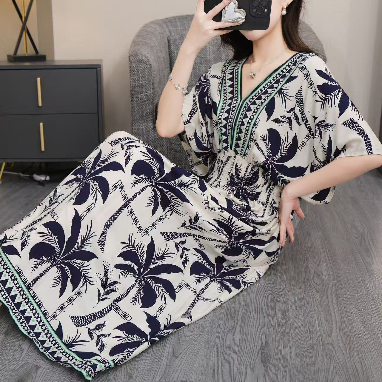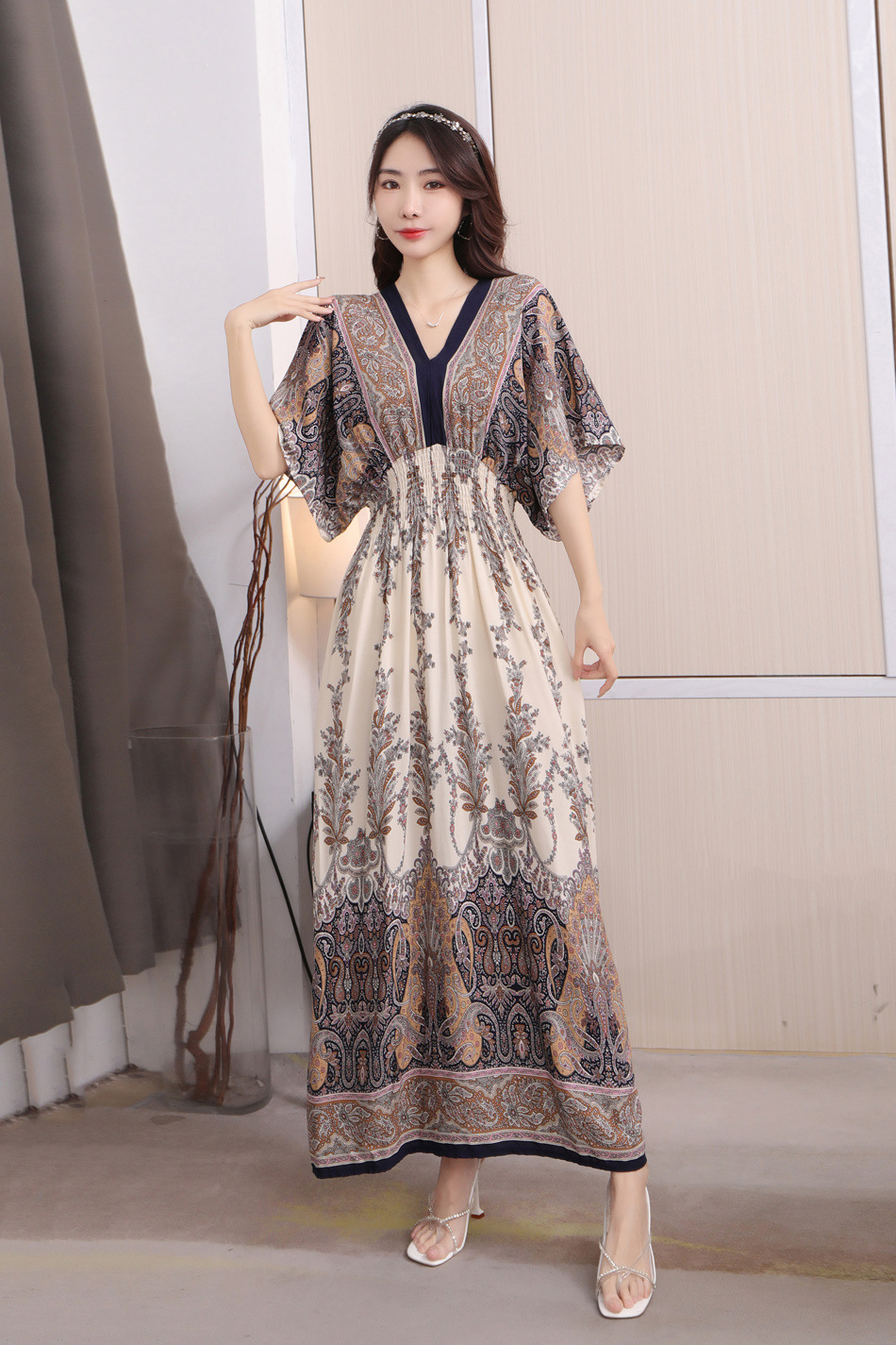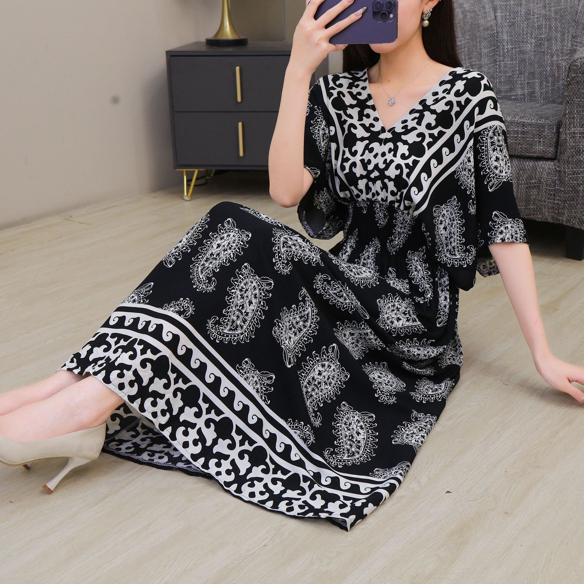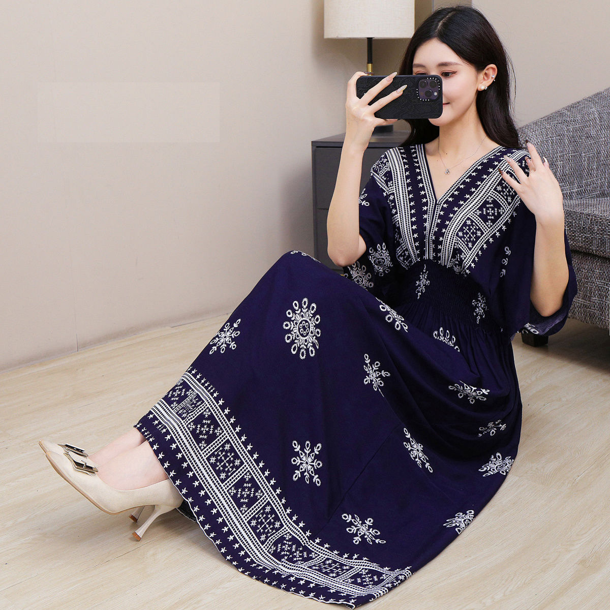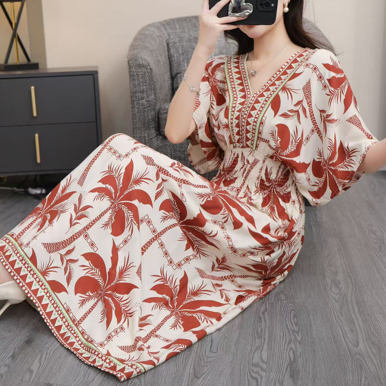 동남아시아 해변 휴가용 스커트, 태국 스타일 면 실크 꽃무늬 원피스, 여성 여름 민족풍 V넥스토어 가기