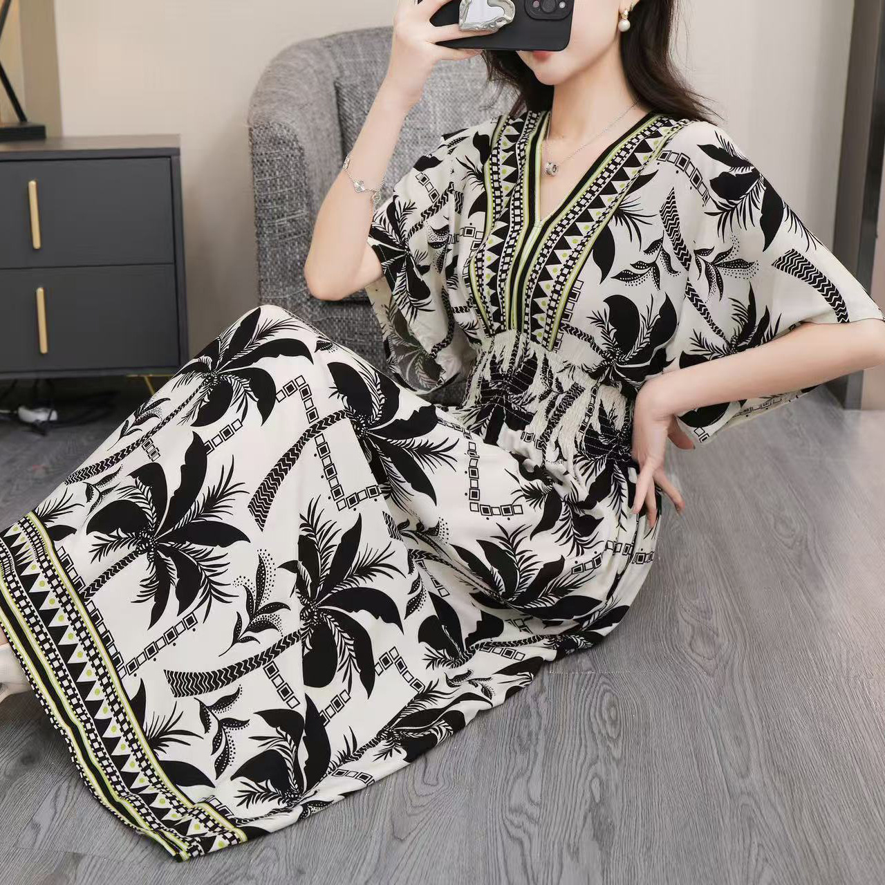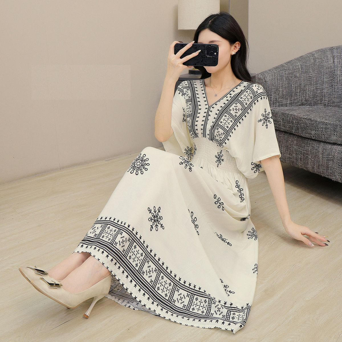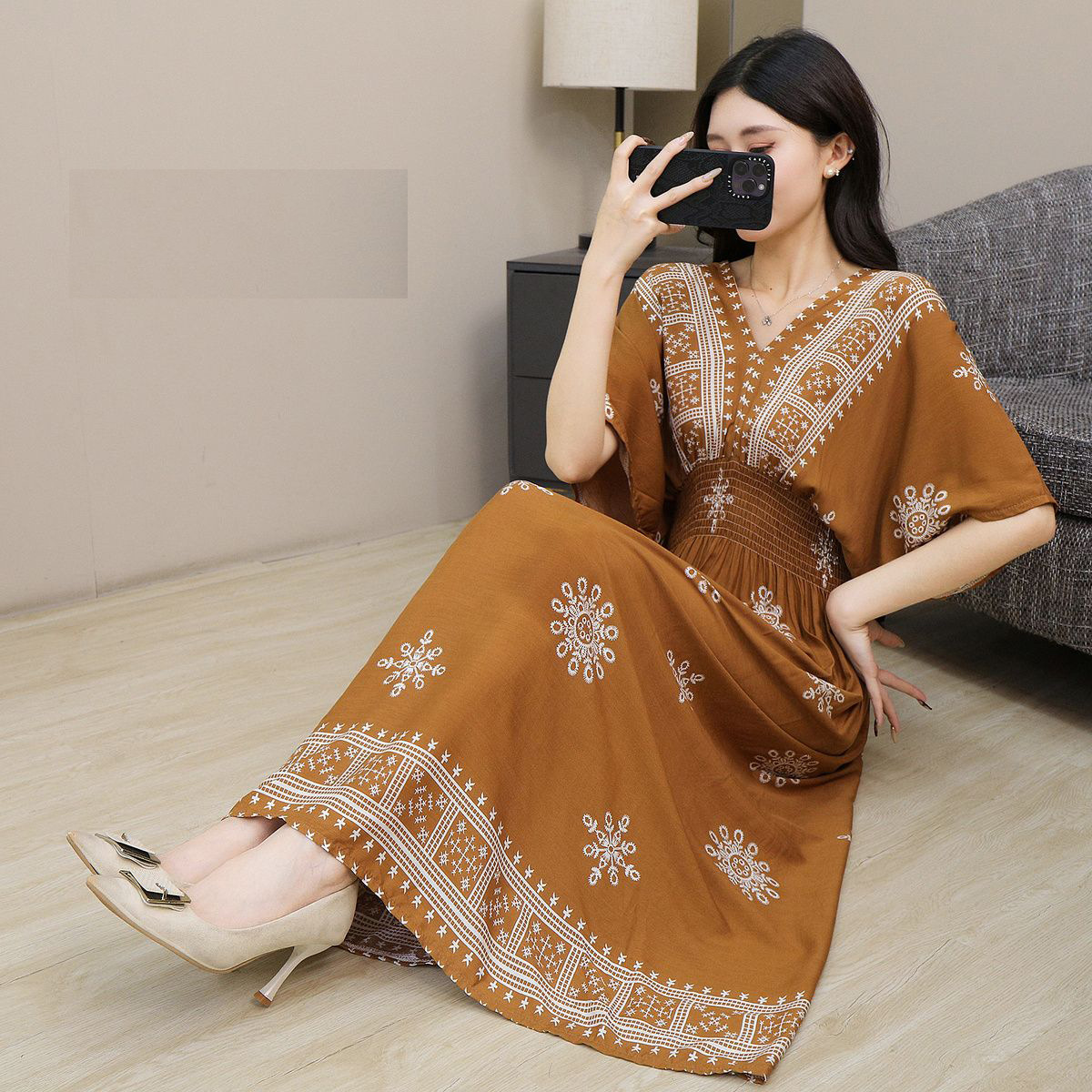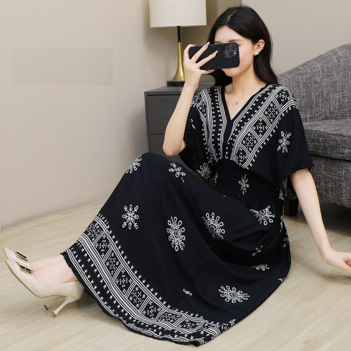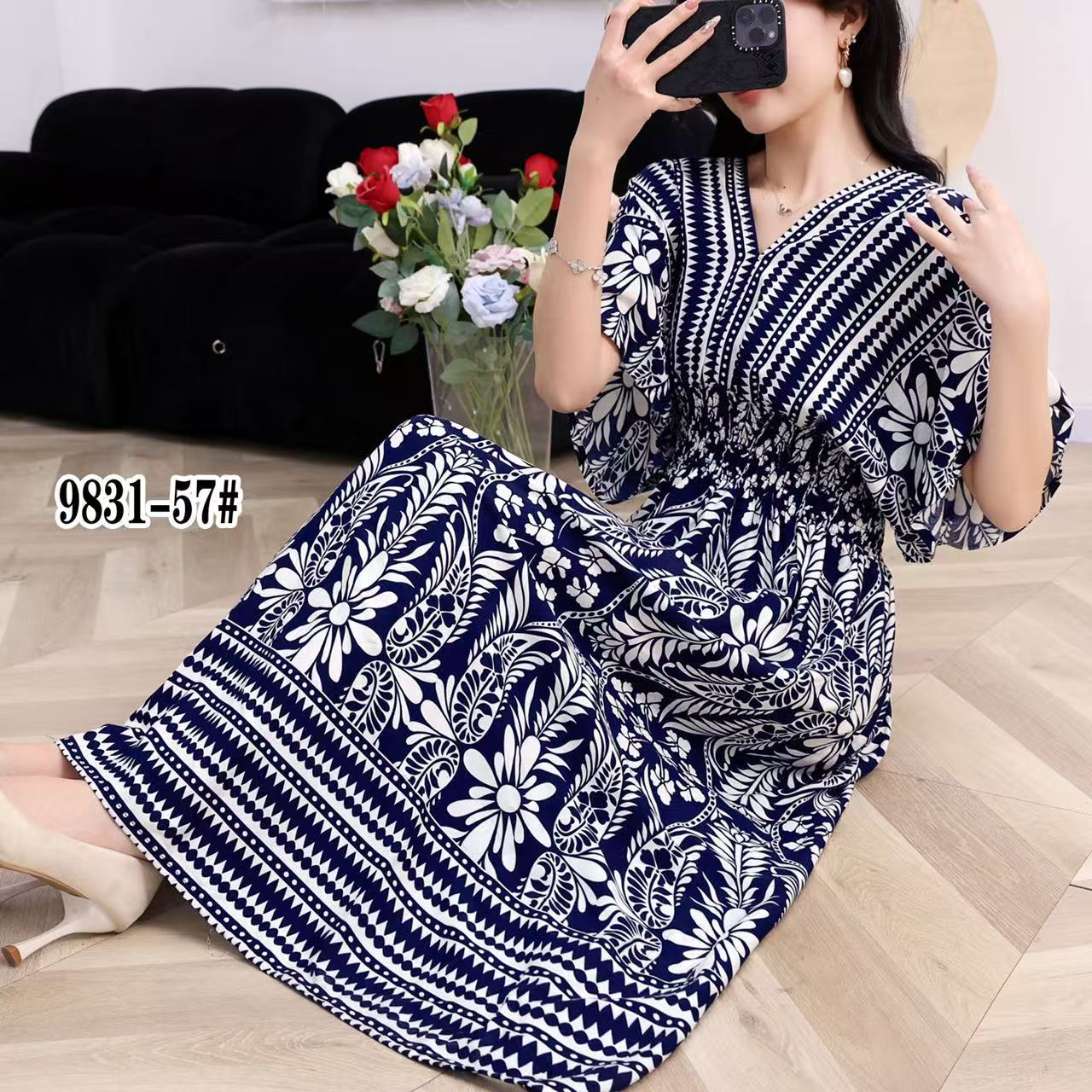 동남아시아 해변 휴가용 스커트, 태국 스타일 면 실크 꽃무늬 원피스, 여성 여름 민족풍 V넥스토어 가기