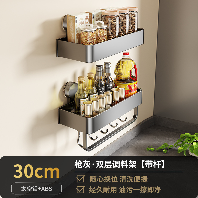 • 건그레이 30CM 더블 레이어 흡착컵 스파이스 랙(후크와 막대가 있는 1층)