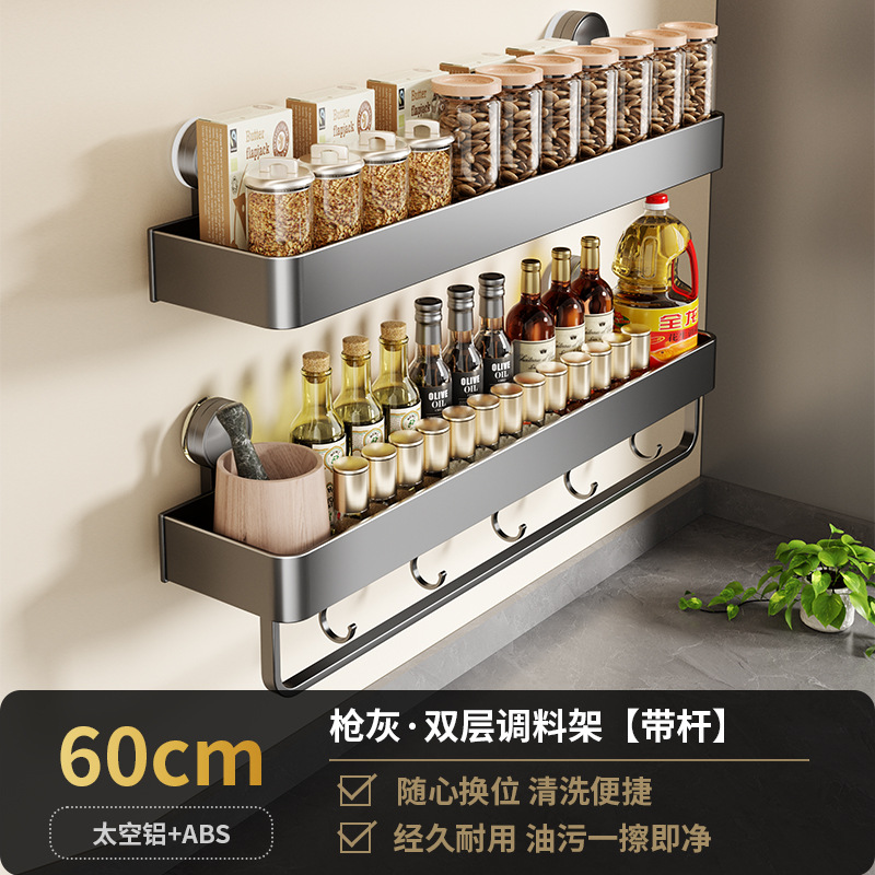 • 건그레이 60CM 더블 레이어 흡착컵 스파이스 랙(후크와 막대가 있는 1층)