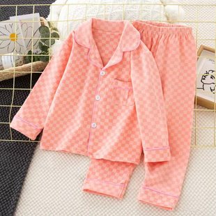 高档格子德绒开衫儿童睡衣家居服长袖春秋男女小中大童宝宝套装