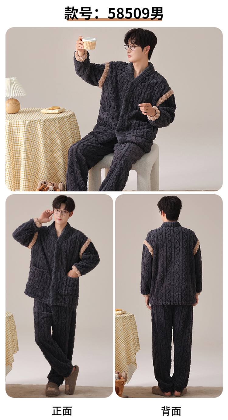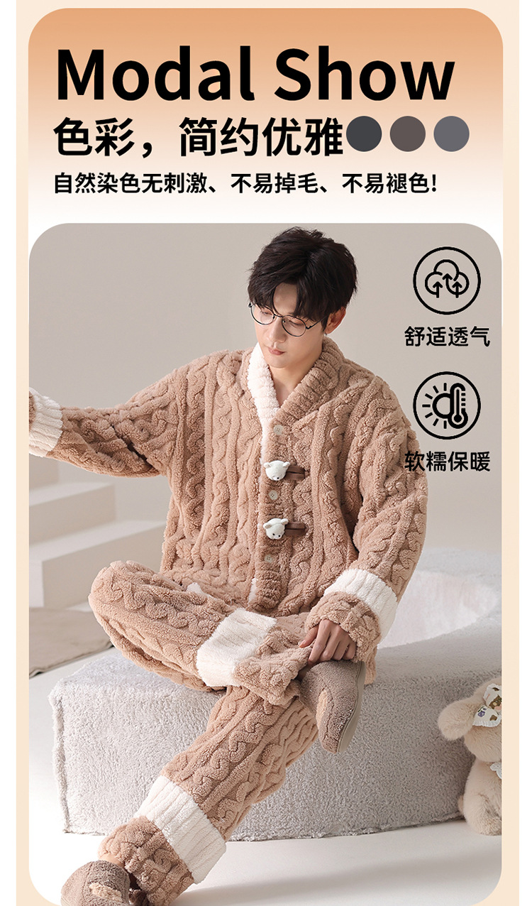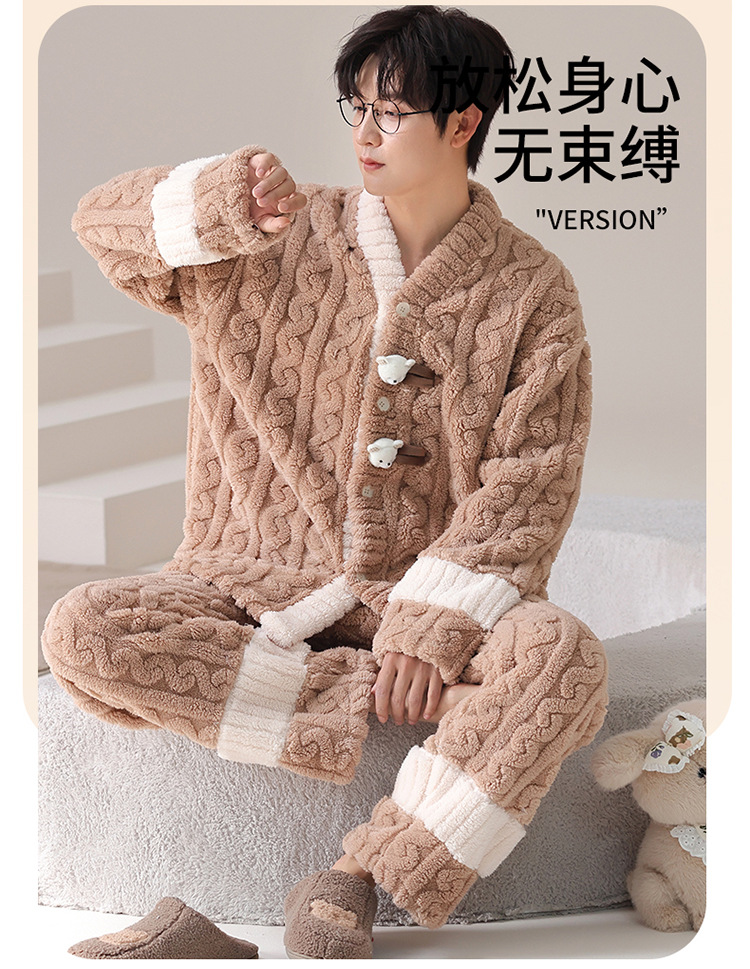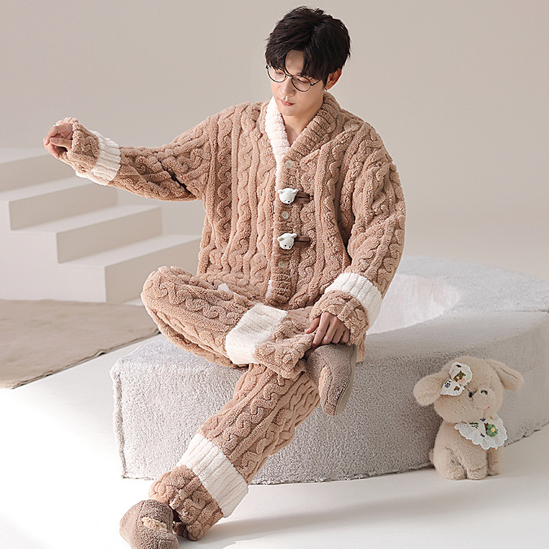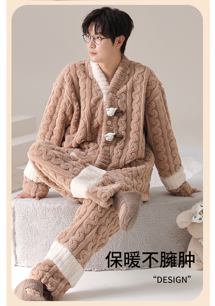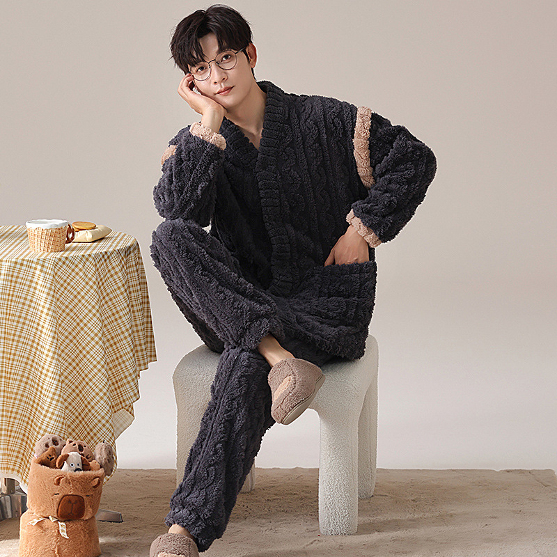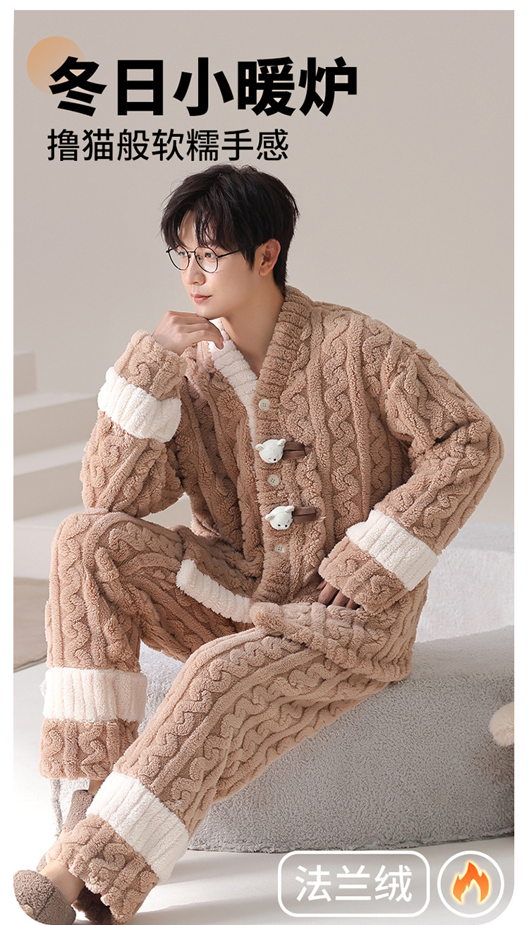 새로운 산호 양털 잠옷 남자의 가을과 겨울 기모 두꺼운 따뜻한 세트 플란넬 겉옷 카디건 홈 옷