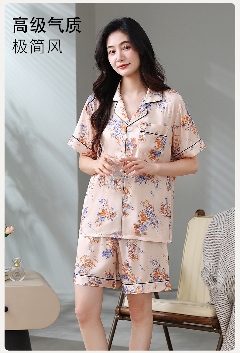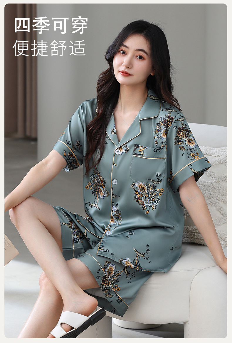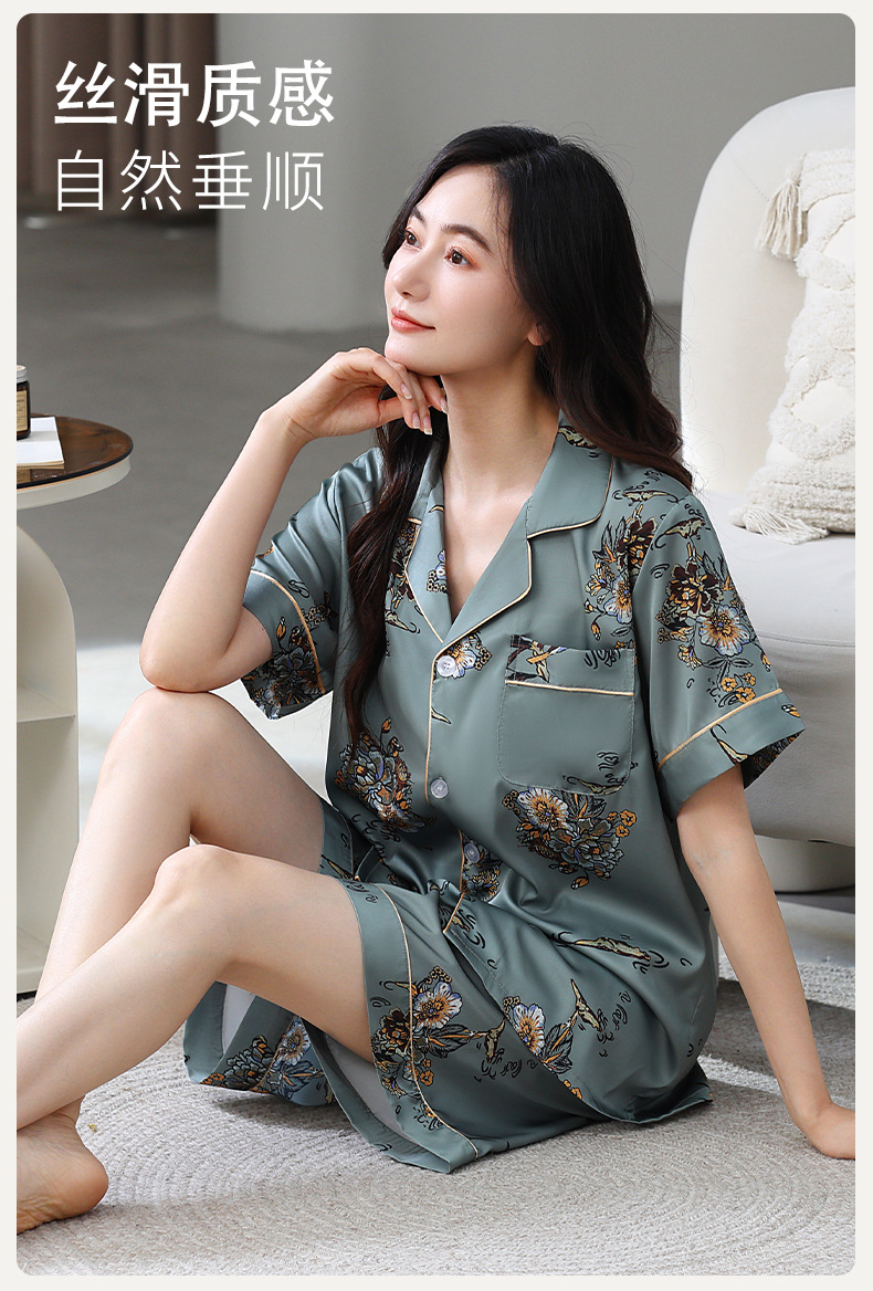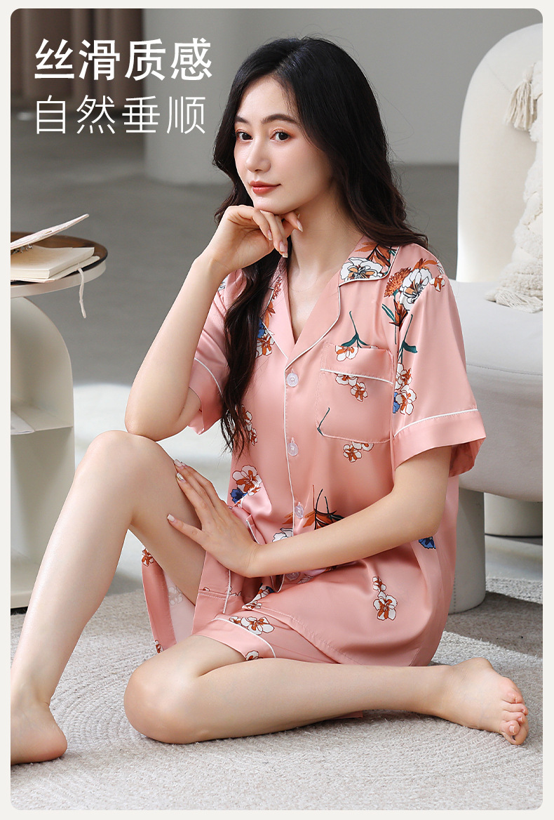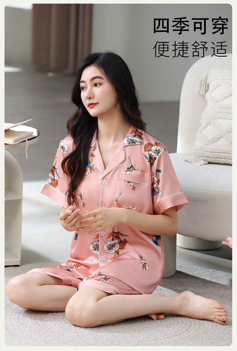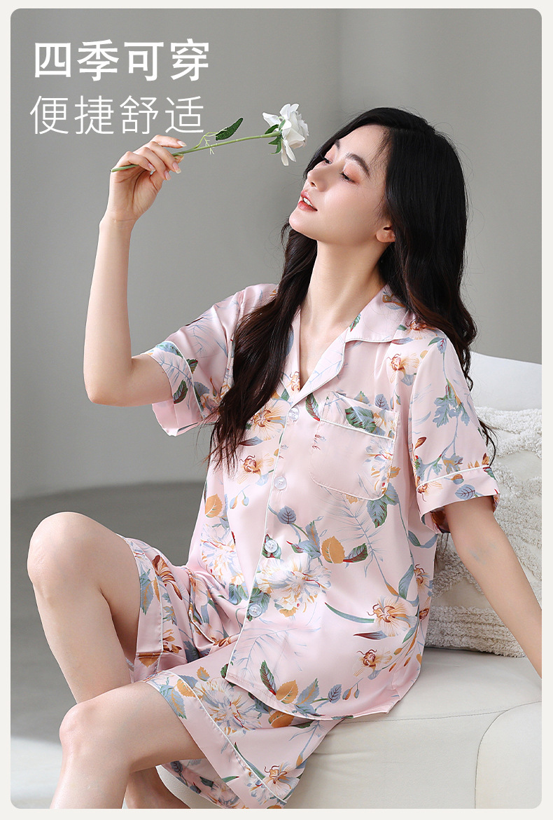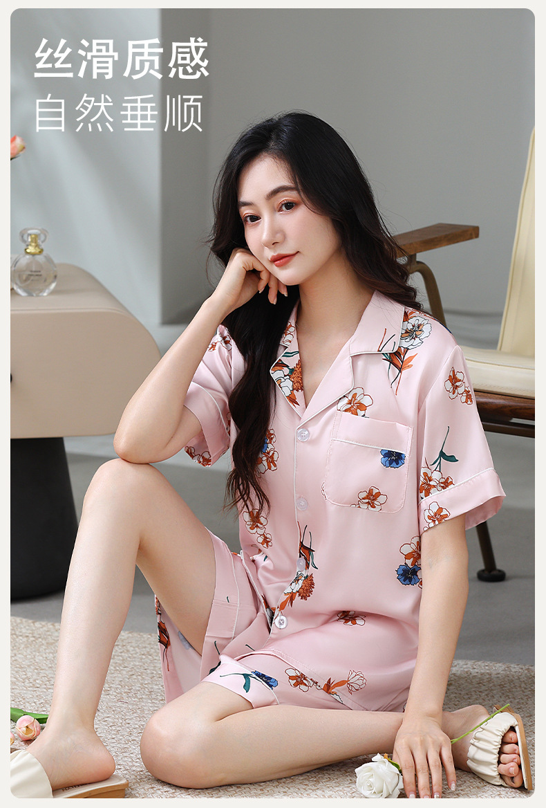 [쇼핑몰에서도 같은 스타일] 고급스러운 아이스 실크 반팔 반바지 잠옷 여성 여름 얇은 모조 실크 홈웨어 세트
