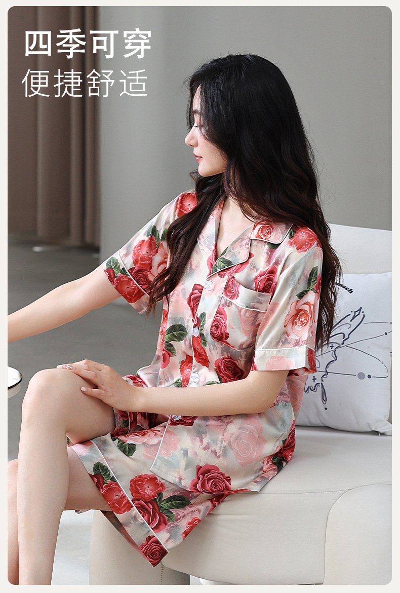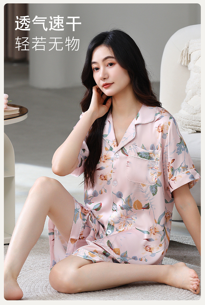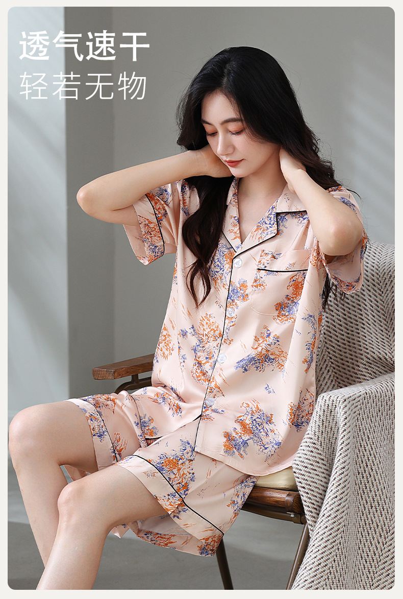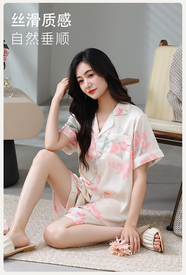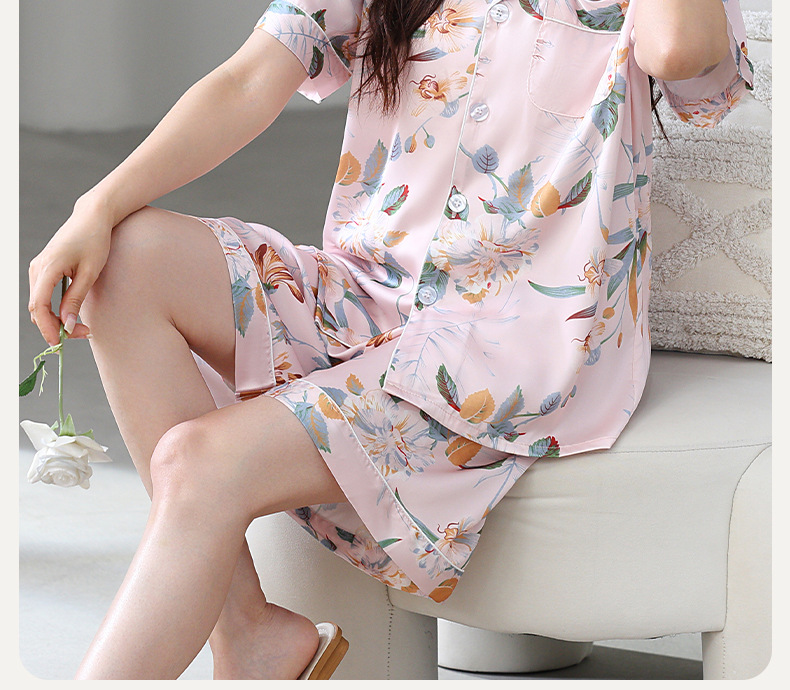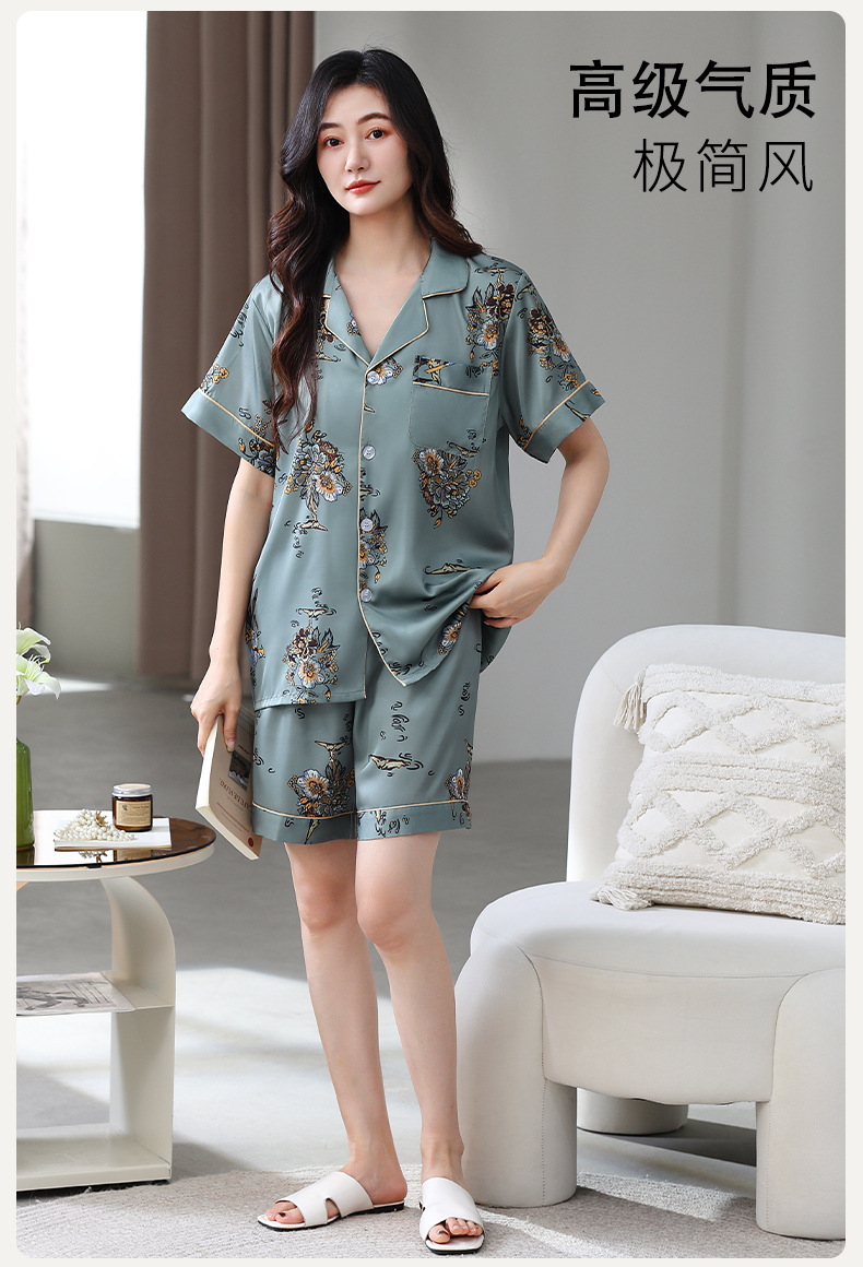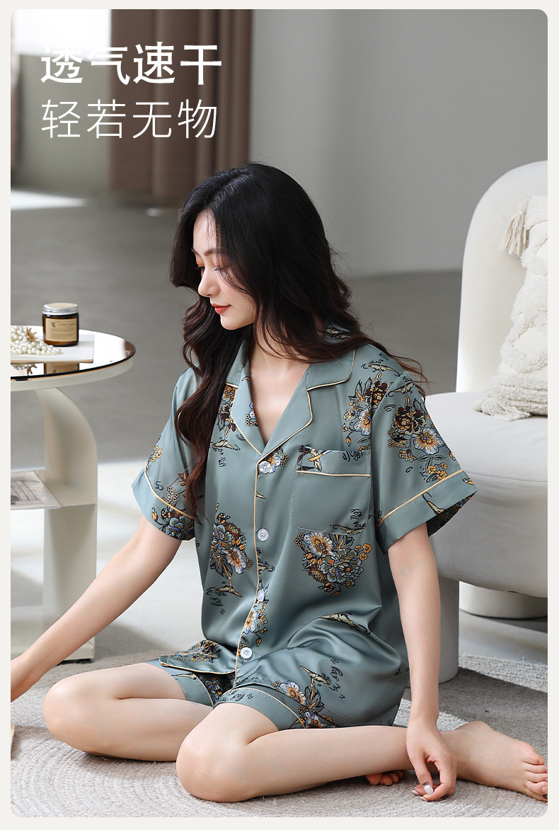 [쇼핑몰에서도 같은 스타일] 고급스러운 아이스 실크 반팔 반바지 잠옷 여성 여름 얇은 모조 실크 홈웨어 세트