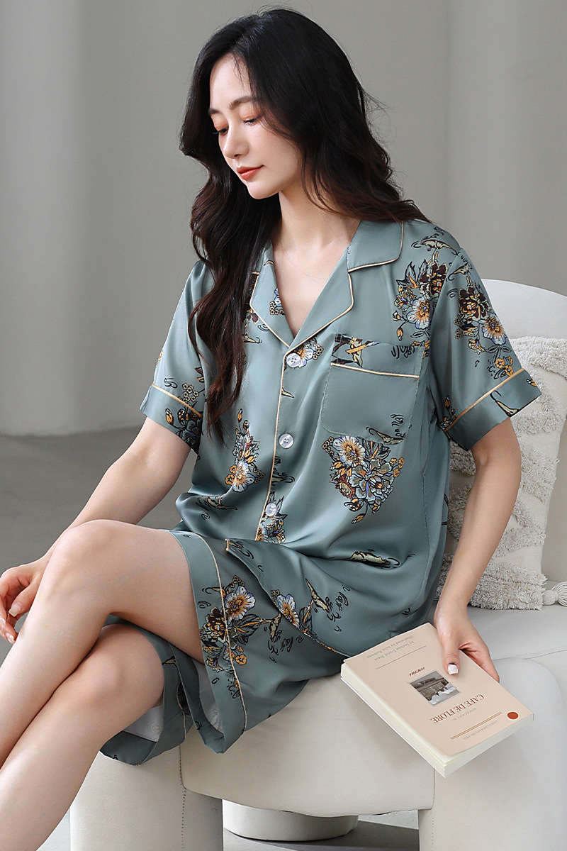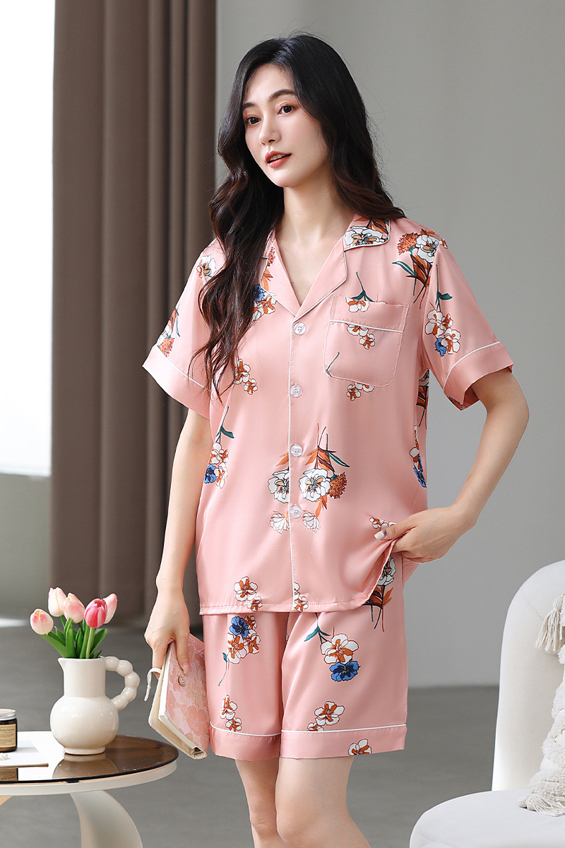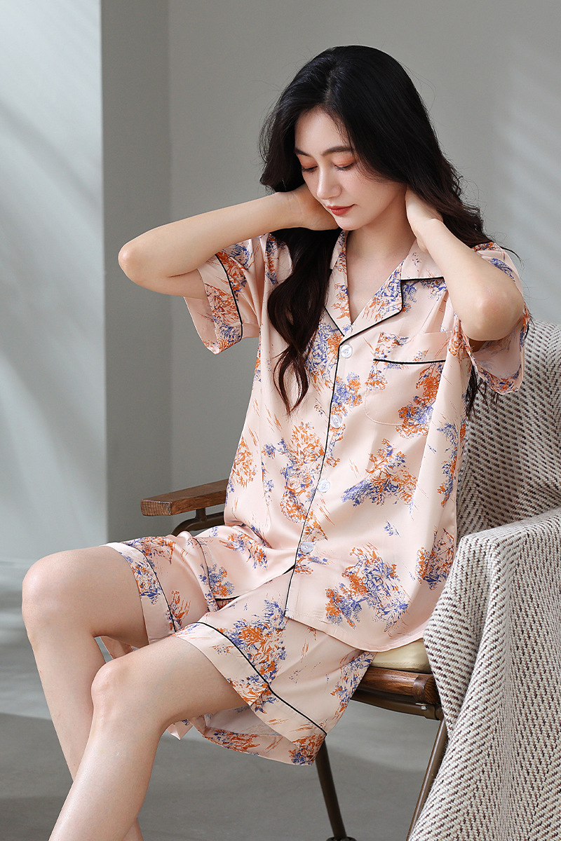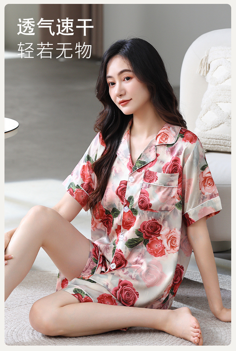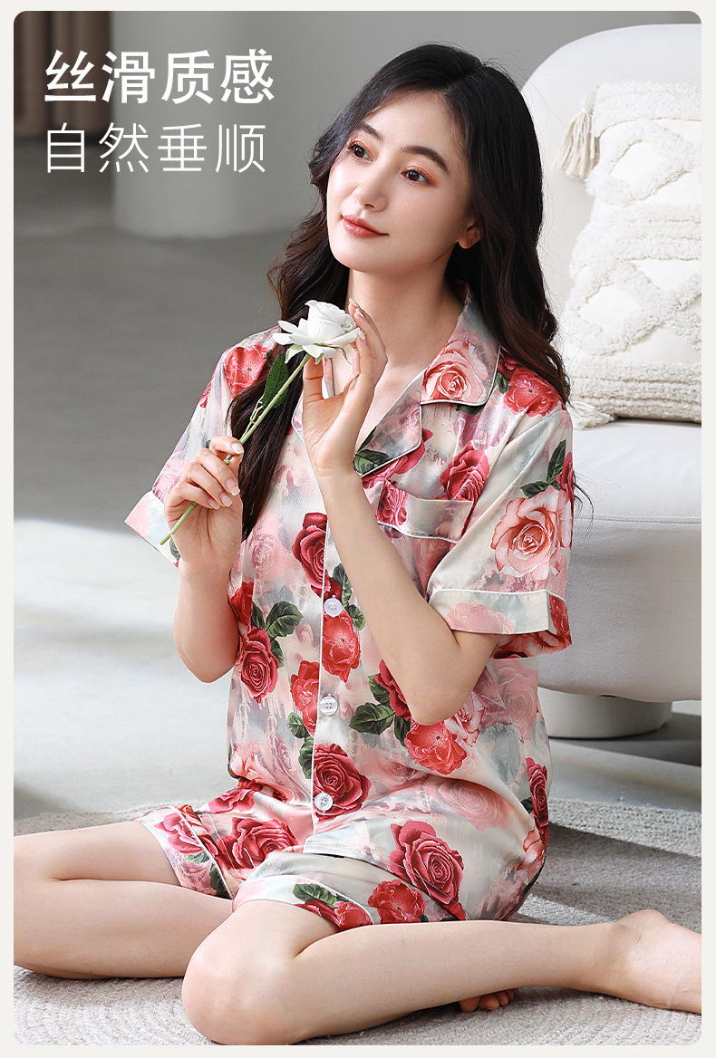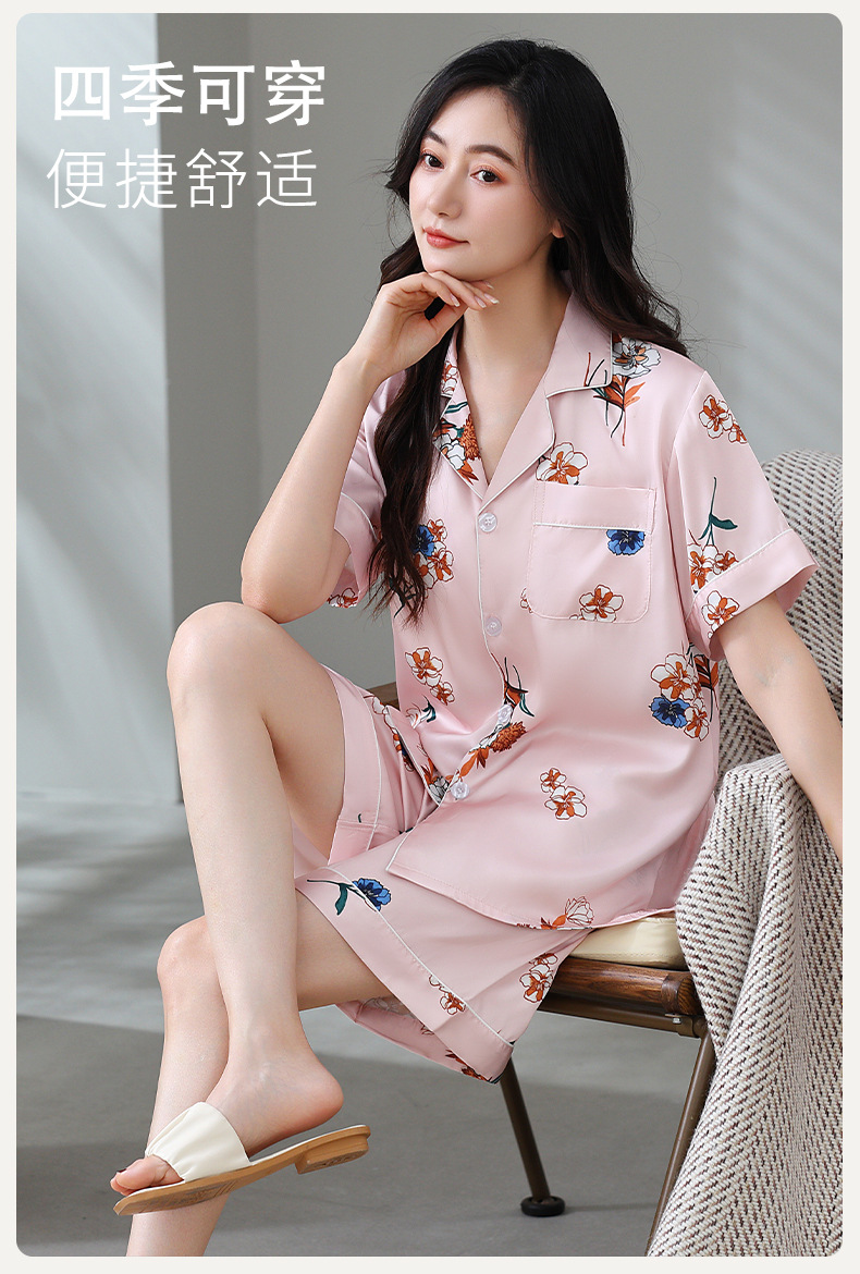 [쇼핑몰에서도 같은 스타일] 고급스러운 아이스 실크 반팔 반바지 잠옷 여성 여름 얇은 모조 실크 홈웨어 세트
