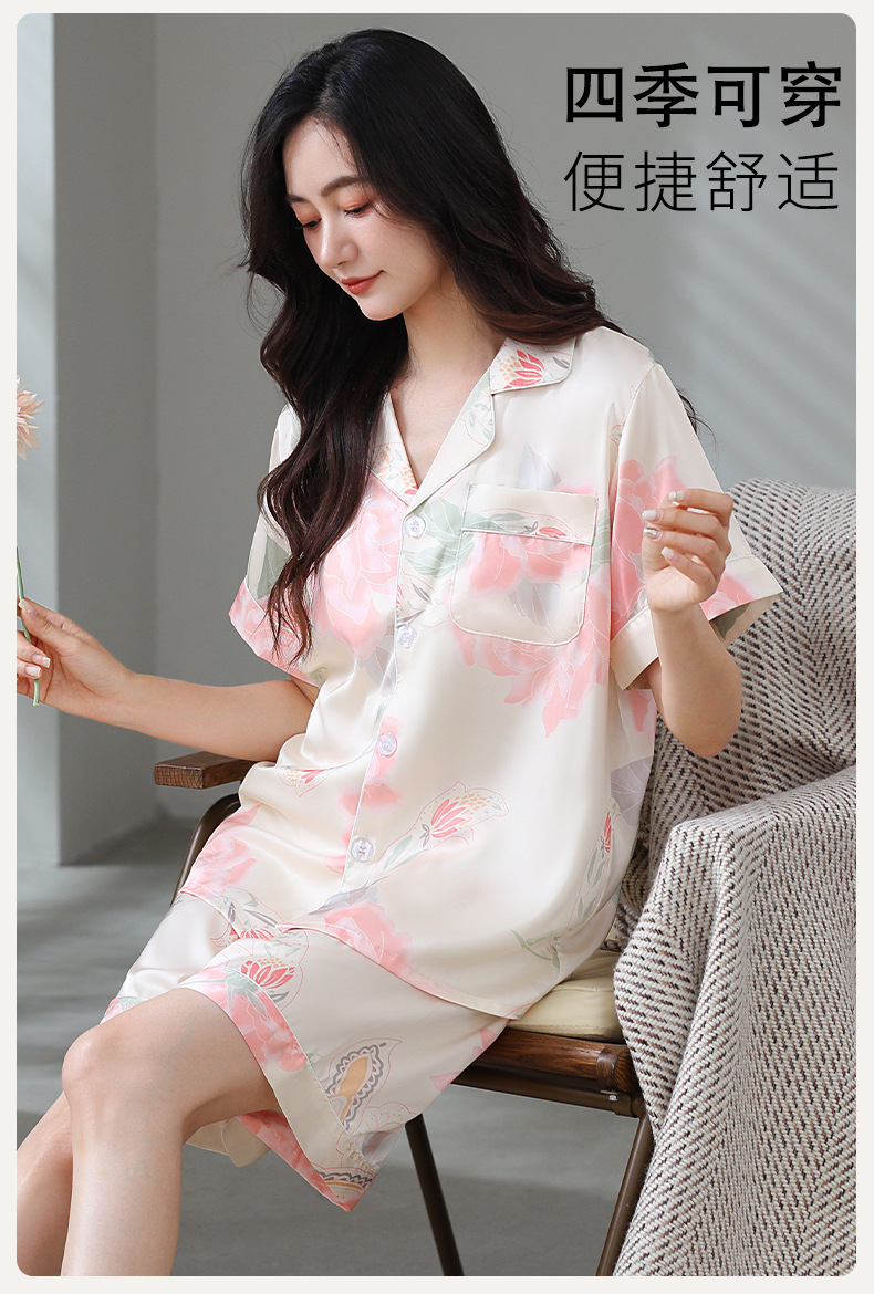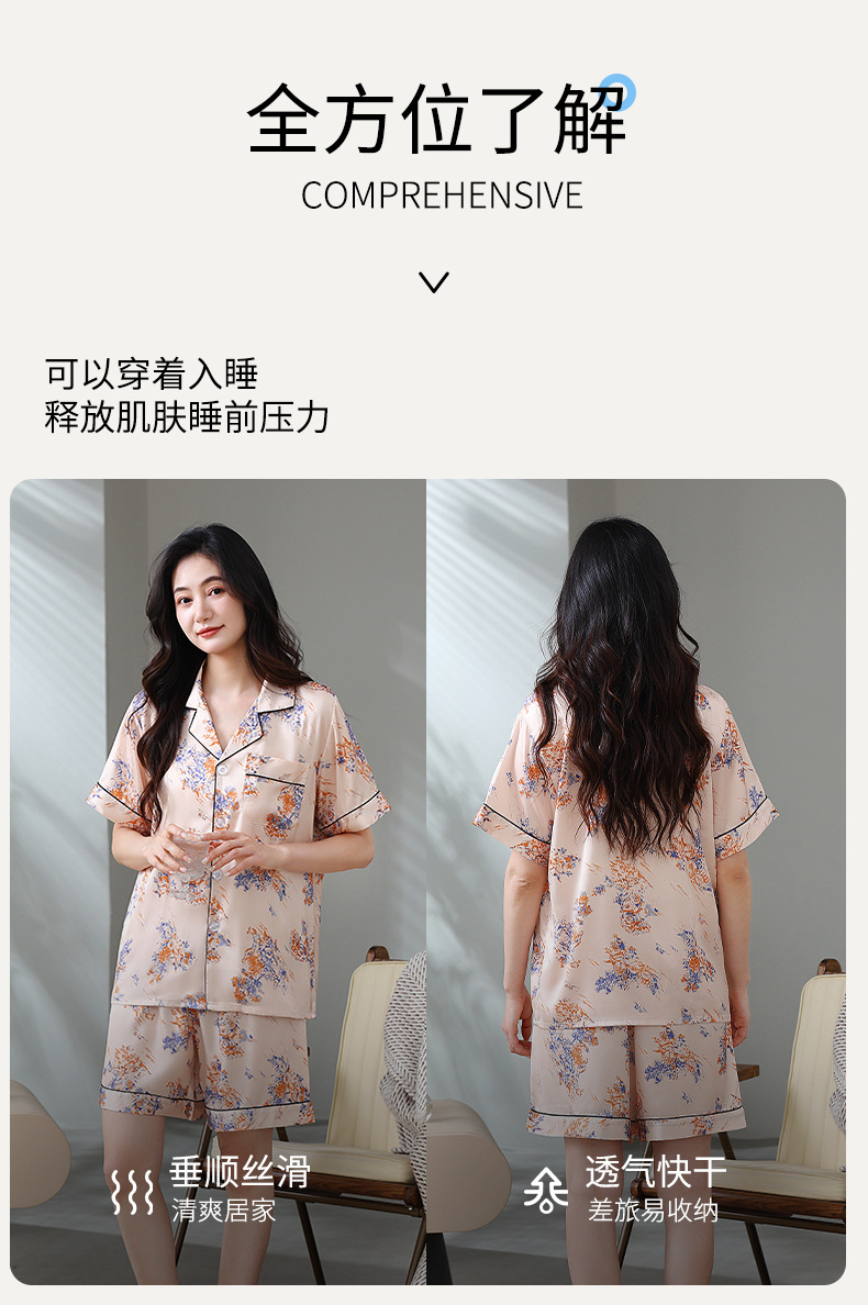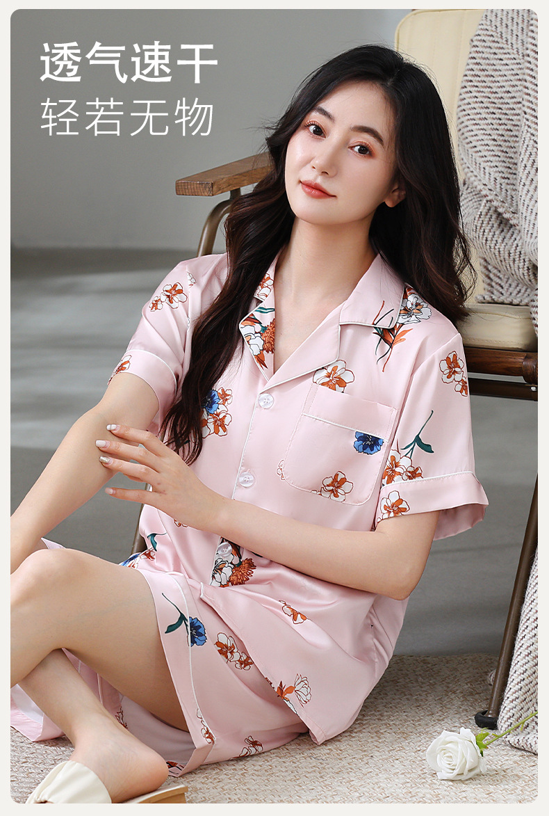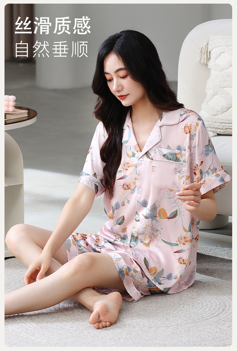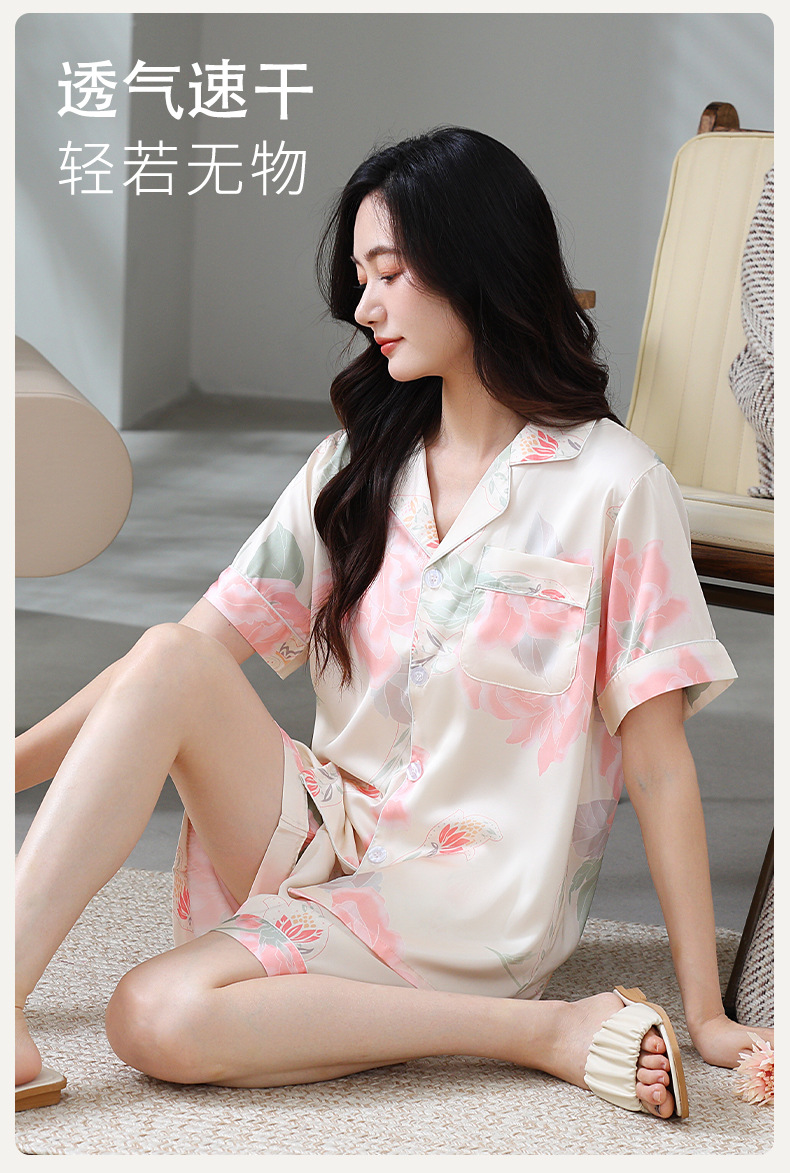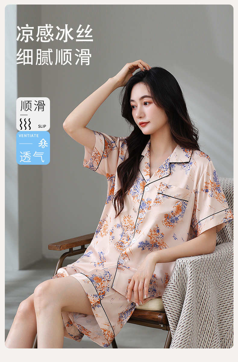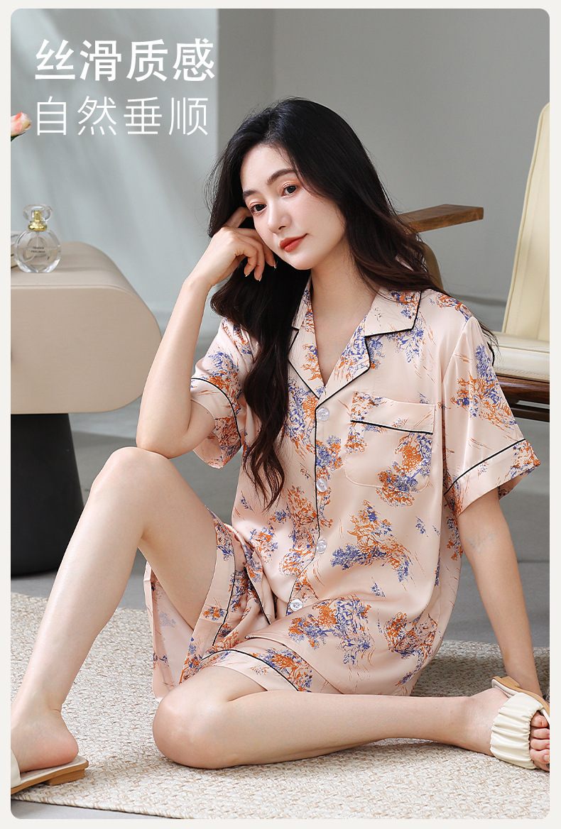 [쇼핑몰에서도 같은 스타일] 고급스러운 아이스 실크 반팔 반바지 잠옷 여성 여름 얇은 모조 실크 홈웨어 세트스토어 가기
