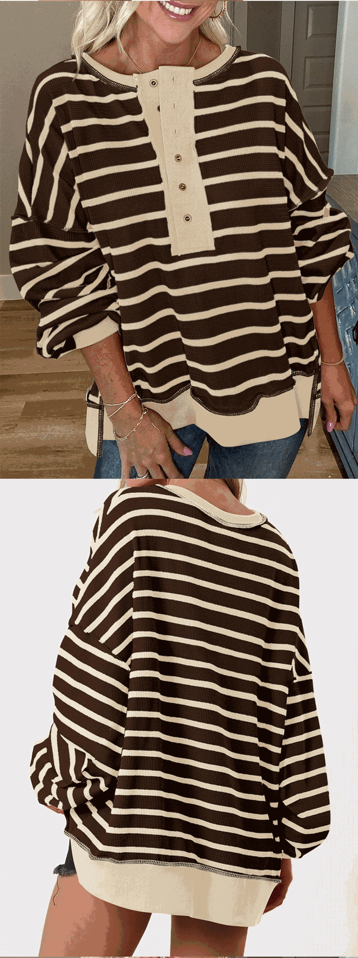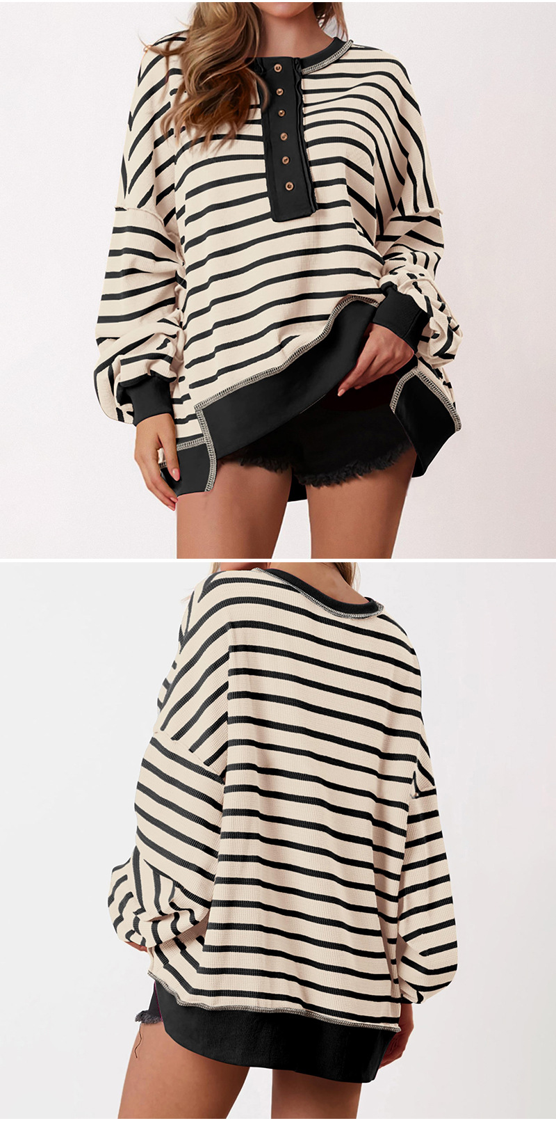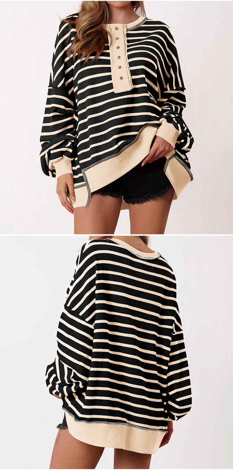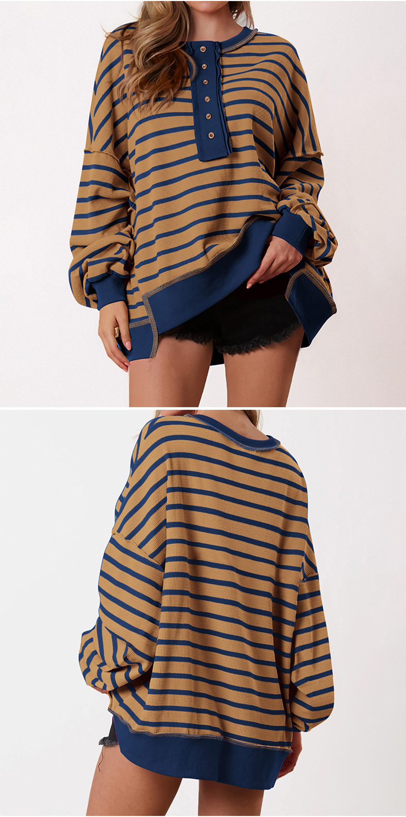 유럽 및 미국 해외 여성복 2025 아마존 가을 겨울 신상 브이넥 배색 스트라이프 루즈핏 긴팔 여성 티셔츠 상의스토어 가기