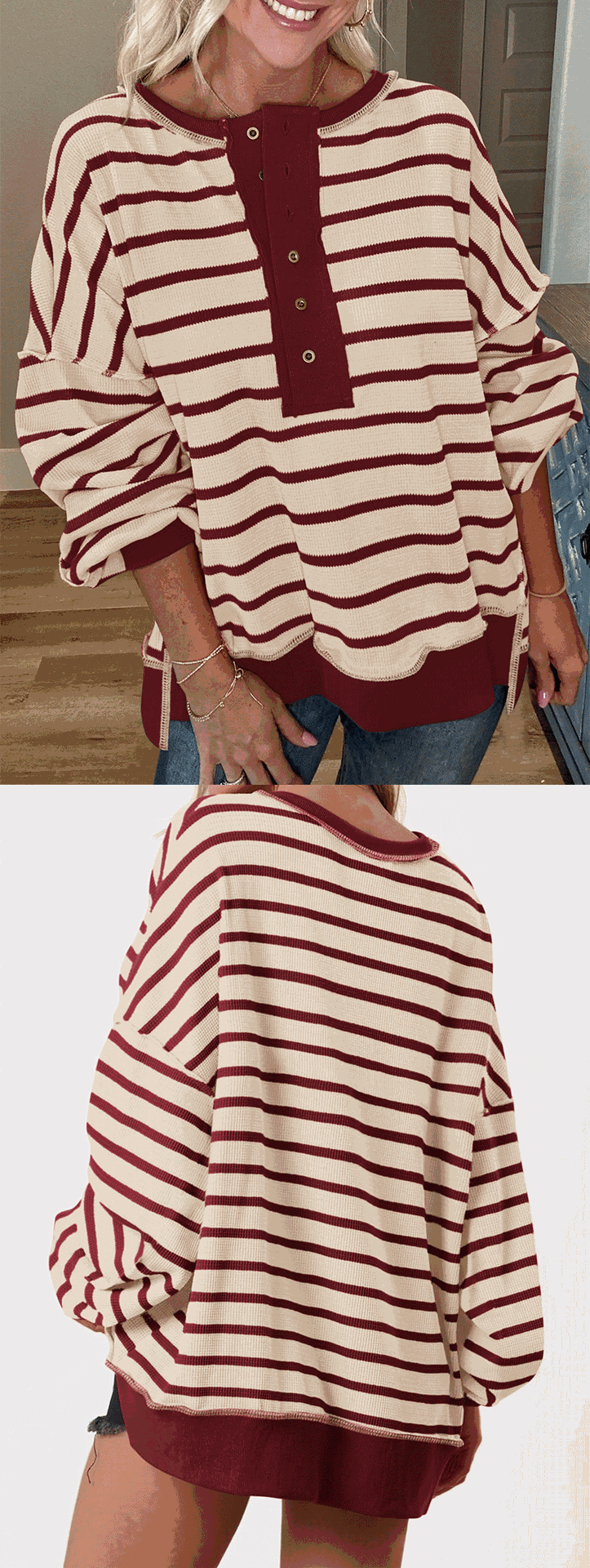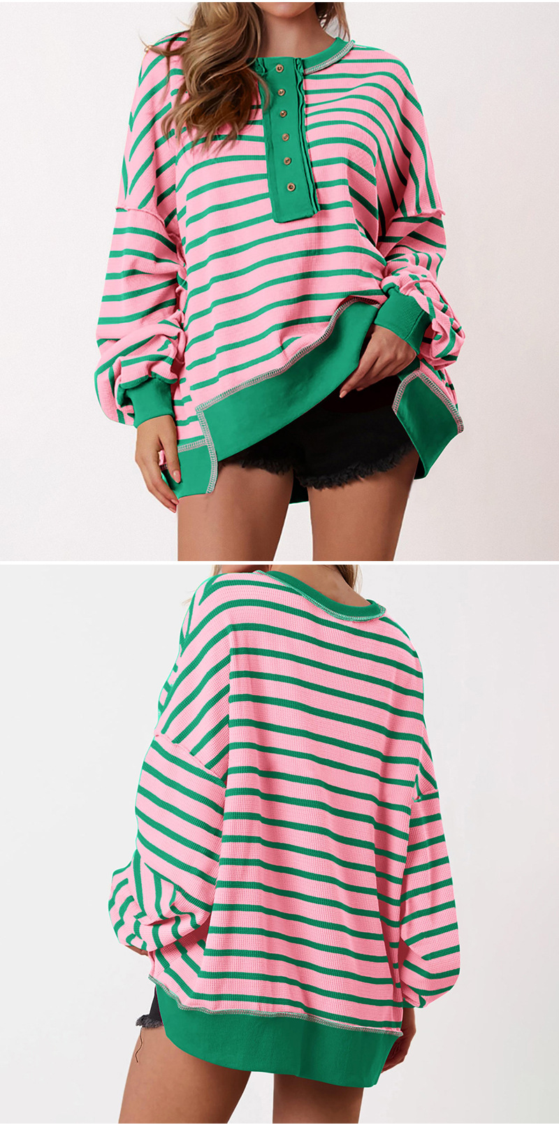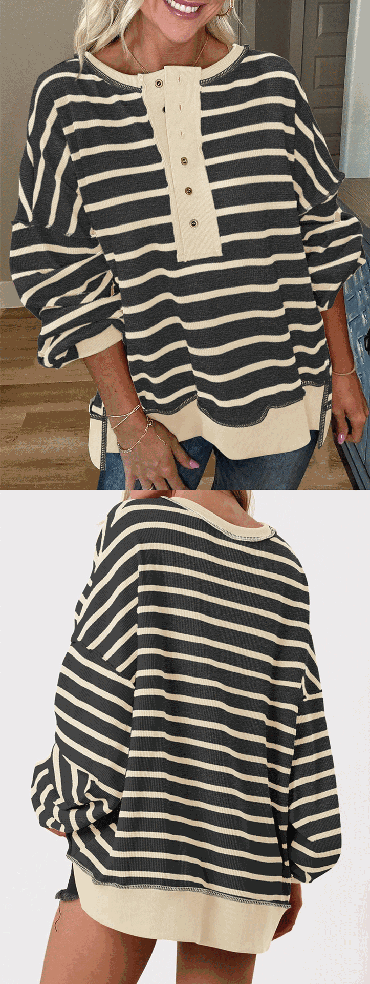 유럽 및 미국 해외 여성복 2025 아마존 가을 겨울 신상 브이넥 배색 스트라이프 루즈핏 긴팔 여성 티셔츠 상의스토어 가기