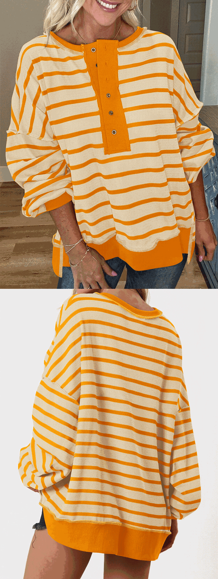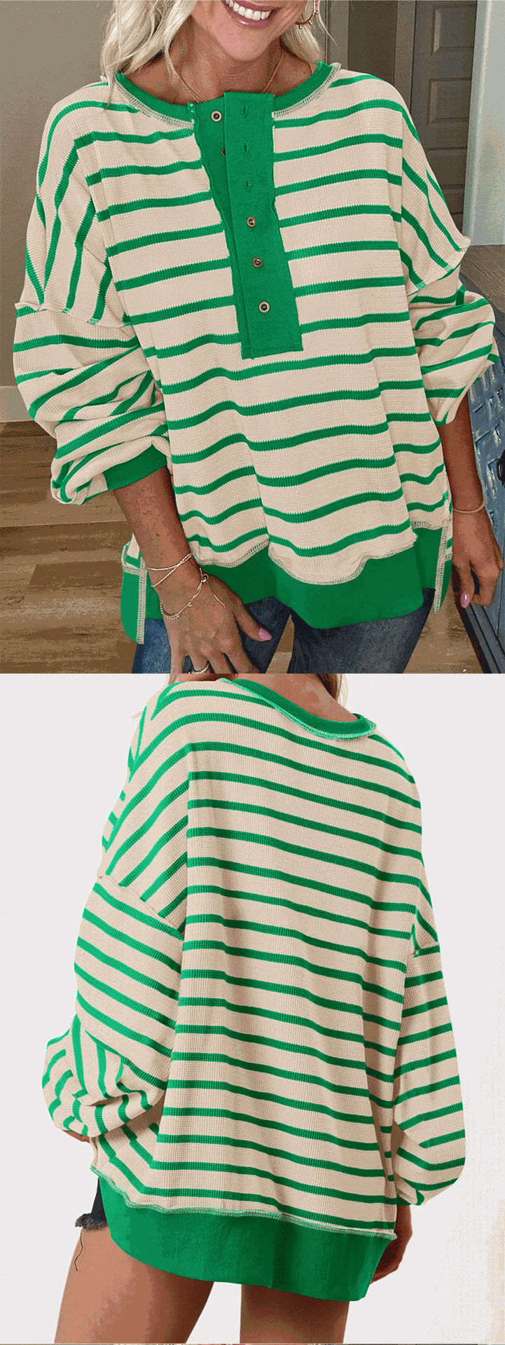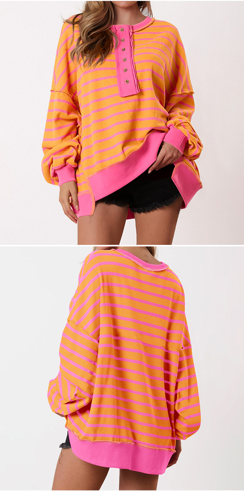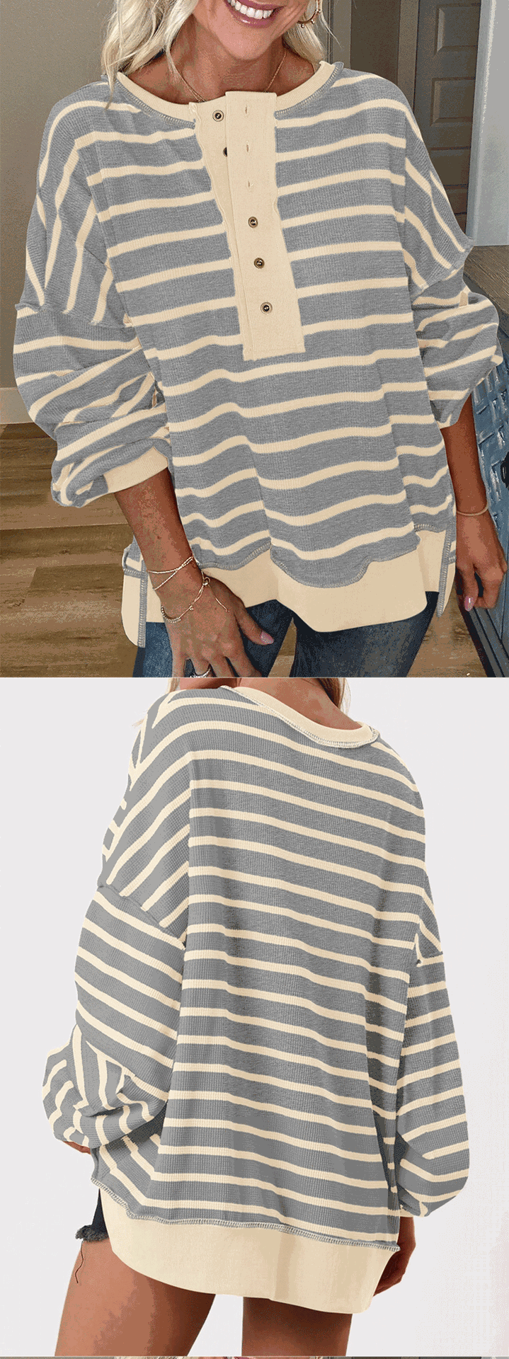 유럽 및 미국 해외 여성복 2025 아마존 가을 겨울 신상 브이넥 배색 스트라이프 루즈핏 긴팔 여성 티셔츠 상의스토어 가기