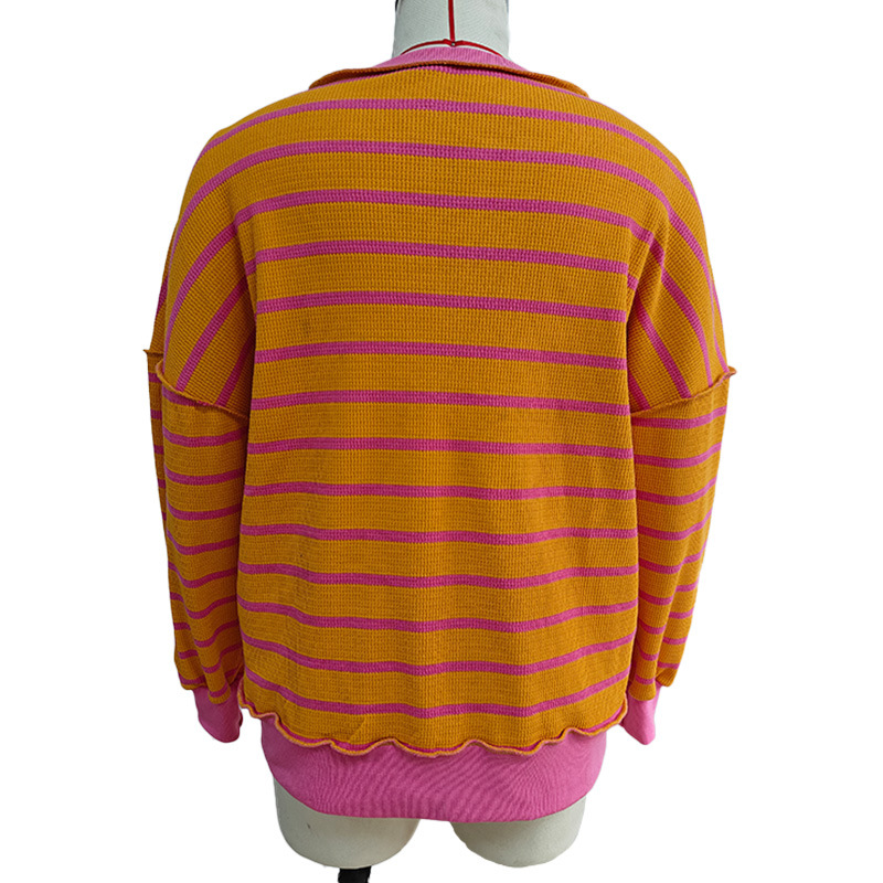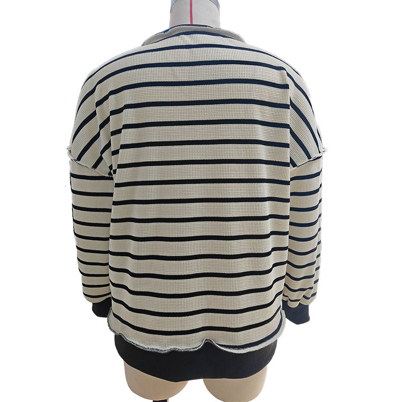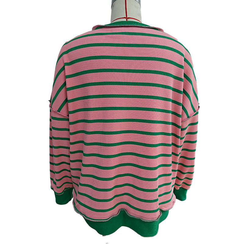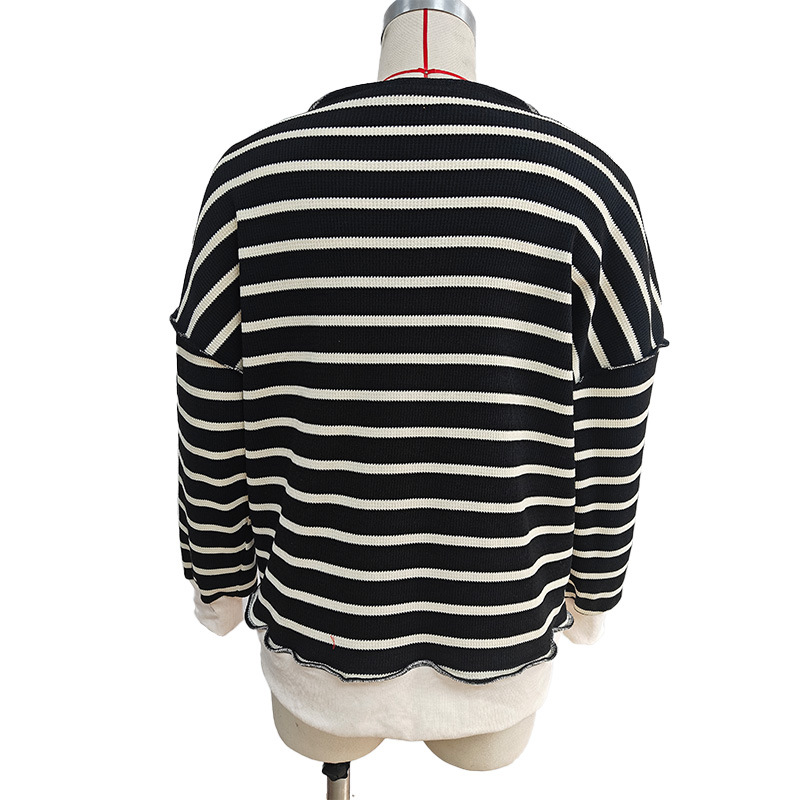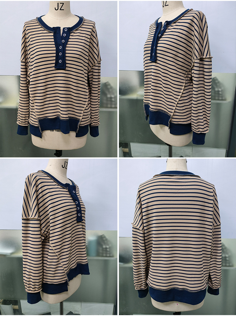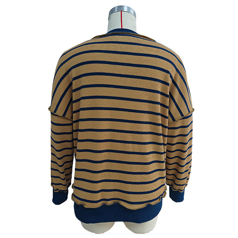 유럽 및 미국 해외 여성복 2025 아마존 가을 겨울 신상 브이넥 배색 스트라이프 루즈핏 긴팔 여성 티셔츠 상의