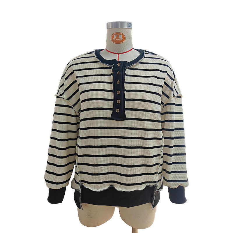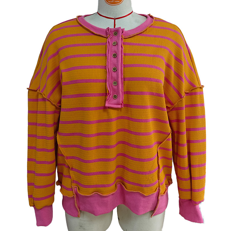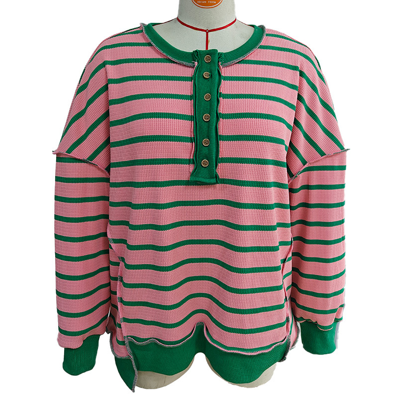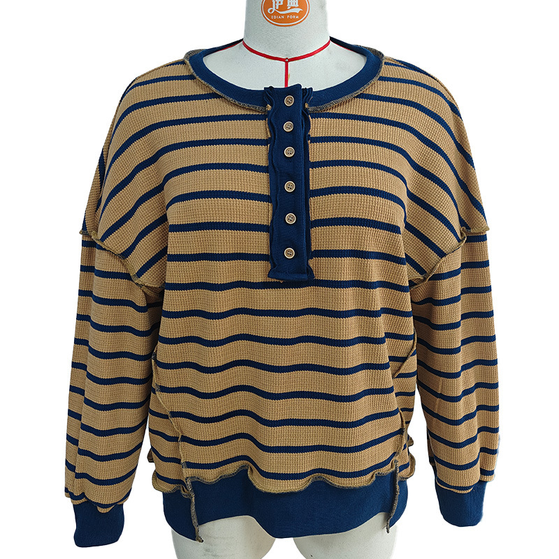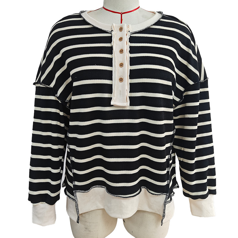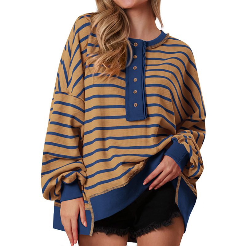유럽 및 미국 해외 여성복 2025 아마존 가을 겨울 신상 브이넥 배색 스트라이프 루즈핏 긴팔 여성 티셔츠 상의