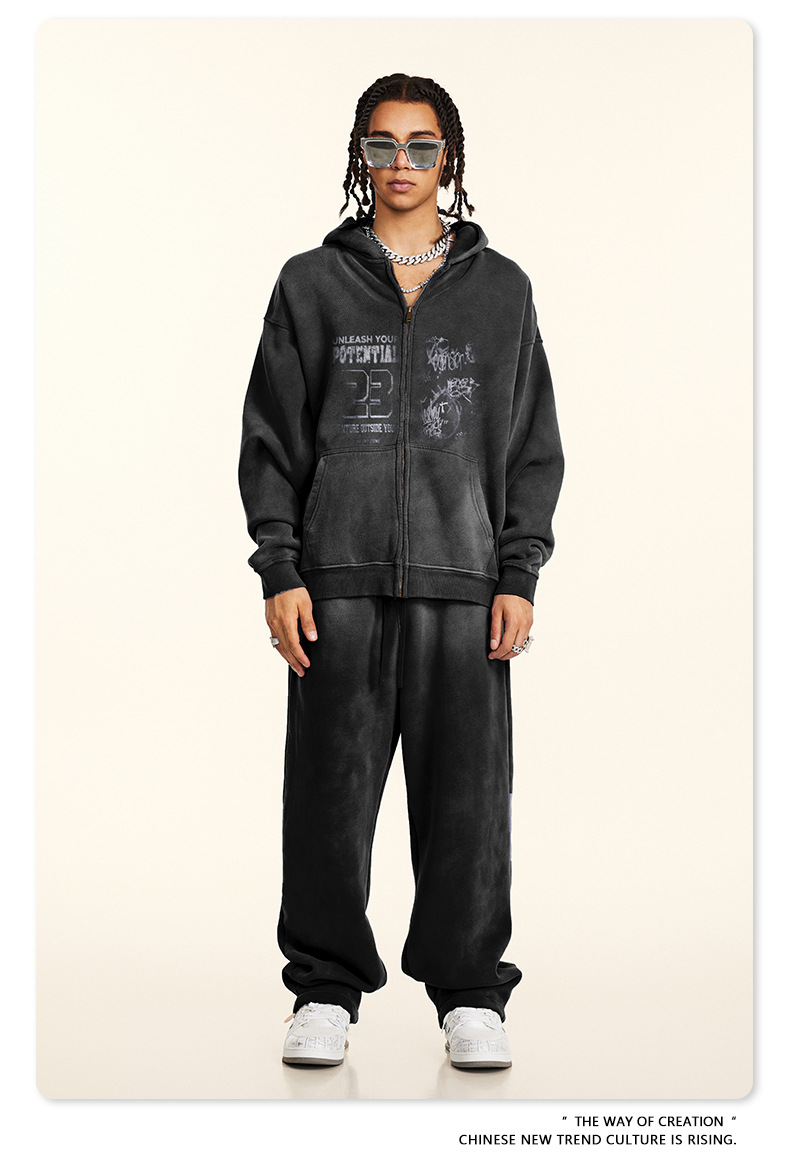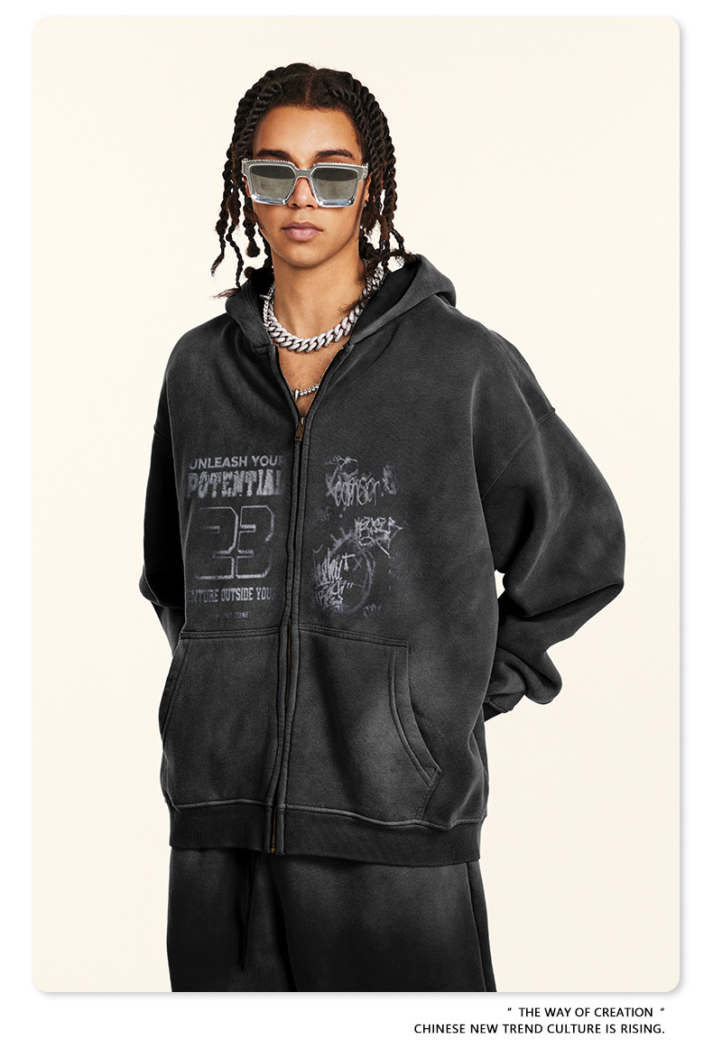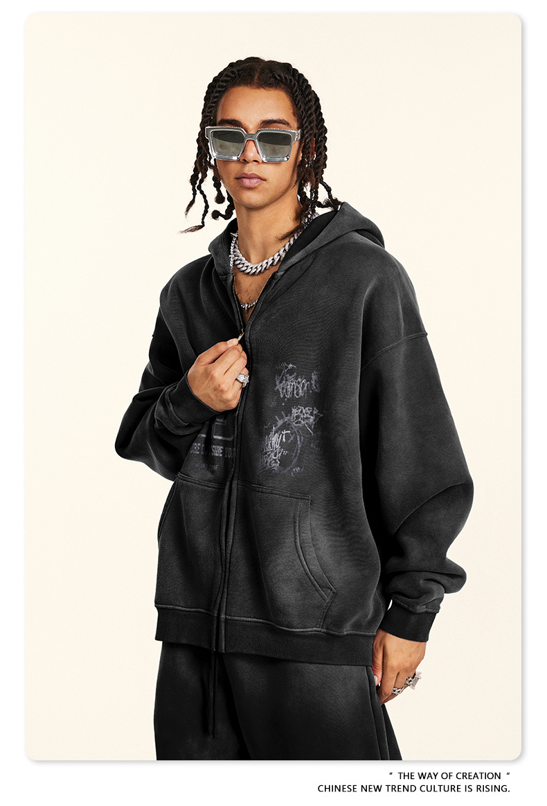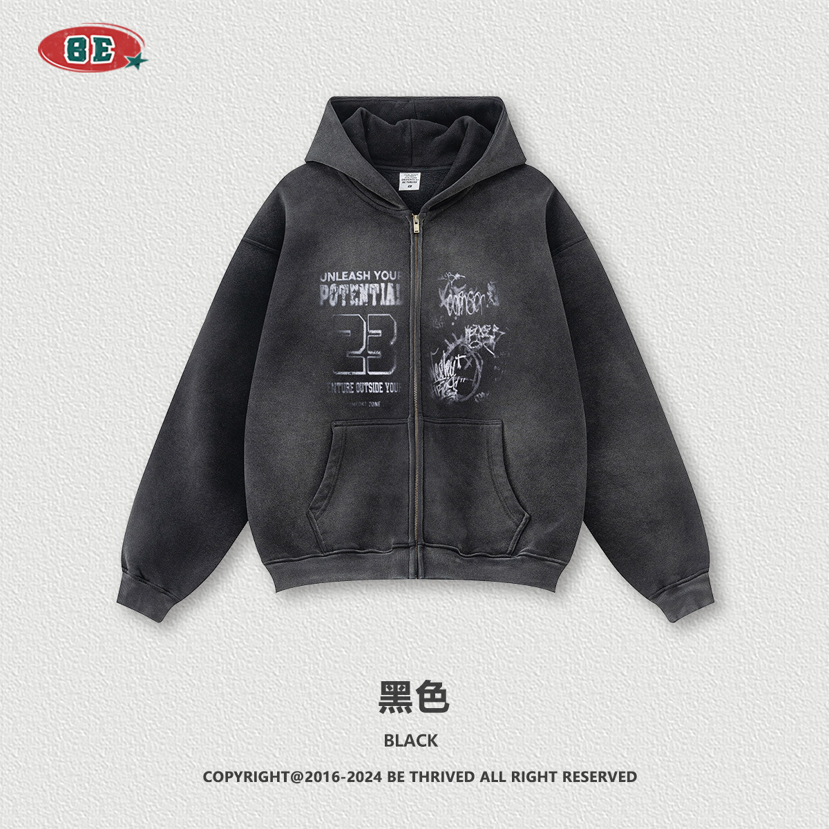 BE 남성 의류 | 2025 가을 아메리칸 하이 스트리트 빈티지 프린트 벨벳 두꺼운 지퍼 후드 스웨트셔츠 가디건 남성용