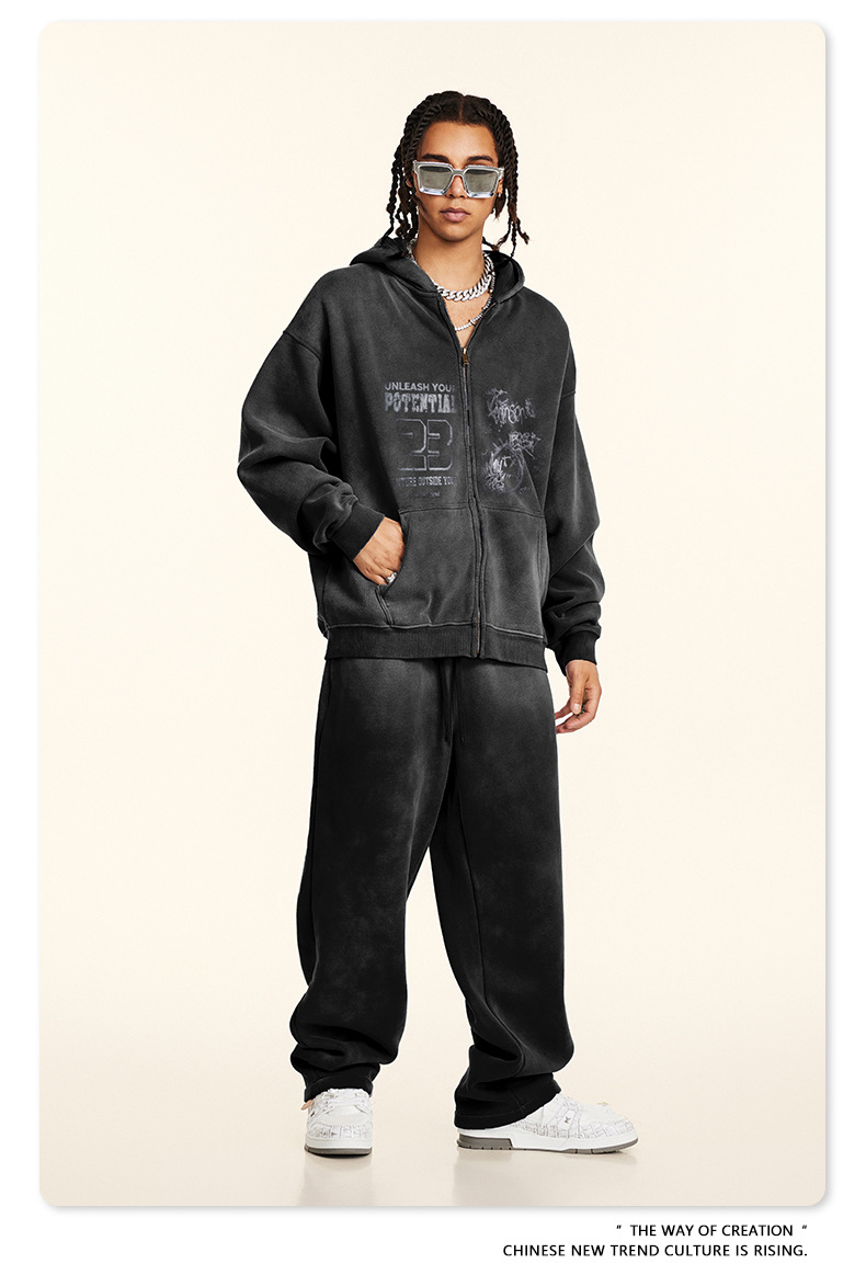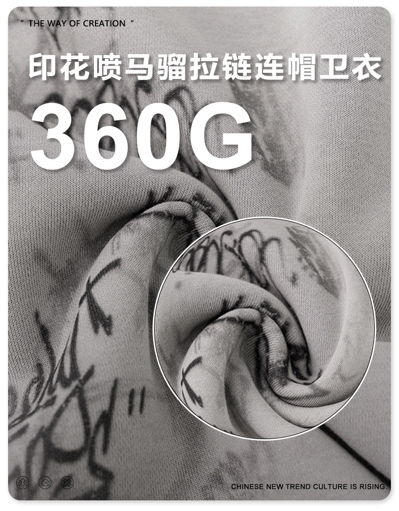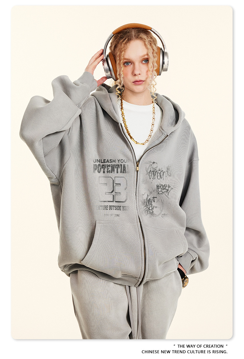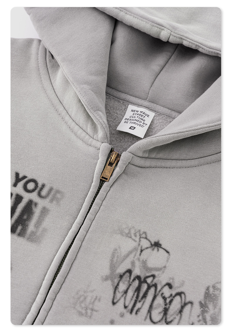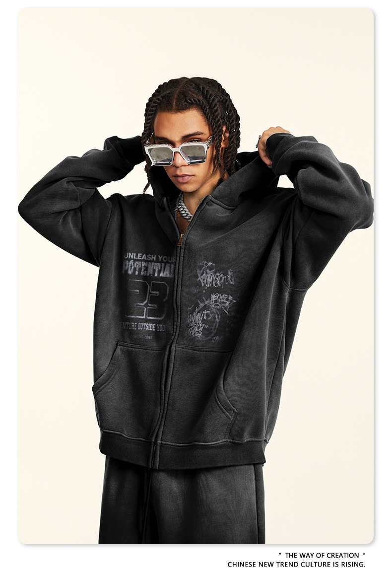 BE 남성 의류 | 2025 가을 아메리칸 하이 스트리트 빈티지 프린트 벨벳 두꺼운 지퍼 후드 스웨트셔츠 가디건 남성용