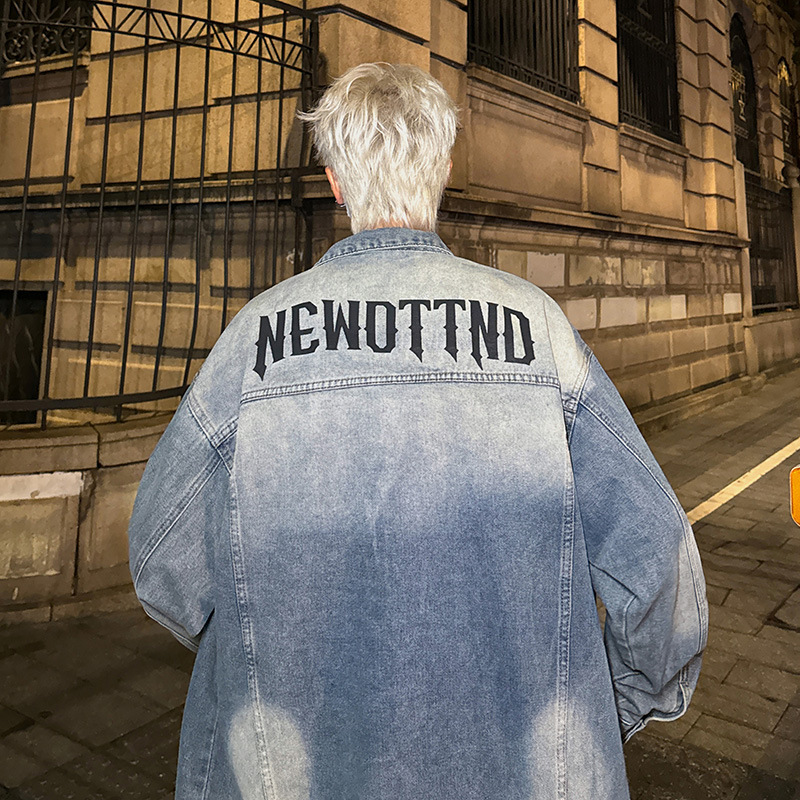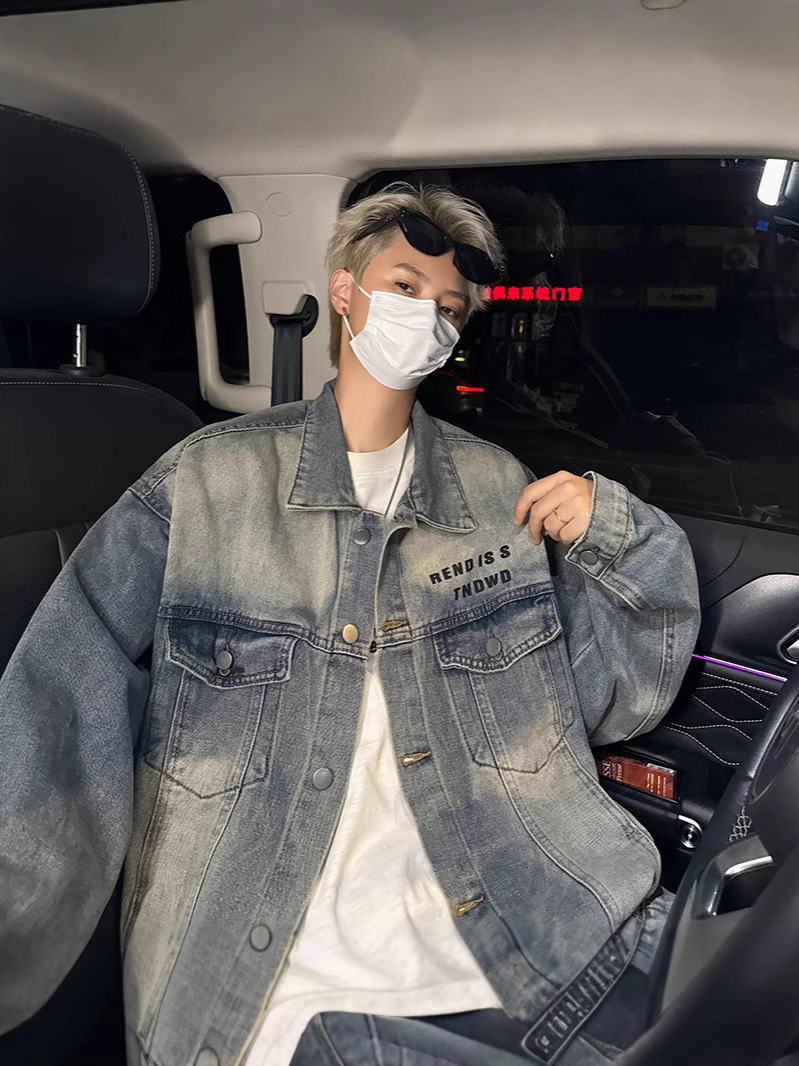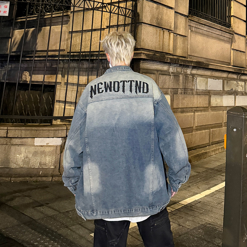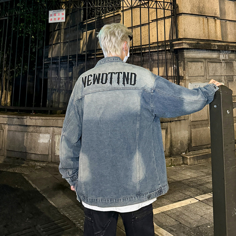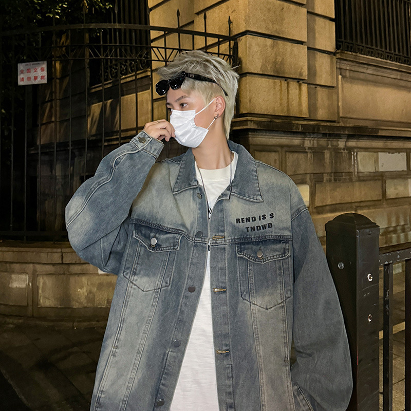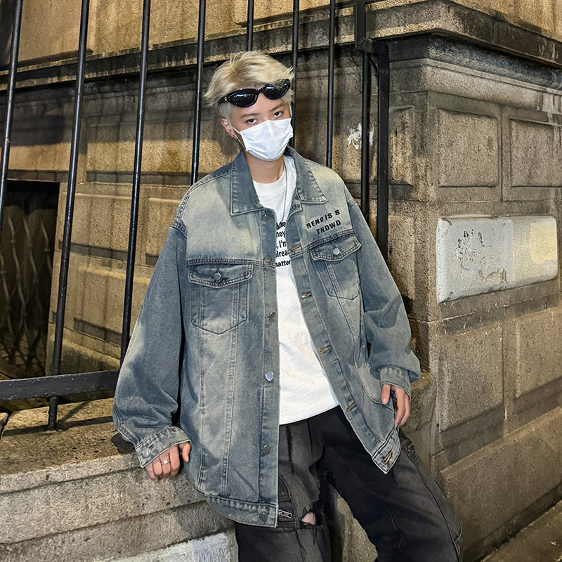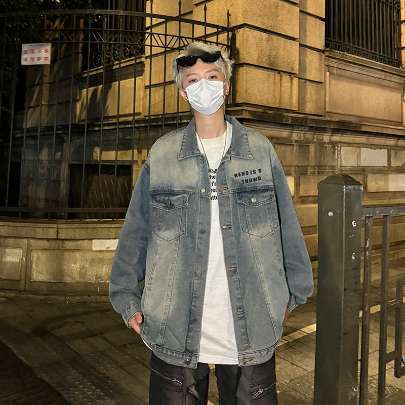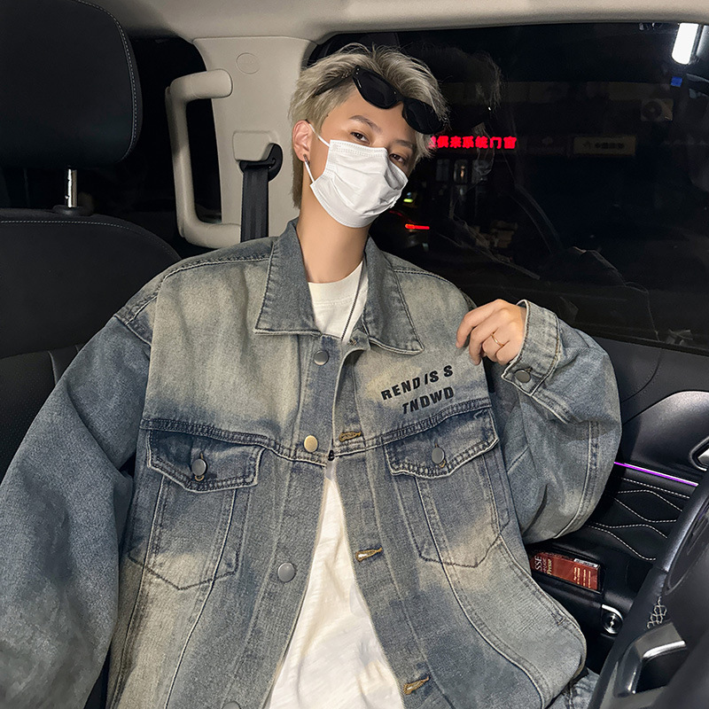 데님 자켓 남성용 가을 빈티지 미국 옷깃 데님 재킷 잘 생긴 편지 가죽 압력 데님 재킷스토어 가기