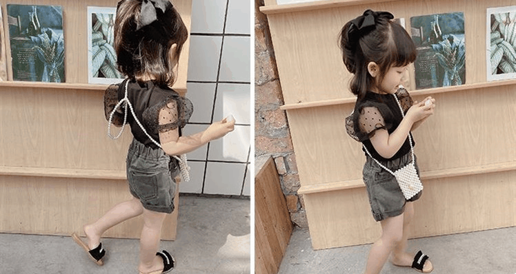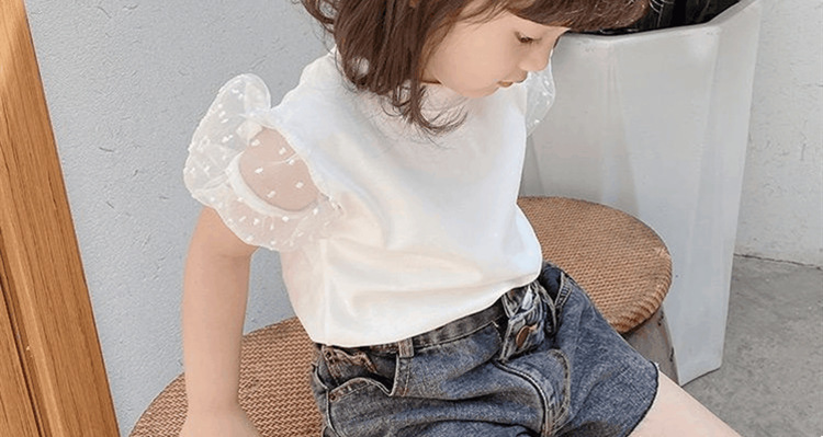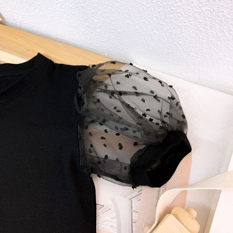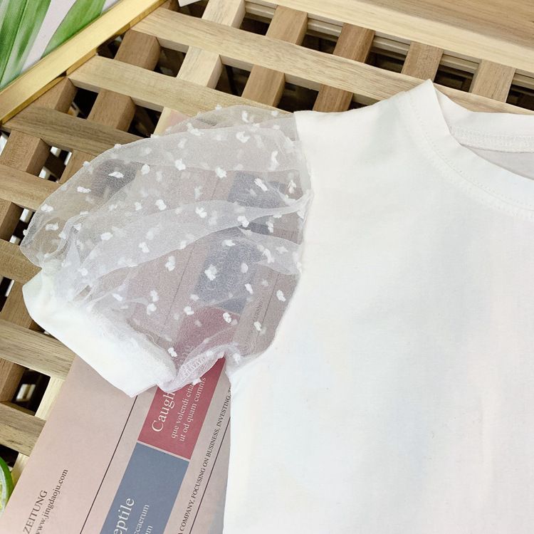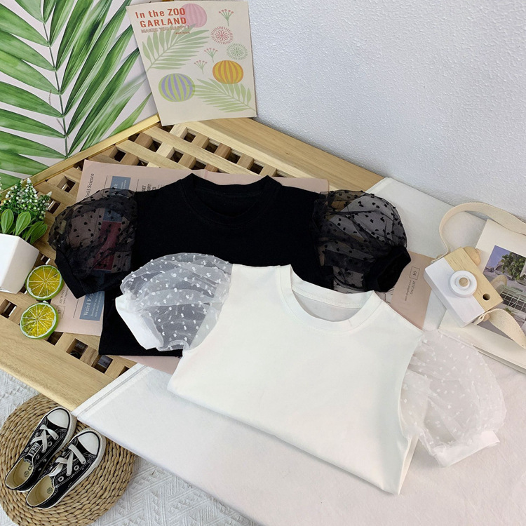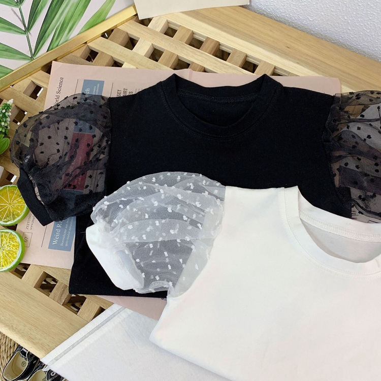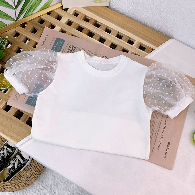 2025 한국어 버전 새로운 퍼프 슬리브 소녀 티셔츠 반팔 여름 메쉬 스플 라이스 중소형 소녀 기본 셔츠 dropshipping스토어 가기