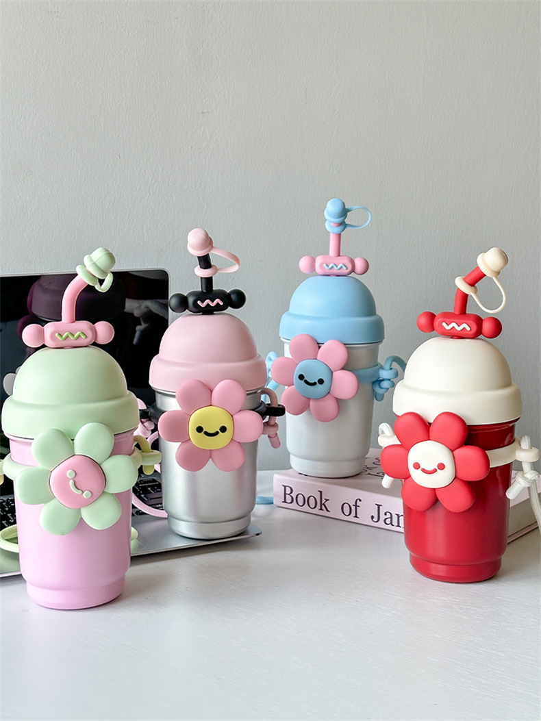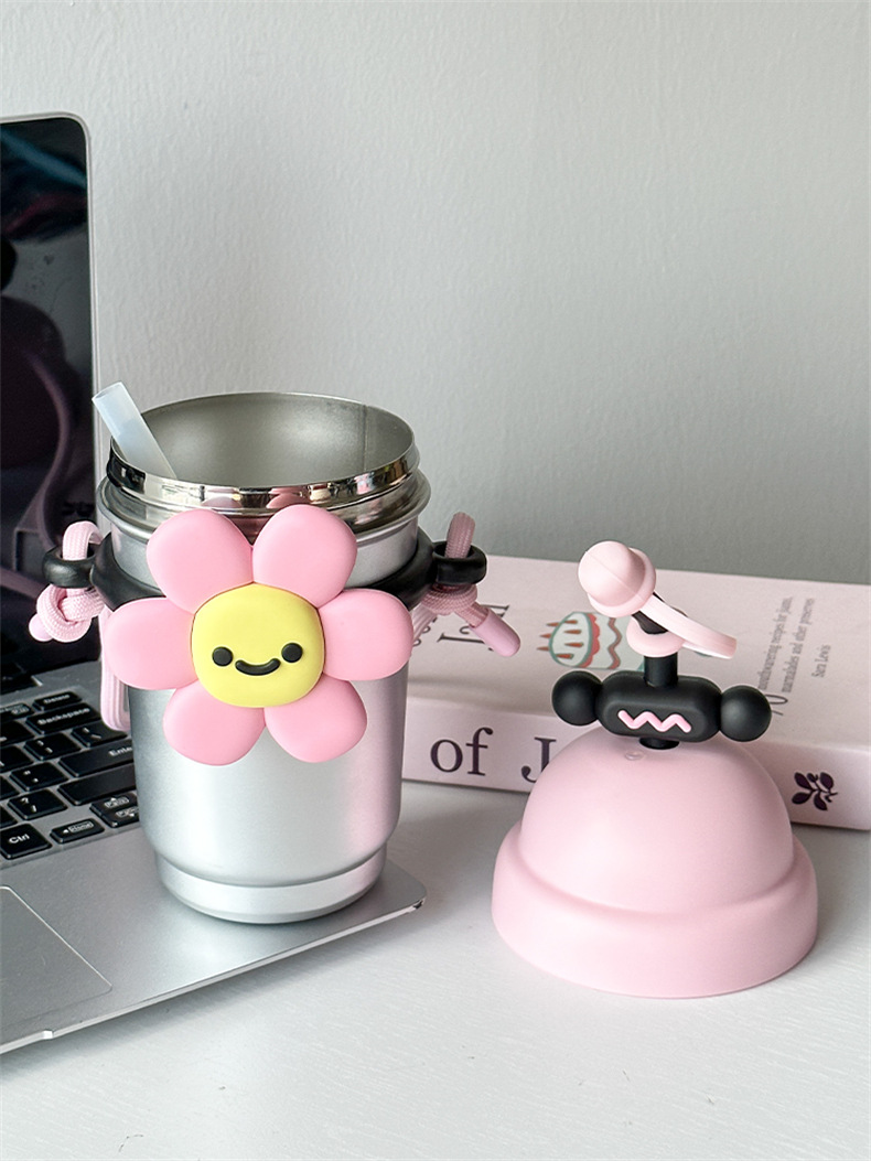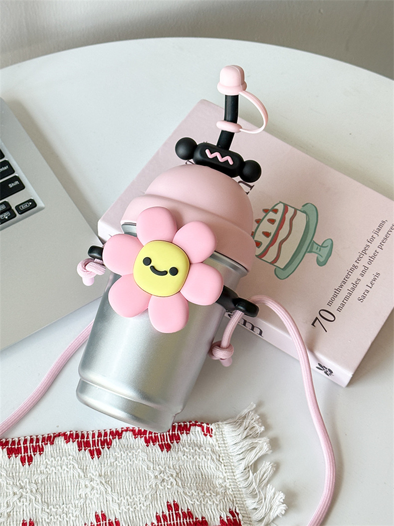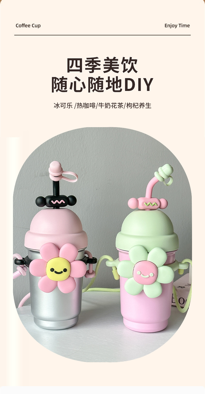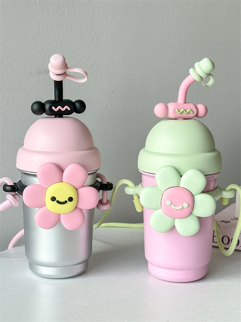 여성용 물컵 2025 새로운 해바라기 보온병 컵 대용량 고가 스테인레스 스틸 밀짚 휴대용 대각선 컵