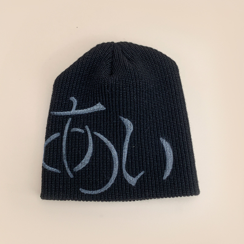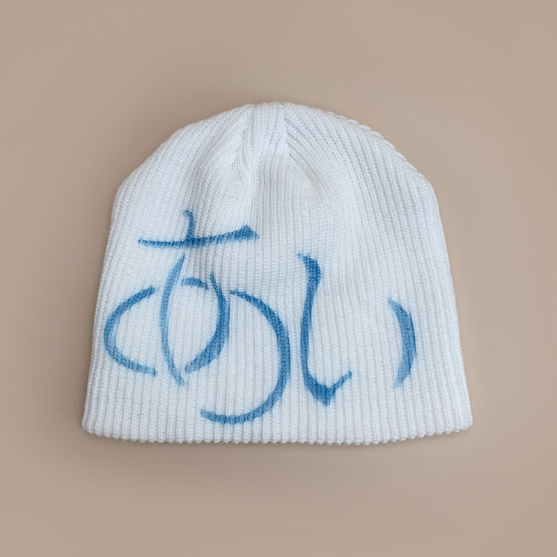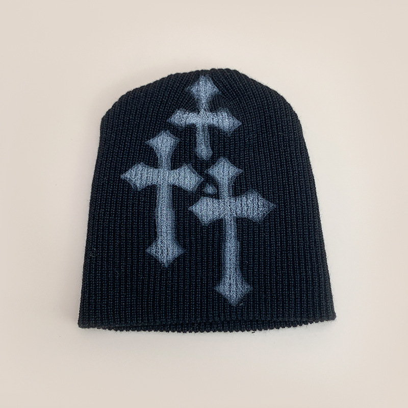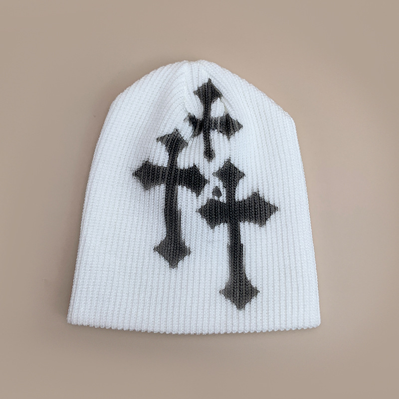 남성과 여성을위한 새로운 개인화 된 일본 산스크리트어 크로스 프린트 니트 모자 따뜻한 Y2K 거리 풀오버 모자 도매스토어 가기