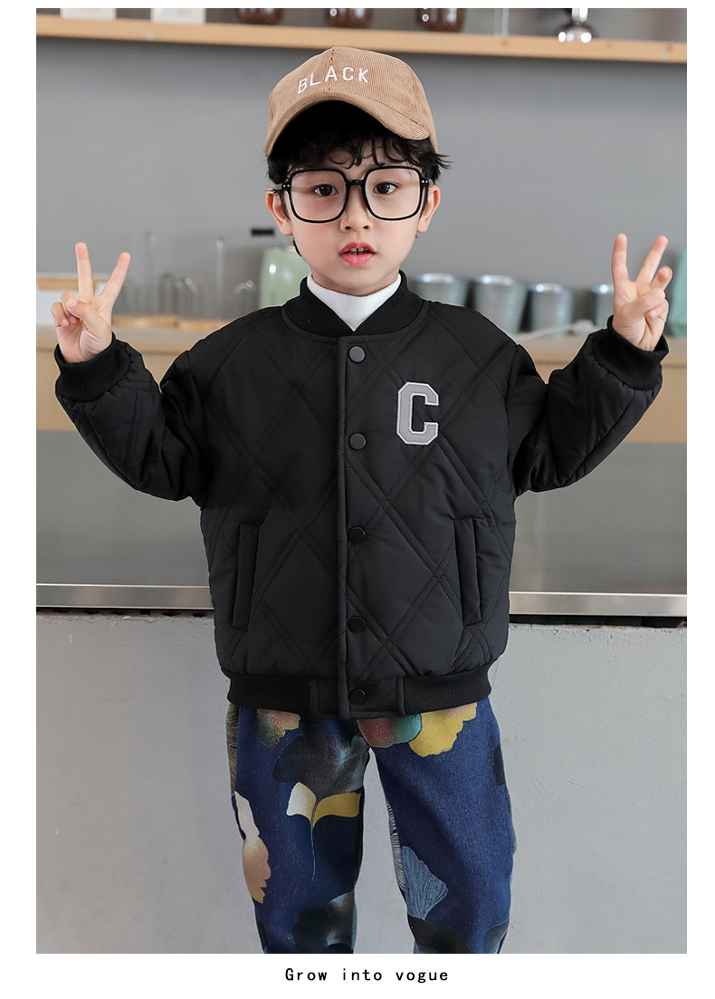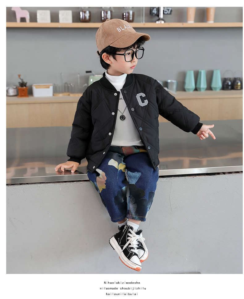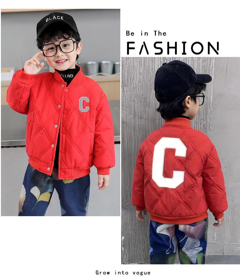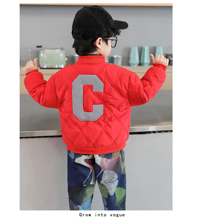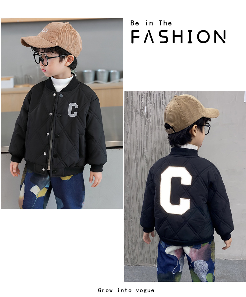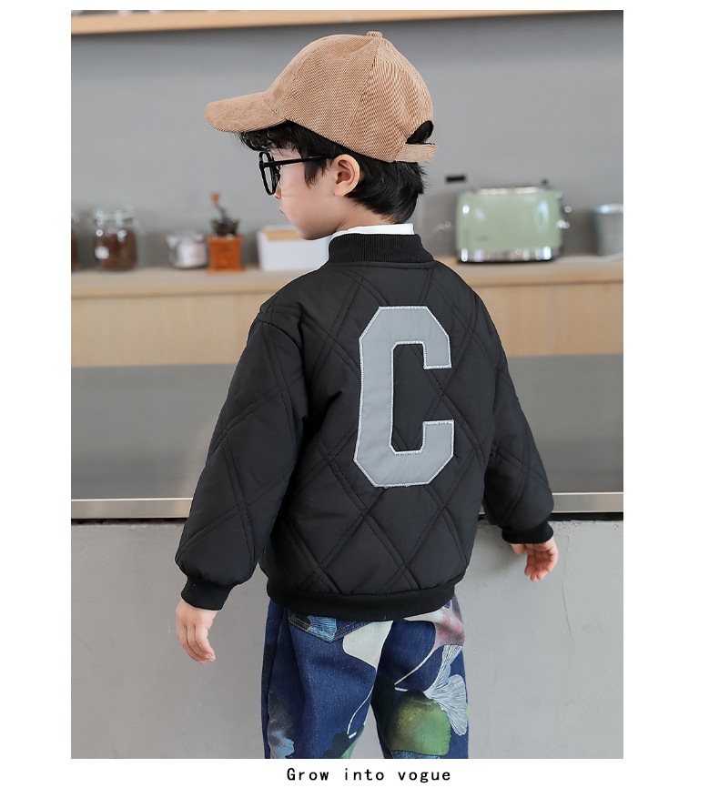 남아용 반사재가 있는 대형 C 자수 야구점퍼, 가을 겨울용 아동용 짧은 면옷, 멋진 아기용 두꺼운 면옷스토어 가기