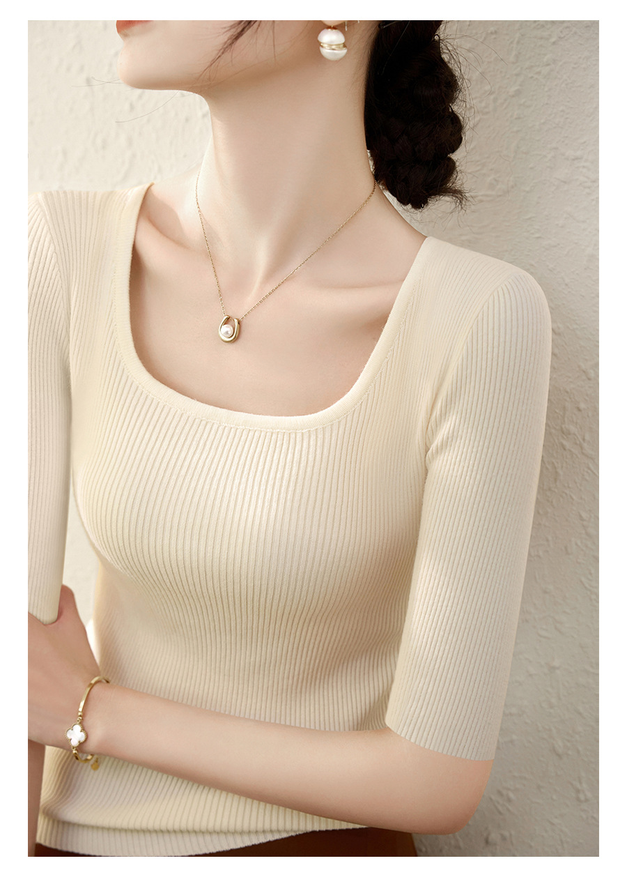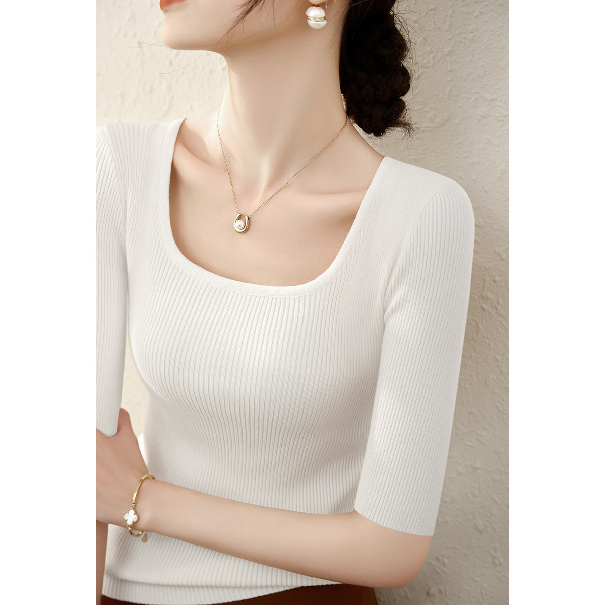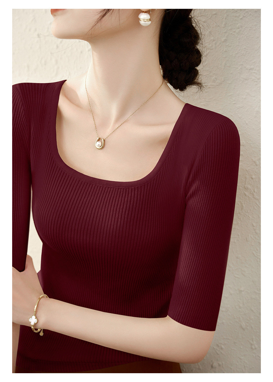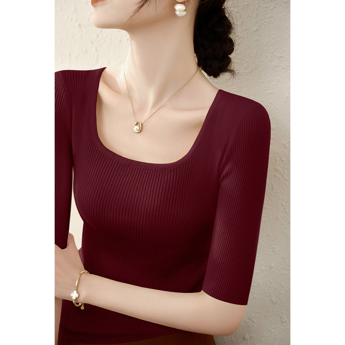 앙고라 레드 슬림 핏 스웨터 여성의 새로운 가을 단색 양모 베이스 탑 반 소매 스퀘어 넥 스웨터