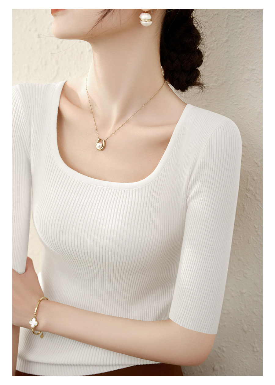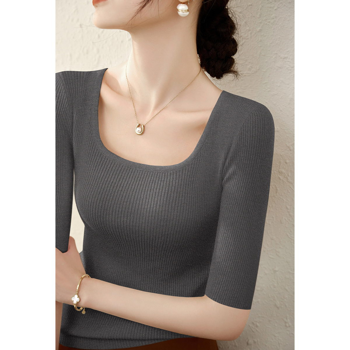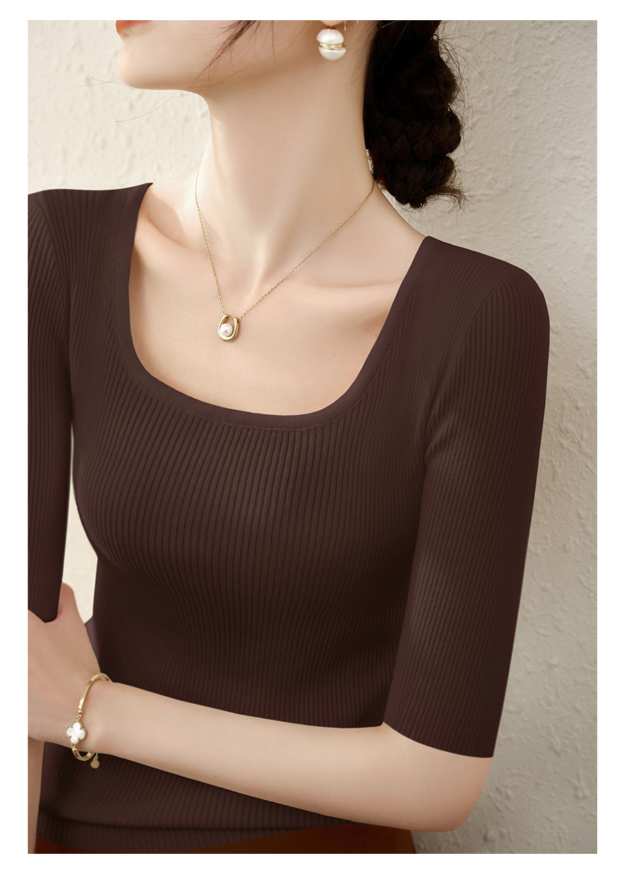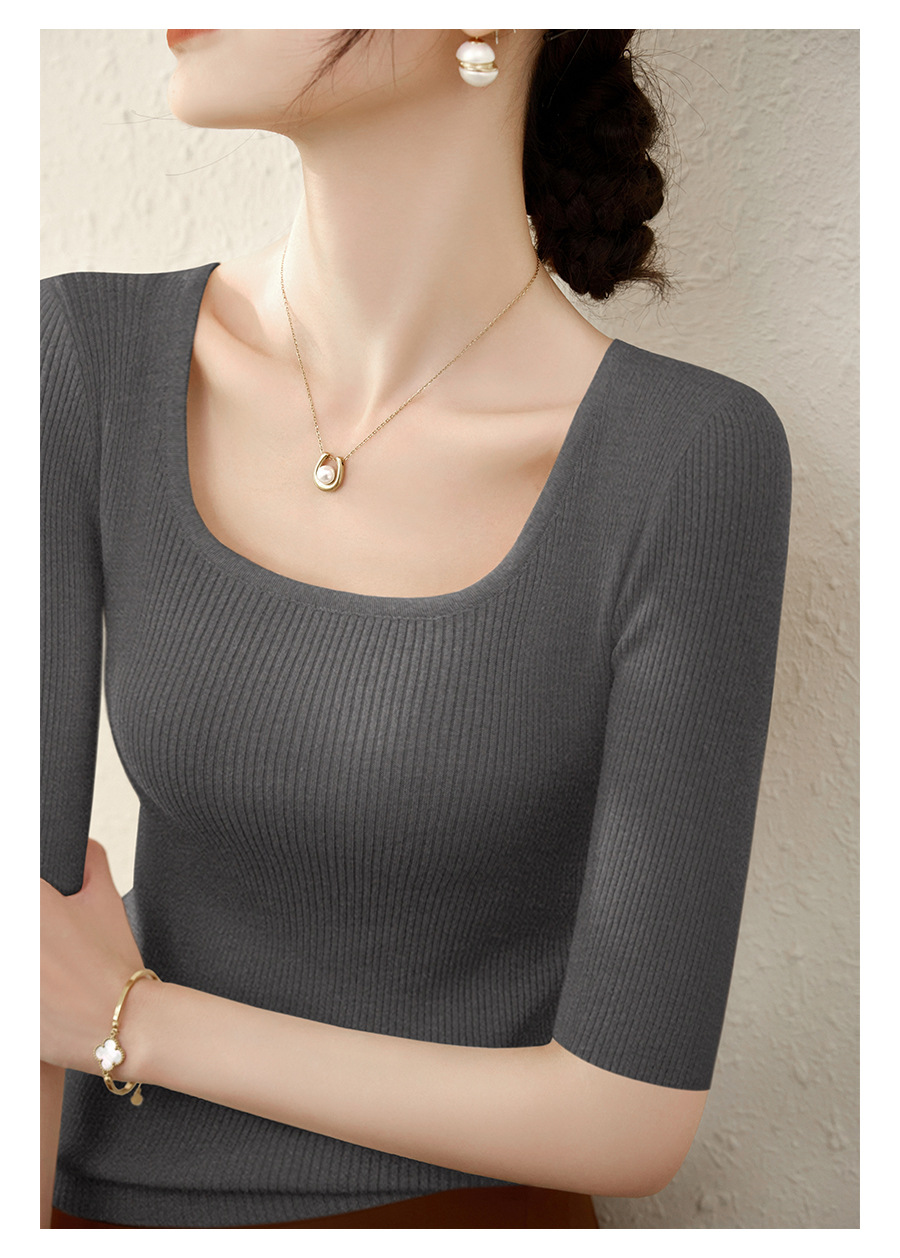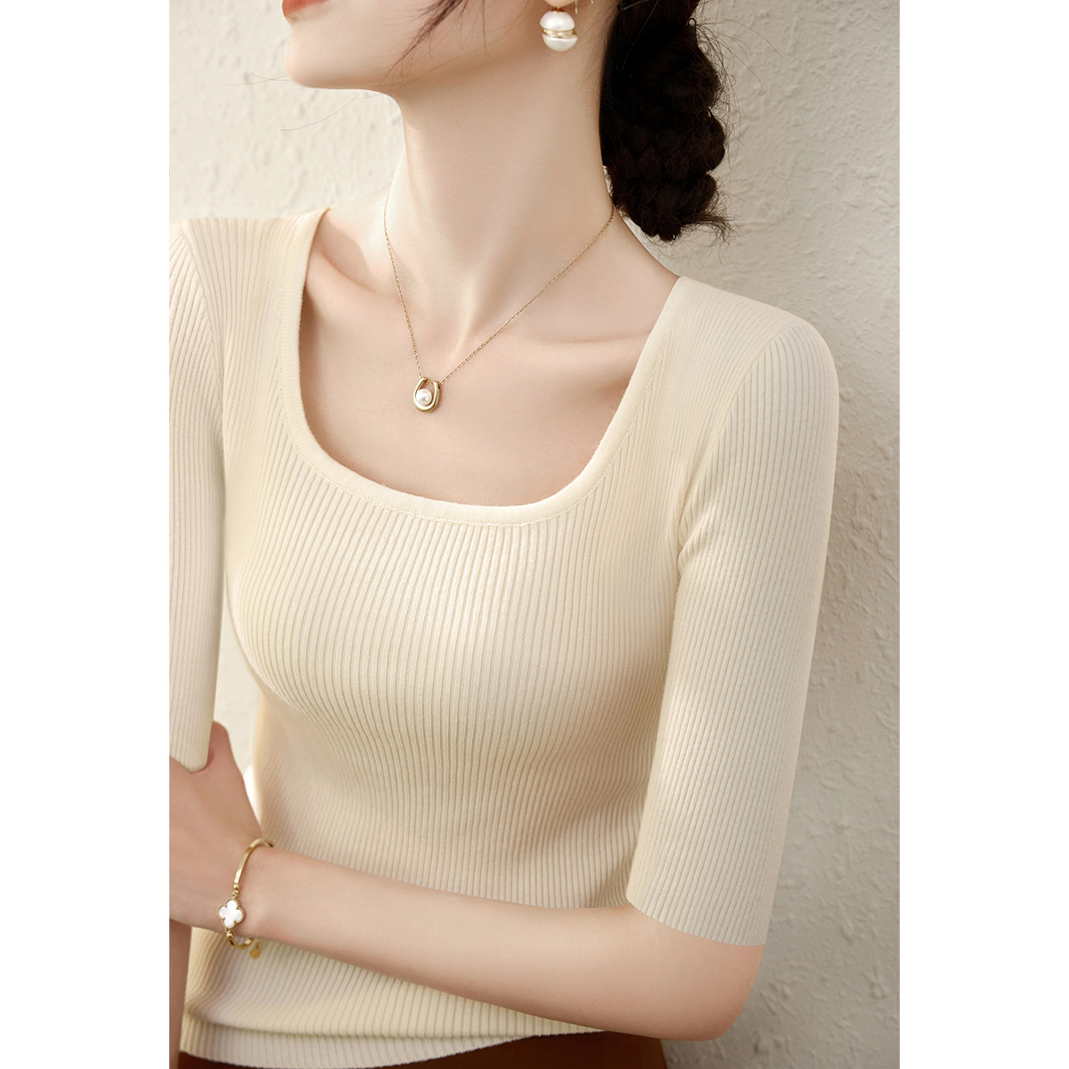앙고라 레드 슬림 핏 스웨터 여성의 새로운 가을 단색 양모 베이스 탑 반 소매 스퀘어 넥 스웨터