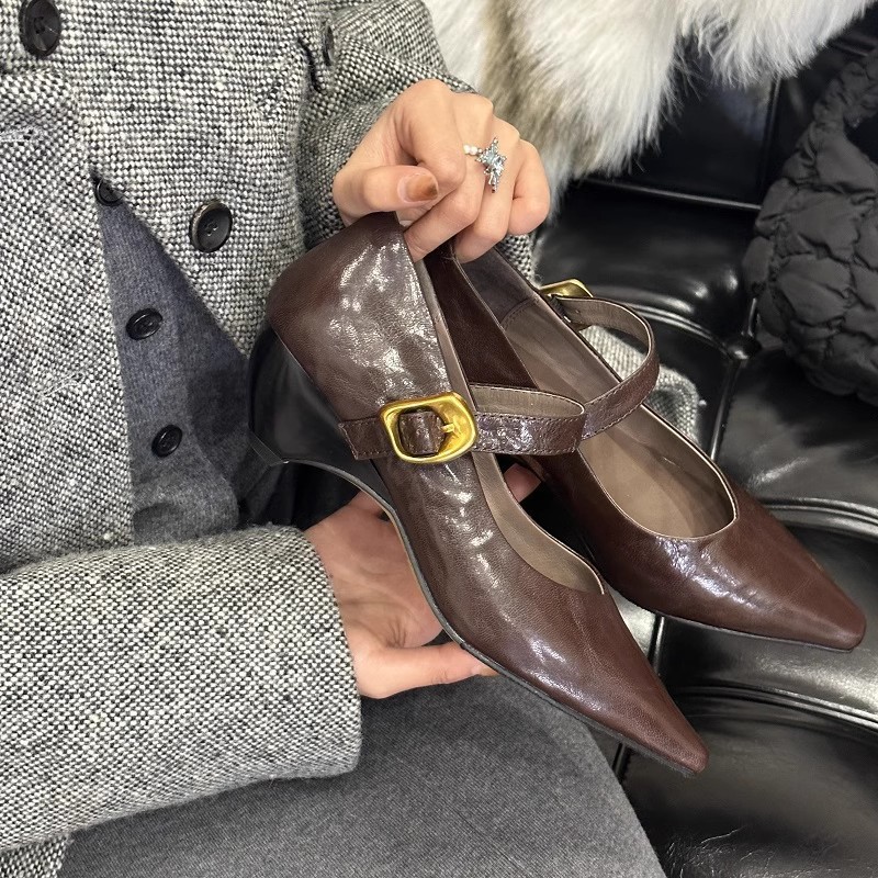 (재고 있음) 프렌치 스타일 천연 가죽 뾰족코 스트랩 웨지힐 슈즈 레트로 천연 가죽 하이힐 두꺼운 굽 메리제인