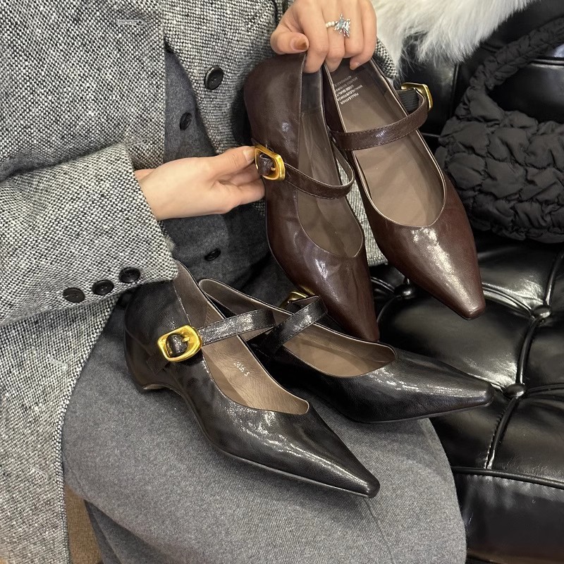 (재고 있음) 프렌치 스타일 천연 가죽 뾰족코 스트랩 웨지힐 슈즈 레트로 천연 가죽 하이힐 두꺼운 굽 메리제인스토어 가기