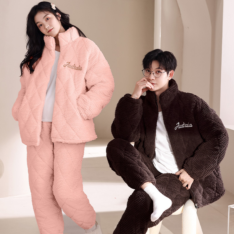 커플의 잠옷 겨울 기모 두꺼운 3 층 퀼트 카디건 세트 여성 겉옷 겨울 남자의 따뜻한 집 옷