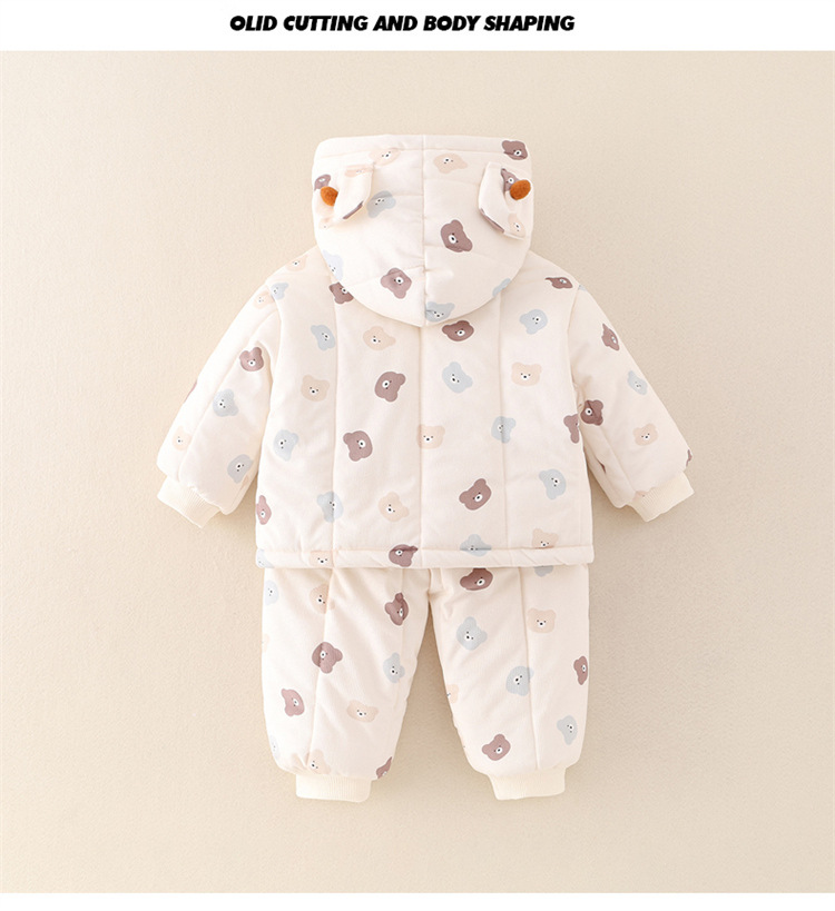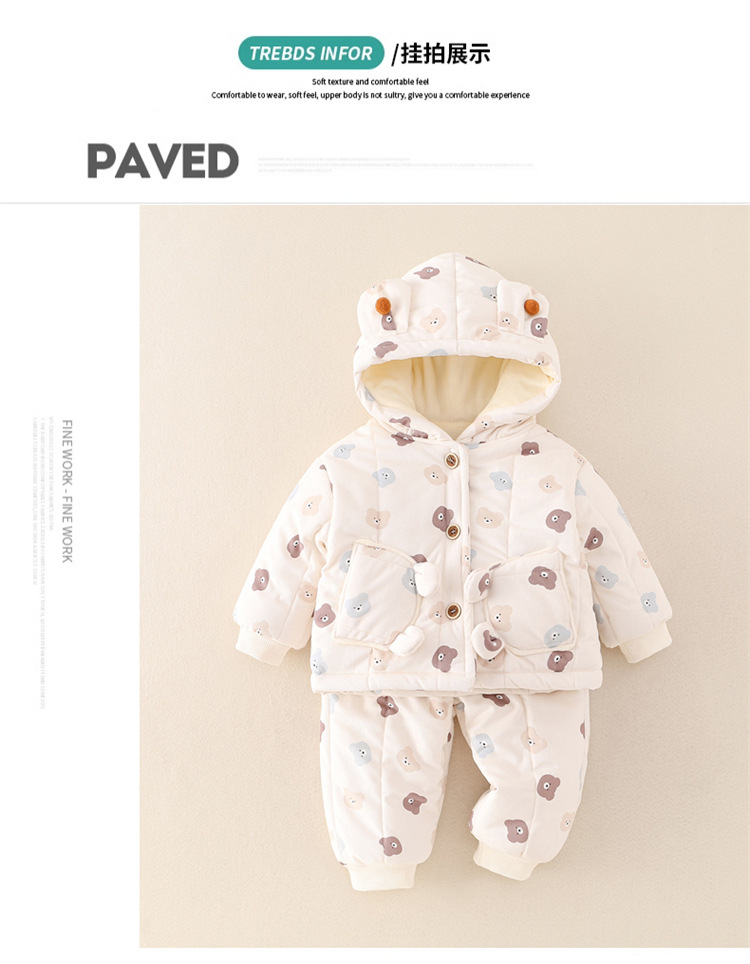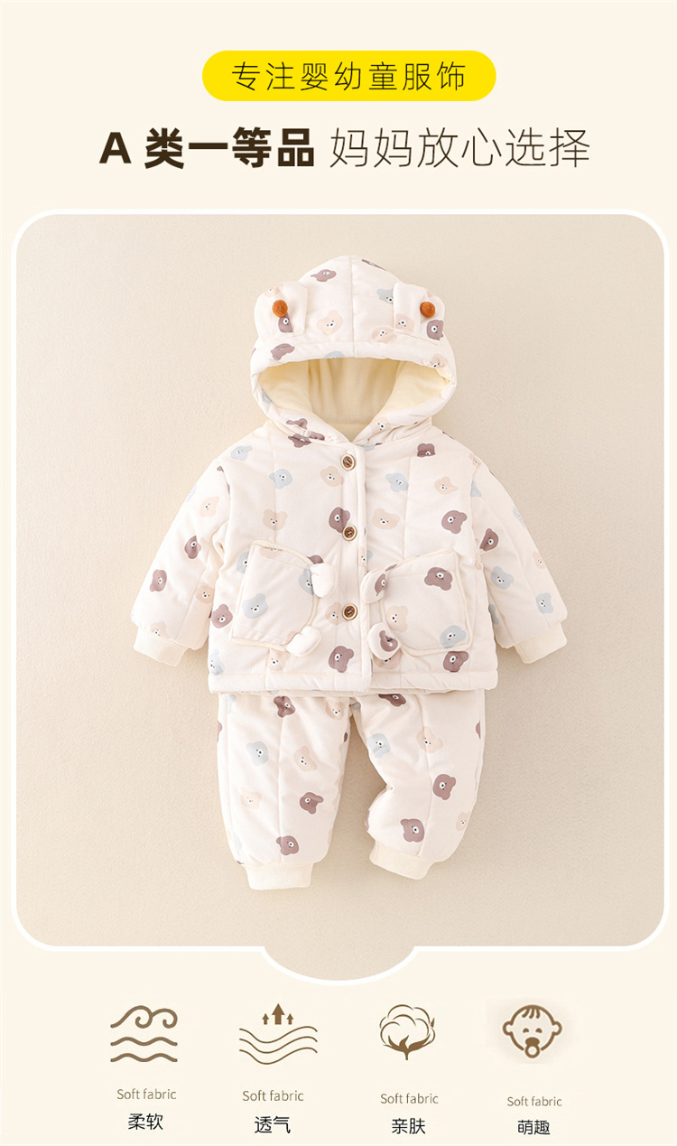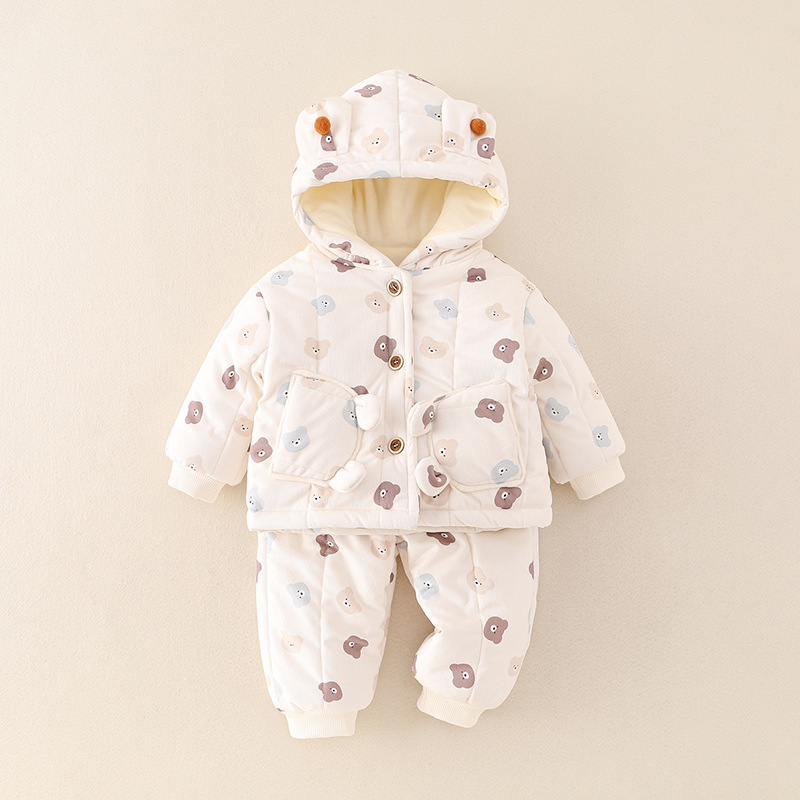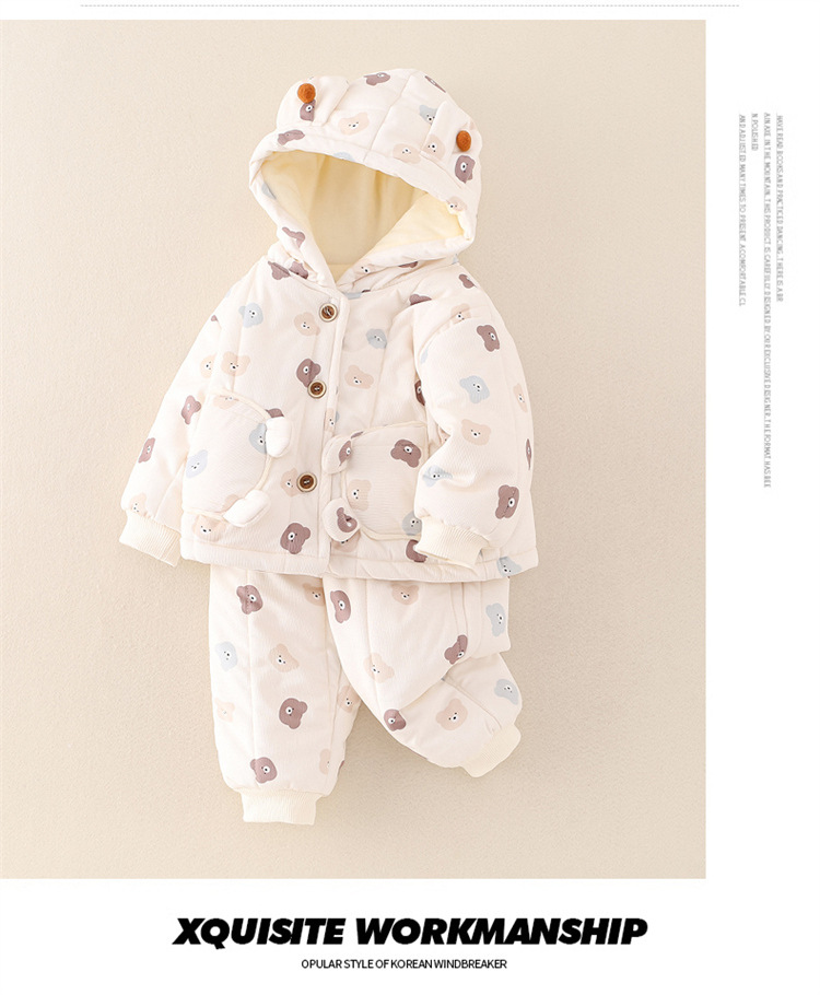 어린이 의류 겨울 아기 긴팔 후드 코튼 패딩 의류 면 패딩 바지 한 살짜리 아기 따뜻한 옷 작은 한 달 된 만화 투피스 세트스토어 가기