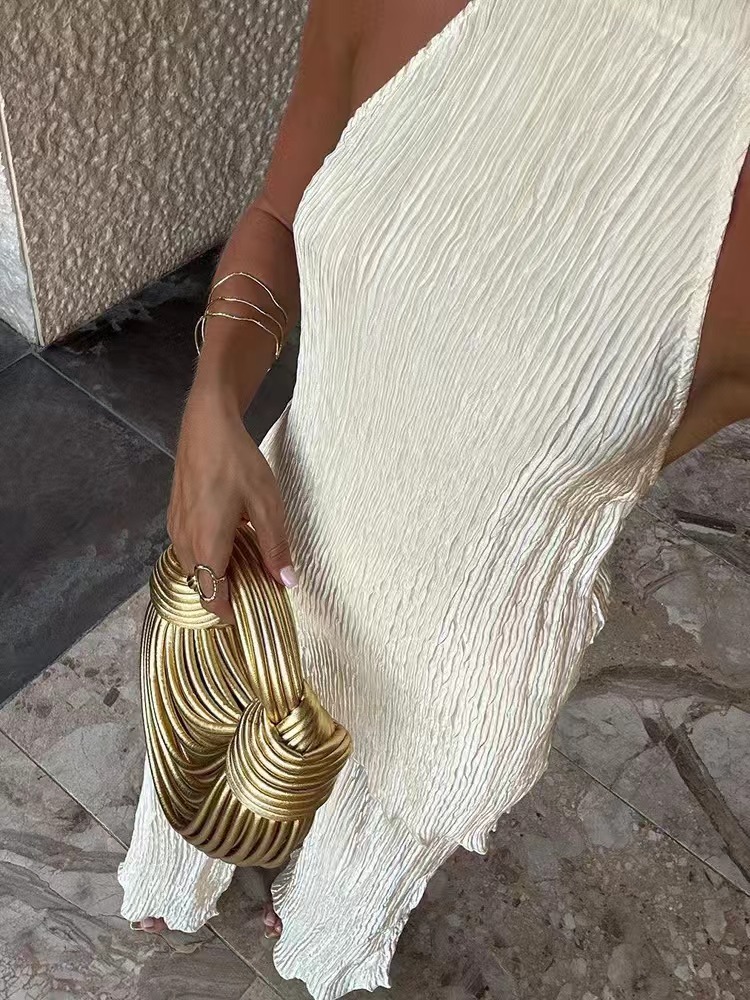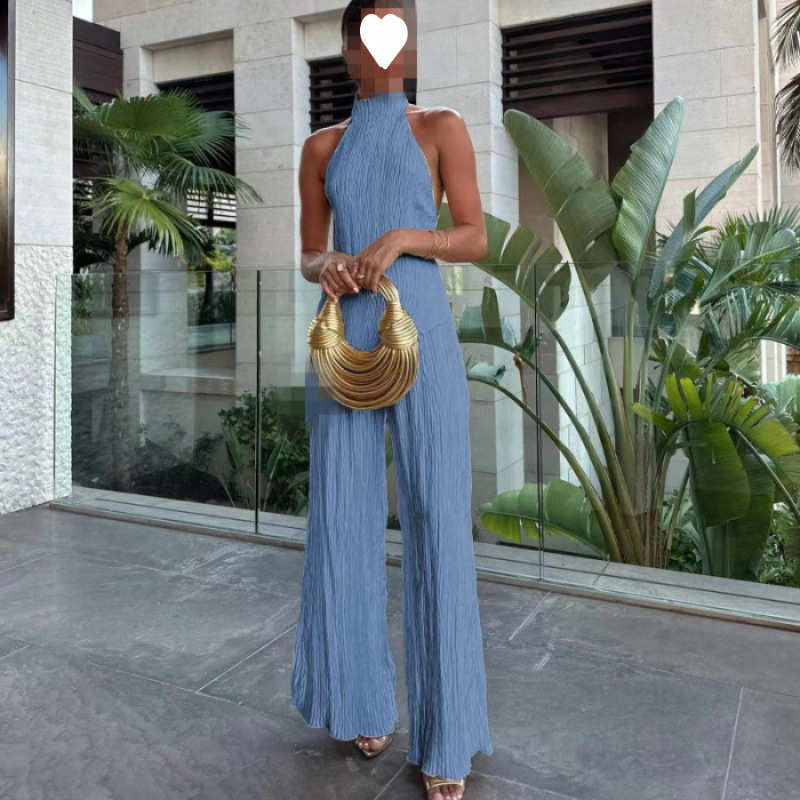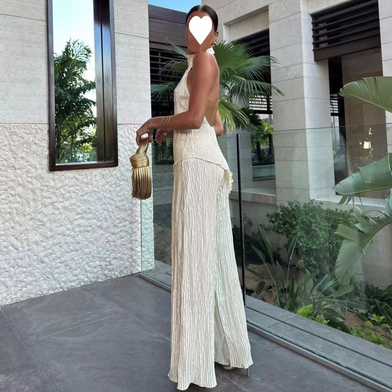 2024 여성 비대칭 목 상단 탄성 허리 캐주얼 주름 바지 세트 여성